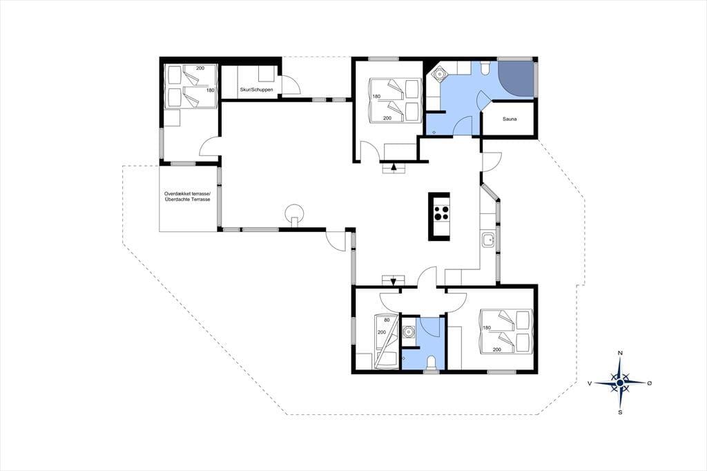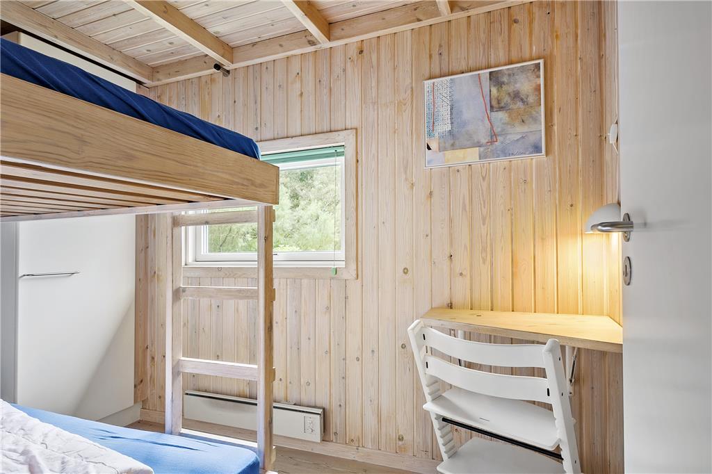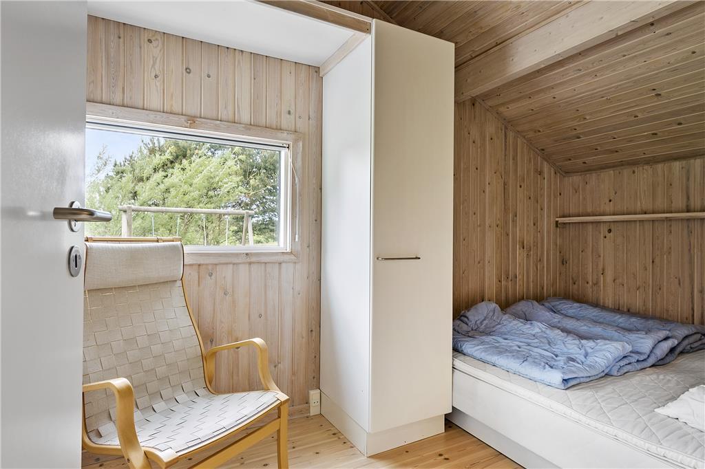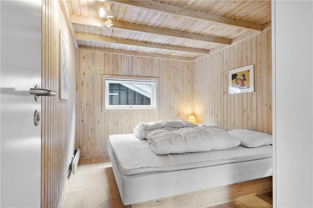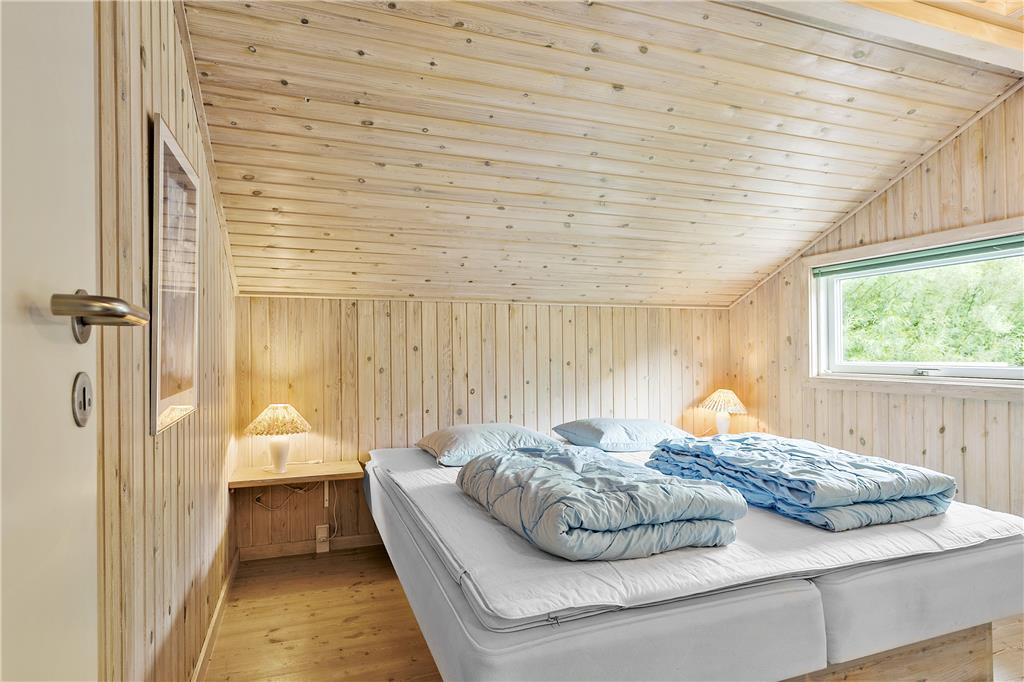 I dette rummelige og smagfuldt indrettede sommerhus er de fire soveværelser fordelt, så huset er velegnet til to vennepar såvel som to familier. Huset byder på to badeværelser, hvoraf det ene råder over spabad og sauna, og et dejligt stort køkken, som er adskilt fra spiseafdelingen ved en halvmur. Vil man nyde morgenmaden i det fri, vil terrassen udenfor køkkenet være et perfekt sted. Fra køkkenafdelingen går man ind i den bagvedliggende stue med brændeovn. Stuen er rummelig og lys, og herfra har man adgang til den flotte træterrasse med udsigt over et stort fredet naturareal.