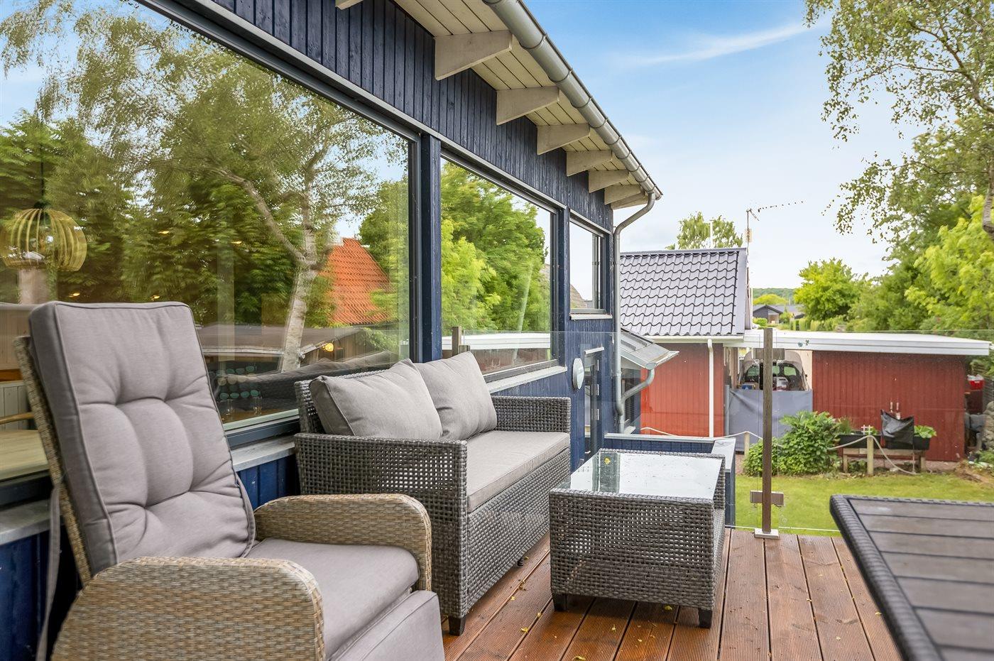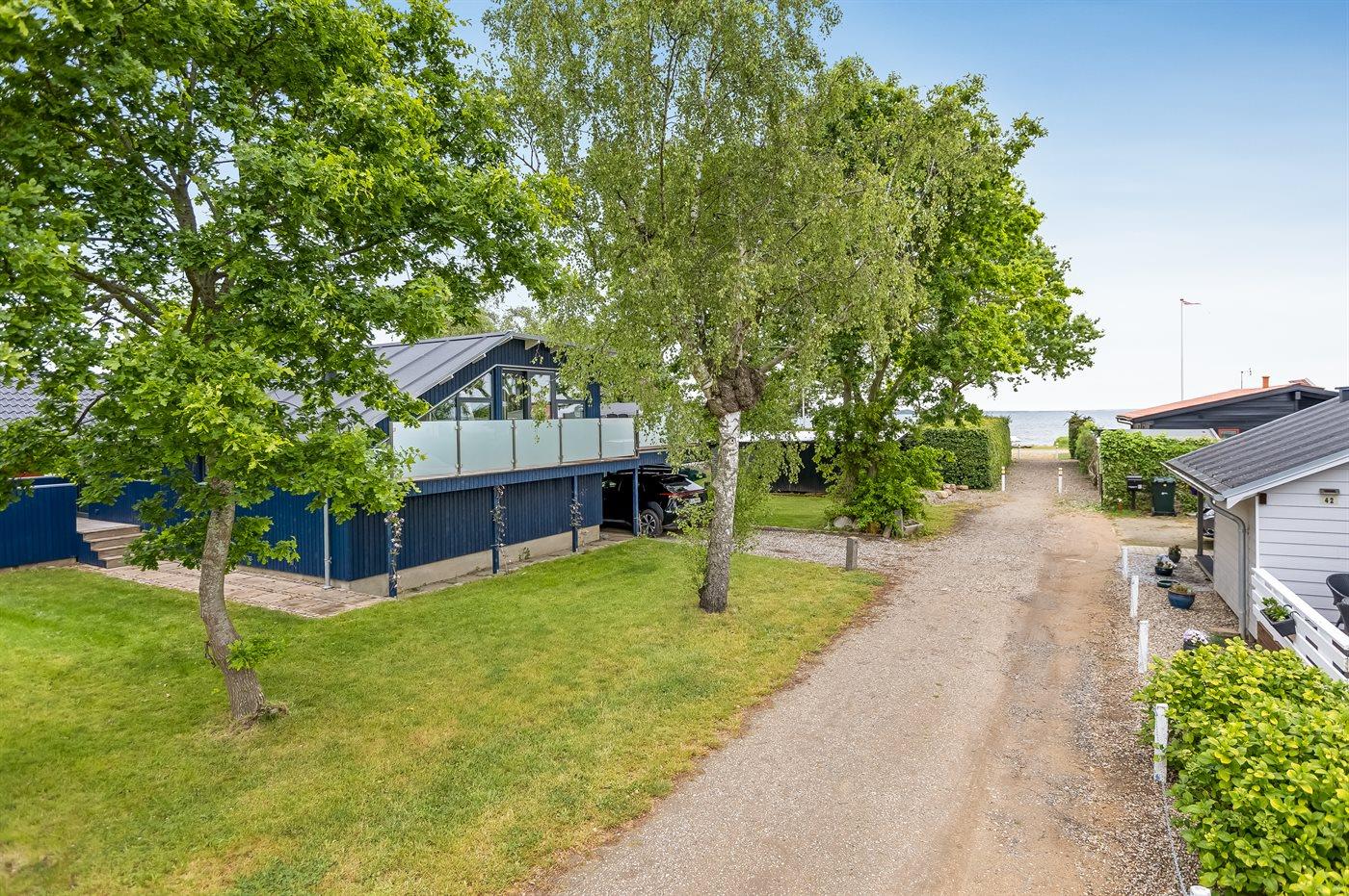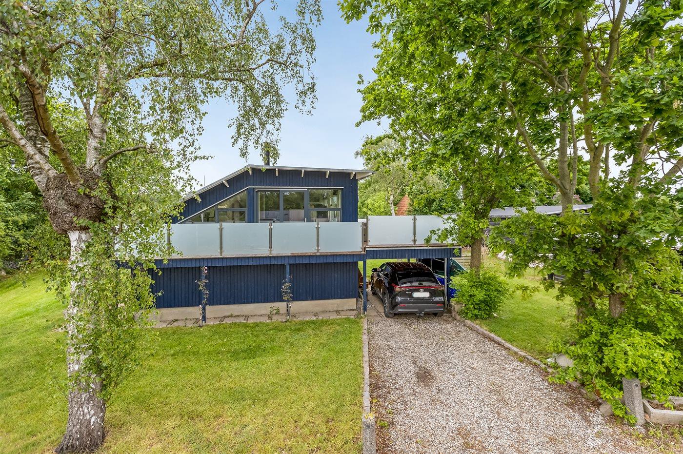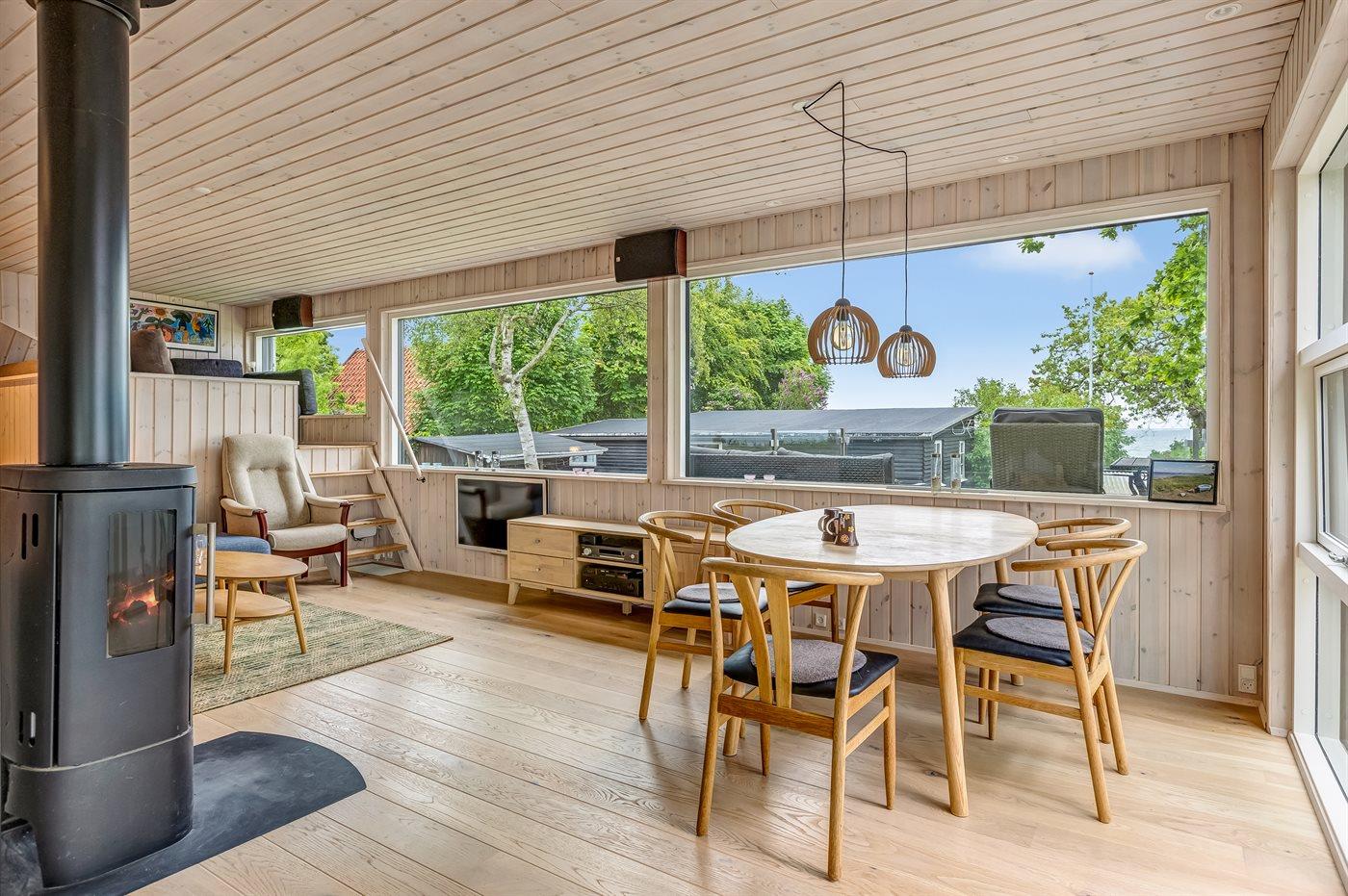 Arkitekttegnet sommerhus fra 2022 med havudsigt og lukket terrasse nær Grønninghoved strand.