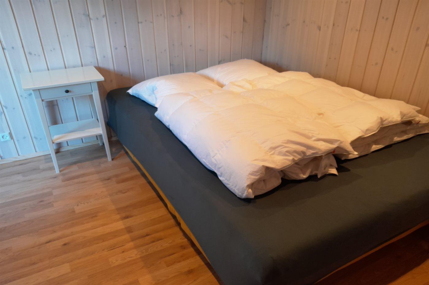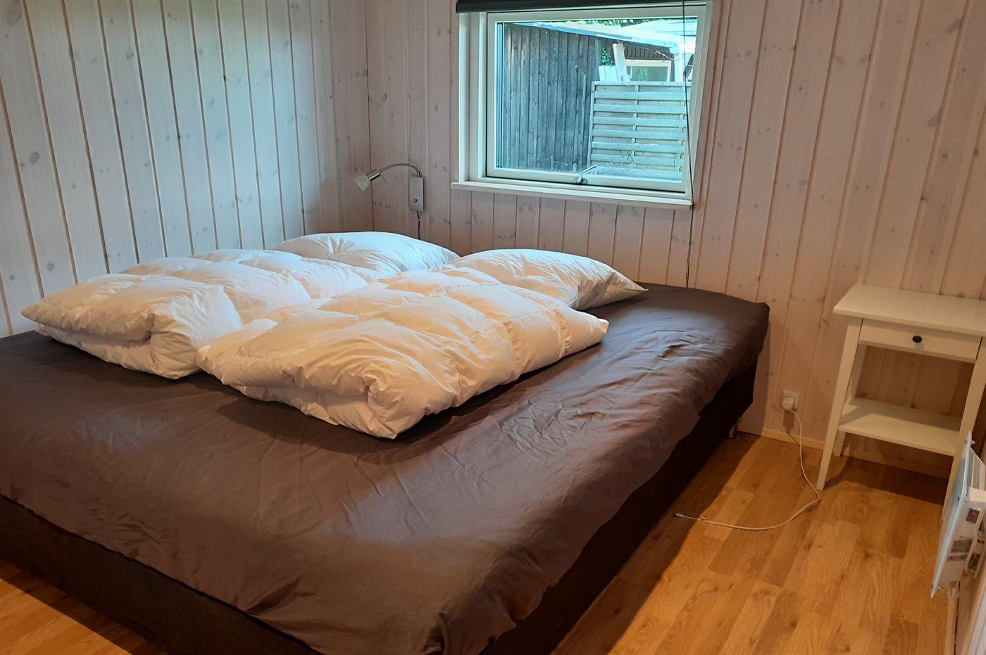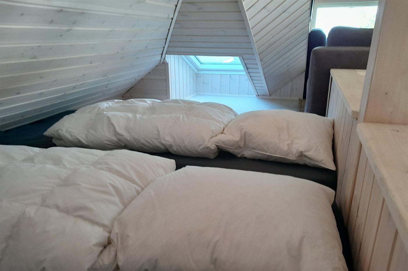 Der er i alt 2 soveværelser. Sovepladserne fordeler sig på: 4 sovepladser i dobbeltsenge. 2 sovepladser i sovesofa (enkelt). 2 af disse sovepladser befinder sig på husets hems. Derudover er der 1 stk. barneseng.