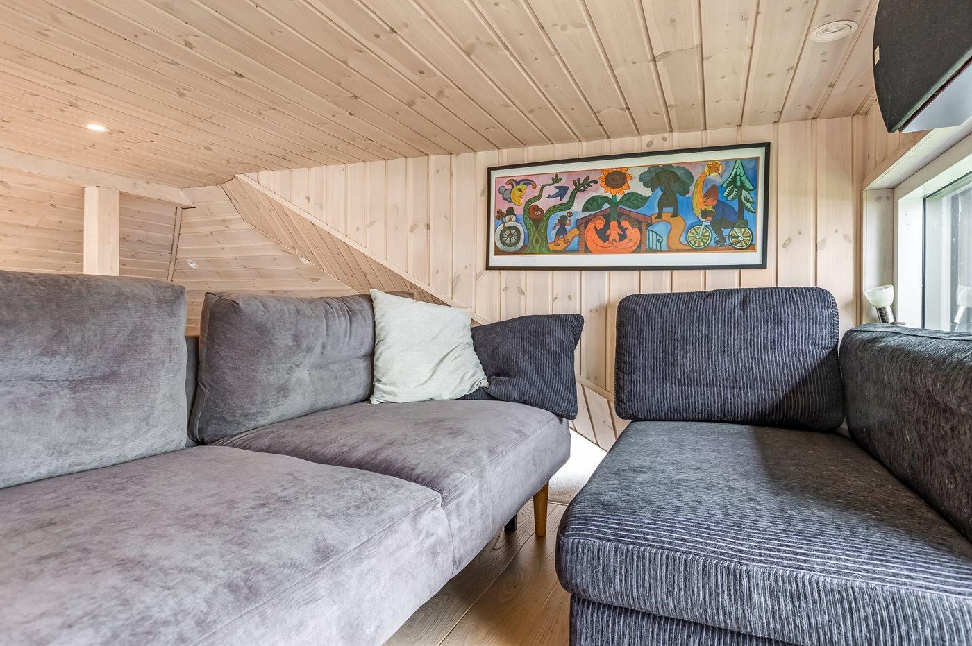 Fra køkkenet og soveværelserne leder endnu en lille trappe jer videre til et lækkert opholdsrum med spiseplads, TV-område og direkte udgang til terrassen. Huset råder desuden over to hemse: én ved opholdsrummet og én med ekstra god loftshøjde og nem adgang via en god trappe. Dermed får I i alt to soveværelser og to hemse – hver med to sovepladser, hvoraf den ene hems har opredning til to personer. Der er med andre ord god plads til både familie og gæster.