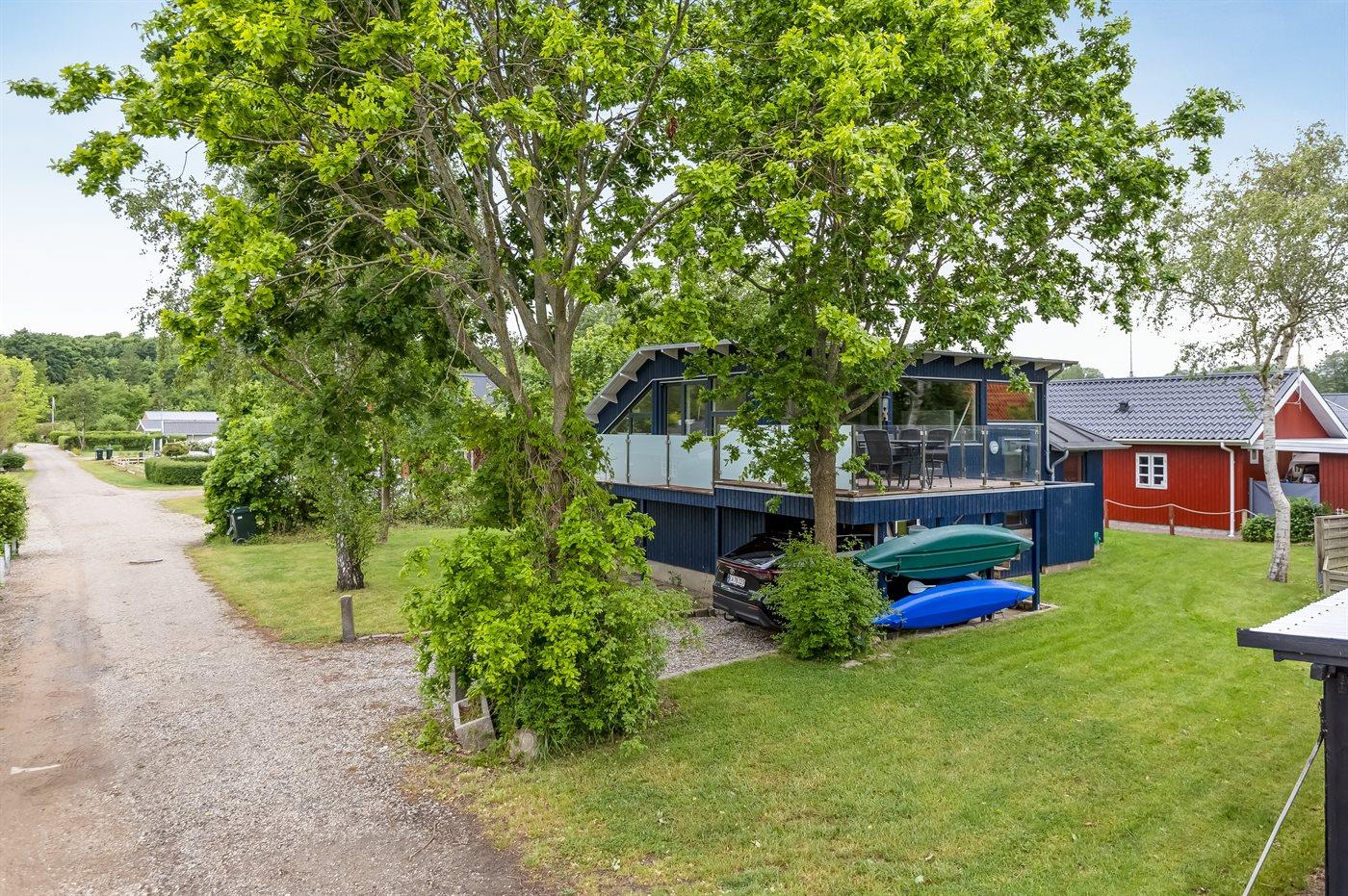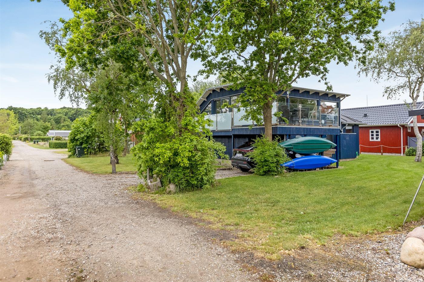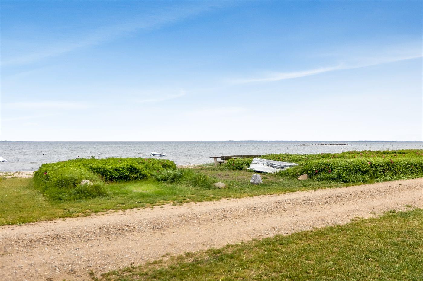 Ferieboligen er beliggende på en 543 m² stor naturgrund. Der er 50 m til havet. Der er en badebro i nærheden. Nærmeste forretning er beliggende i en afstand af 5000 m. Til ferieboligen hører åbent terrasseareal. Der ligger en legeplads i en afstand af 500 m. Grill til rådighed. Der er carport til rådighed. Der er installeret stik til opladning af elbil. Type 2 stik. Med 11 kW ladeeffekt. Parkering ved ferieboligen.