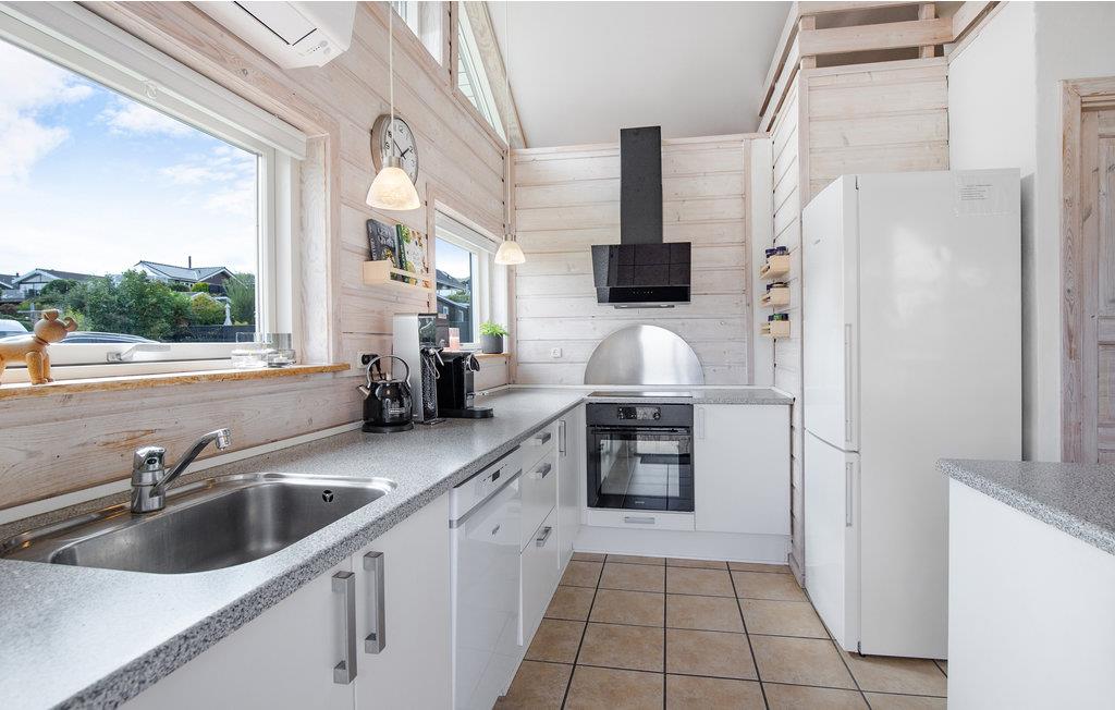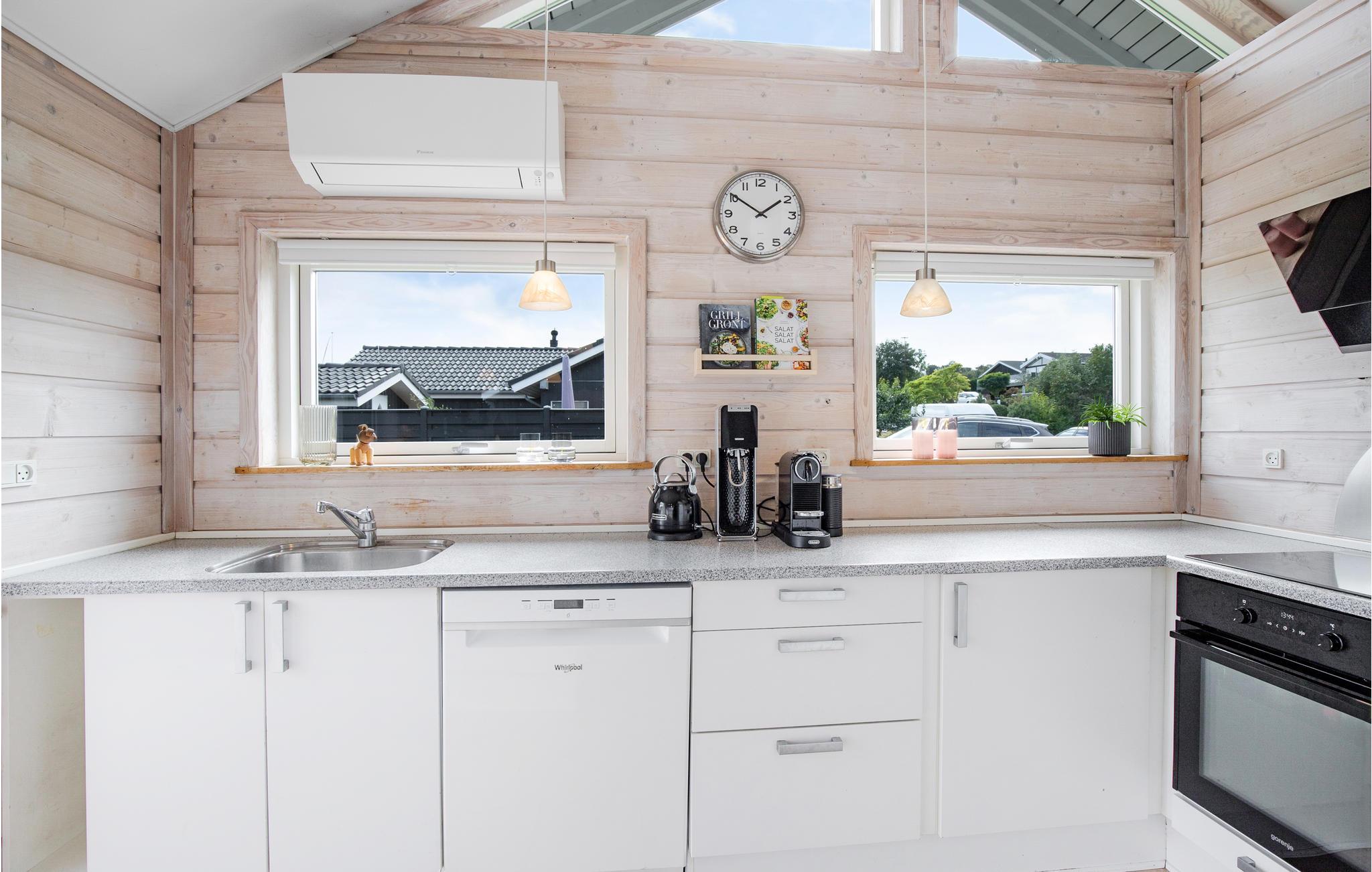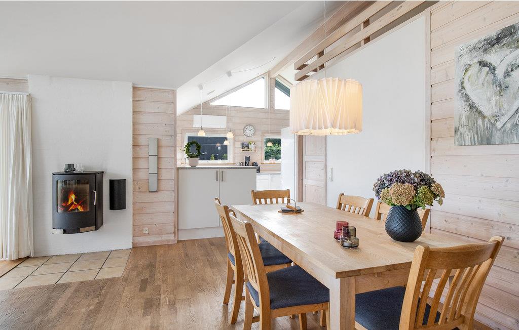 Dette lækre sommerhus fra 2005 er placeret i det naturskønne Grønninghoved. Selve huset er indrettet i lys skandinavisk stil. Husets loft går i kip fra flere sider, hvilket giver nogle smukke vinkler på loftet og et fantasktisk lysindfald fra de store panoramavinduer i stuen. Stue og køkken går ud i et, dog adskilt af en halvmur - stuen er udstyret med en brændeovn, som altid indbyder til hygge, uanset vejret. Gennem de store vinduespartier i stuen har I et smukt kig ud over vandet. Huset indeholder endvidere tre soveværelser og to badeværelser, hvoraf det ene er med spa og adgang til sauna. Til huset hører en stor terrasse, hvorfra I har kig ud over vandet. Haven er anlagt med græs og her er masser af plads til udeliv.