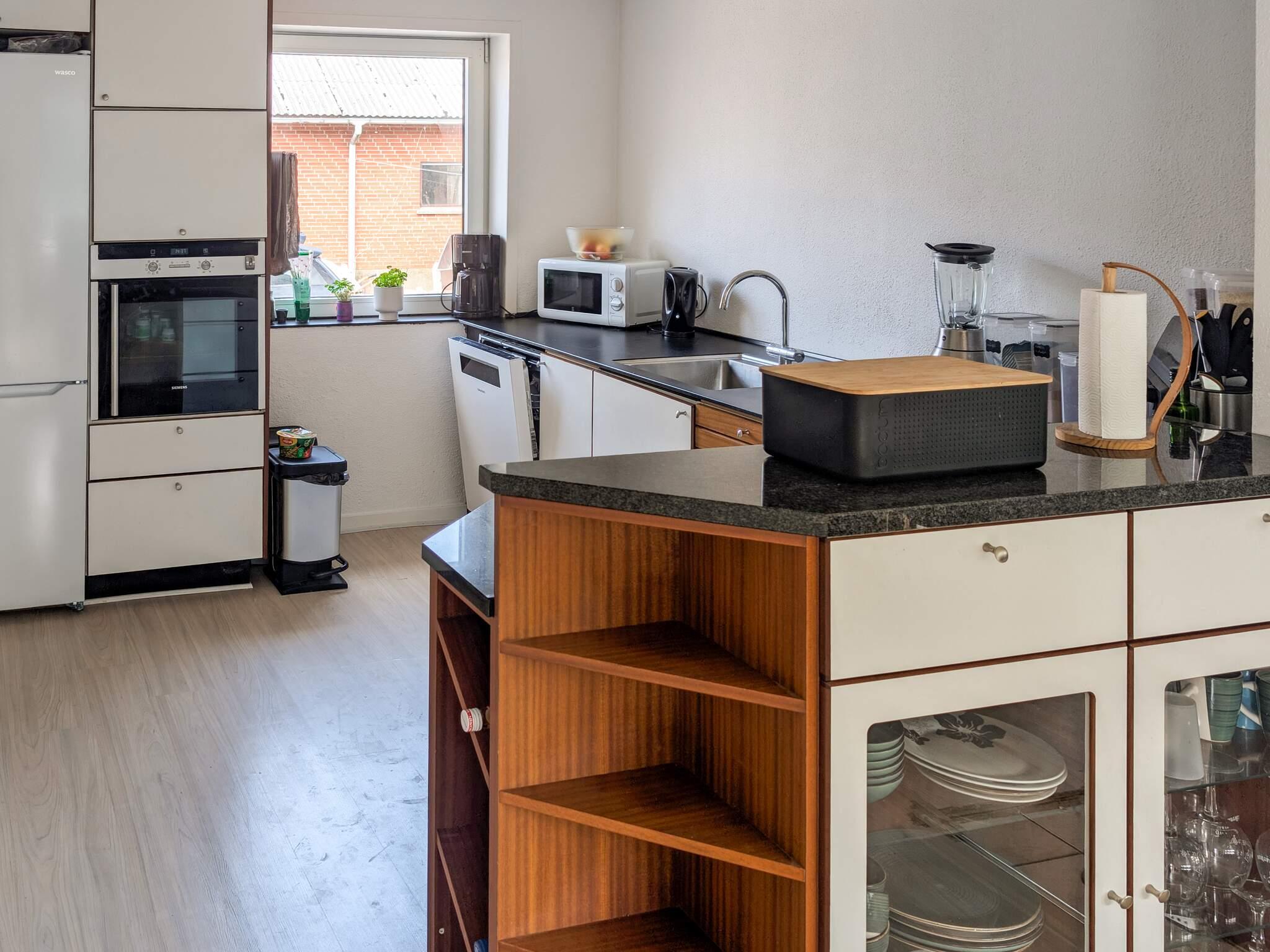 Køkken: El-komfur, køle-frys, mikroovn, kaffemaskine, opvaskemask.
