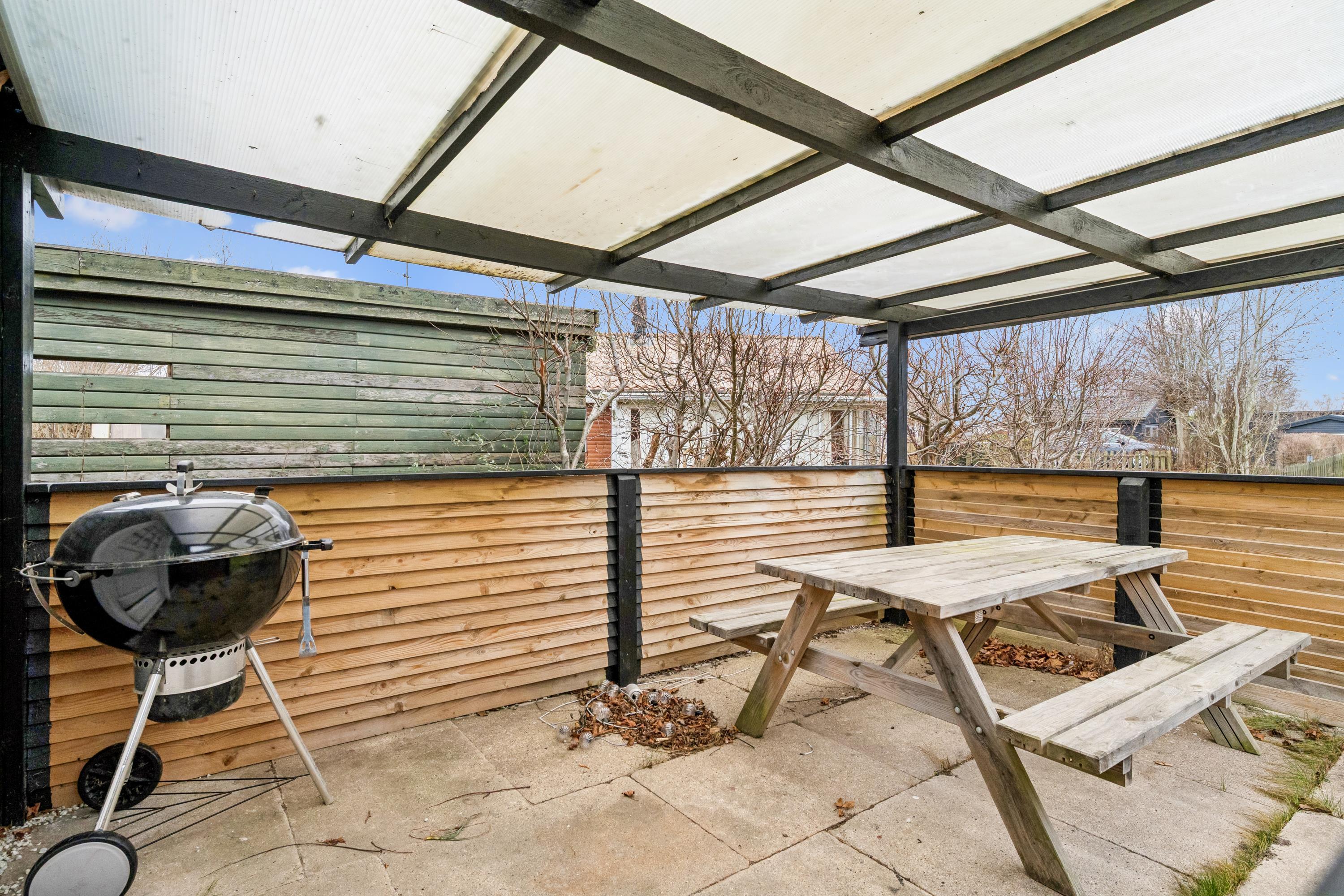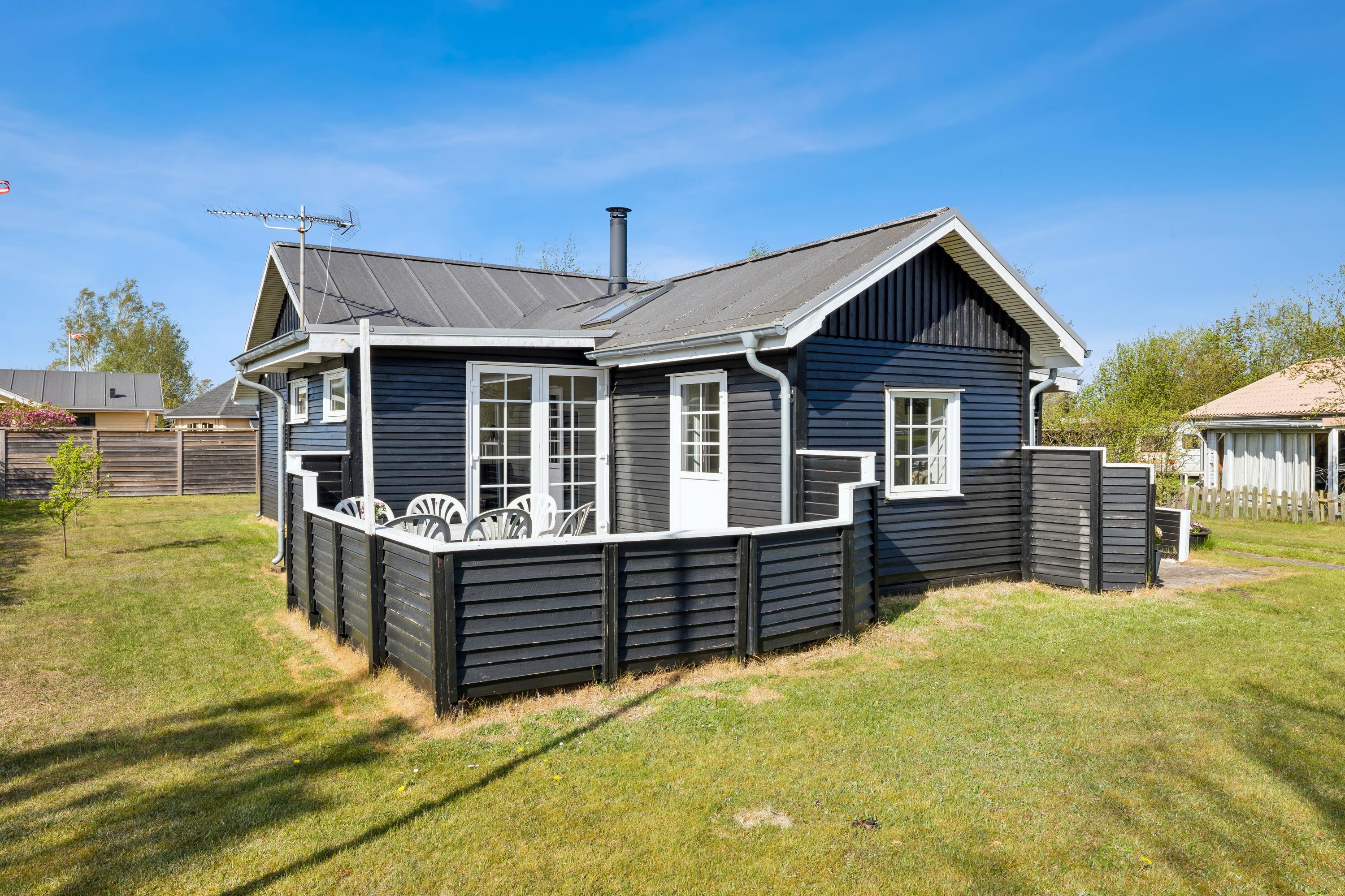 Hyggeligt feriehus nær Grenå strand med brændeovn, terrasse og stor have i roligt område.