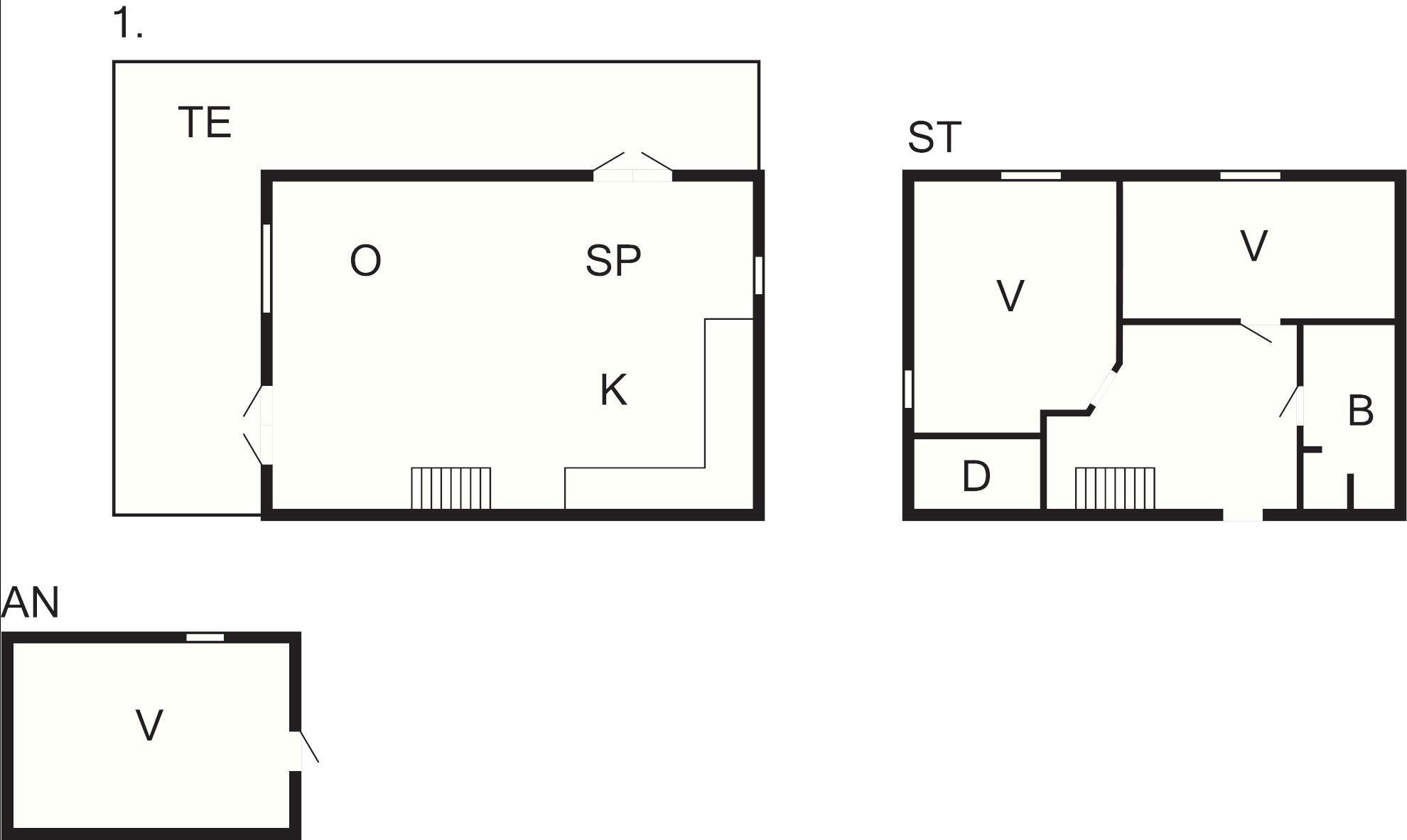 - 1. sal: Åbent køkken og stue med to udgange til enkel træterrasse mod syd og vest, hvor I kan nyde udelivet.