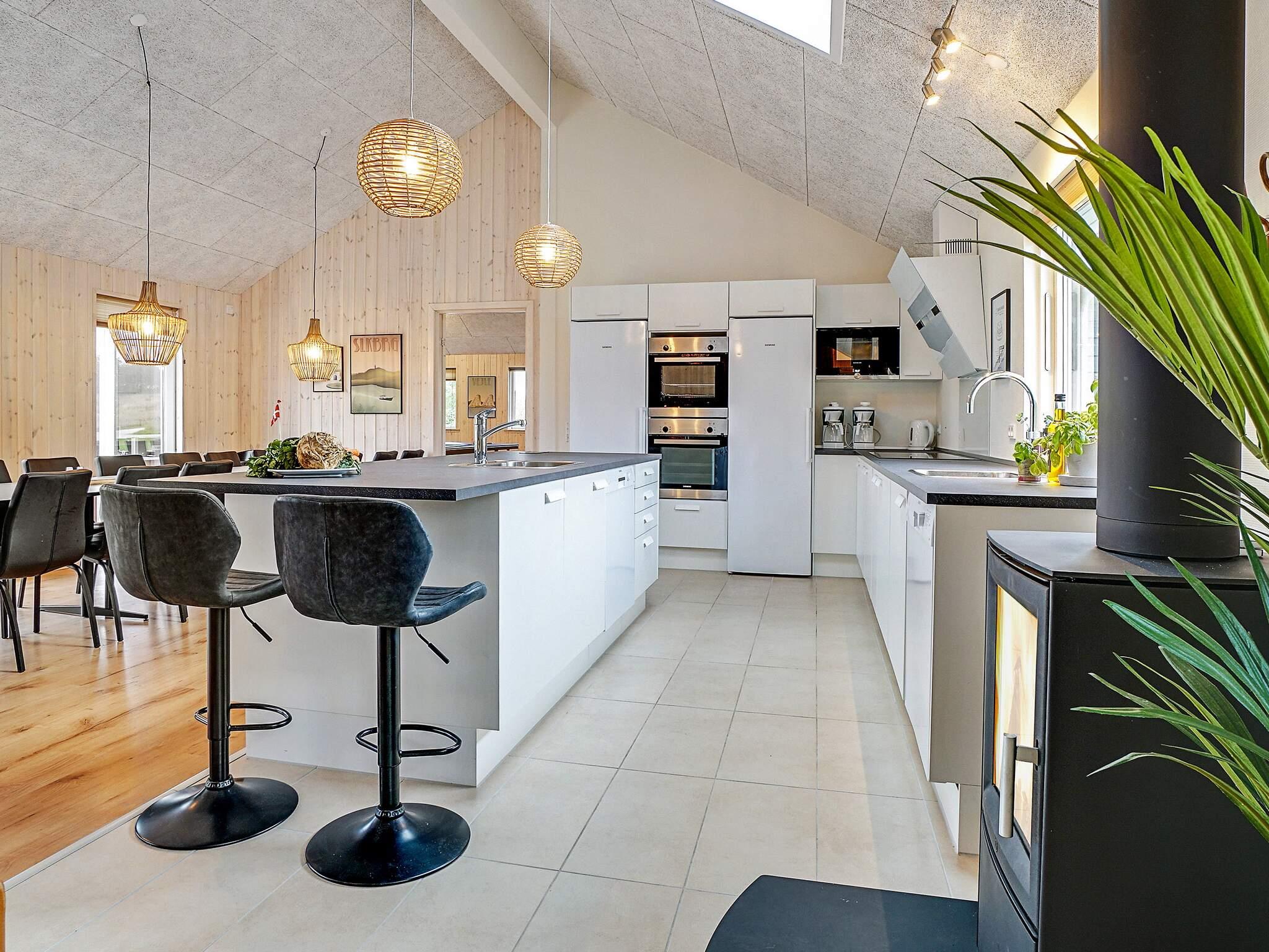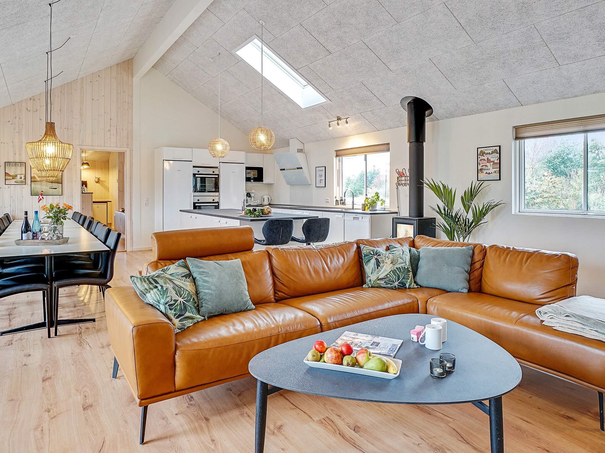 Spise/opholdsrum er smagfuldt indrettet med stereoanlæg med cd-afspiller, fladskærms-tv, chromecast, dvd-afspiller, høj barnestol, sofaafdeling og brændeovn. Den knitrende ild fra brændeovnen kan nydes indendørs til samvær. Husets otte soveværelser har gode boksmadrasser, og derudover er der en stor og rummelig sovehems samt en aktivitets/legehems.