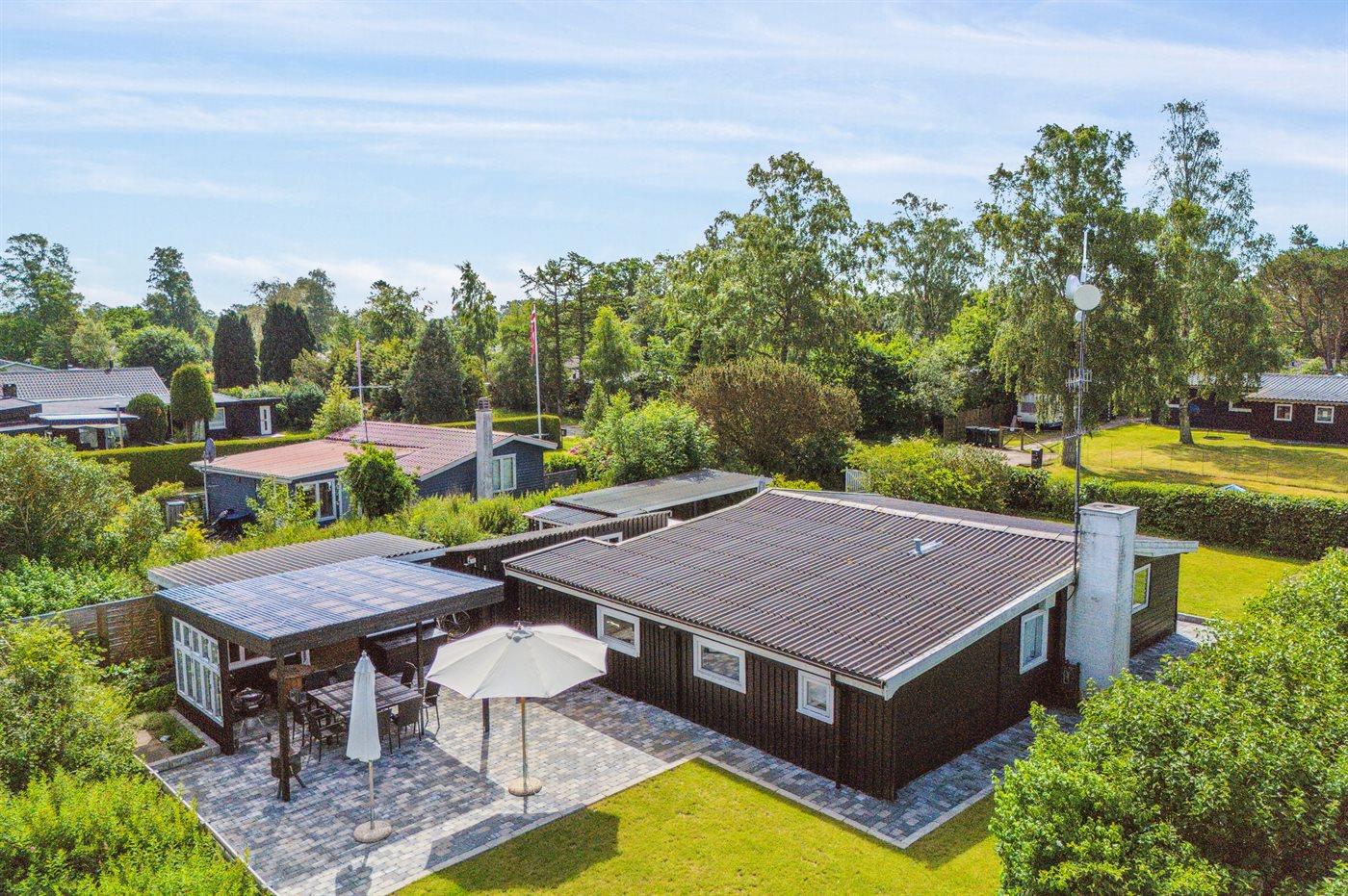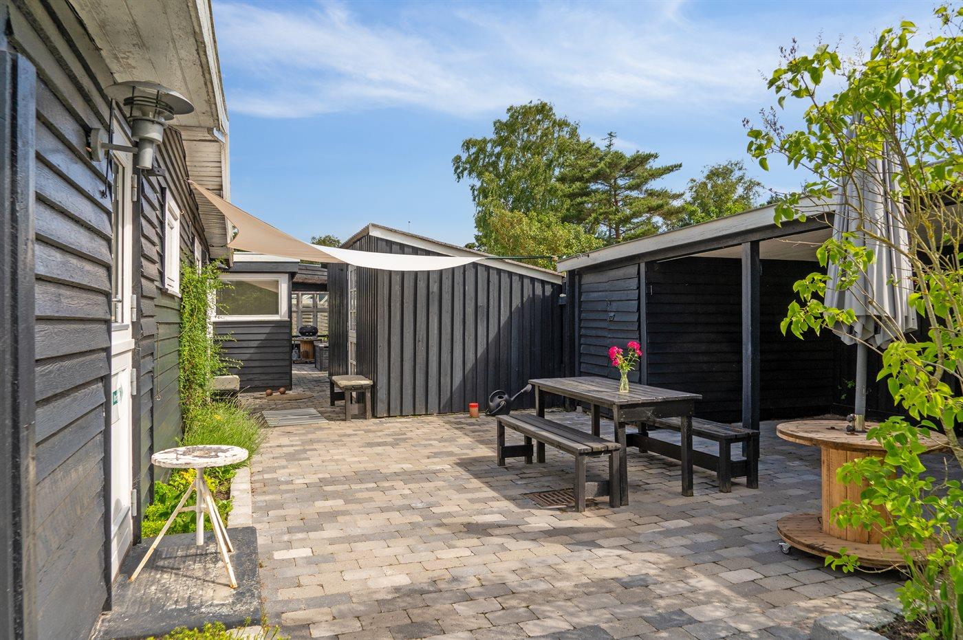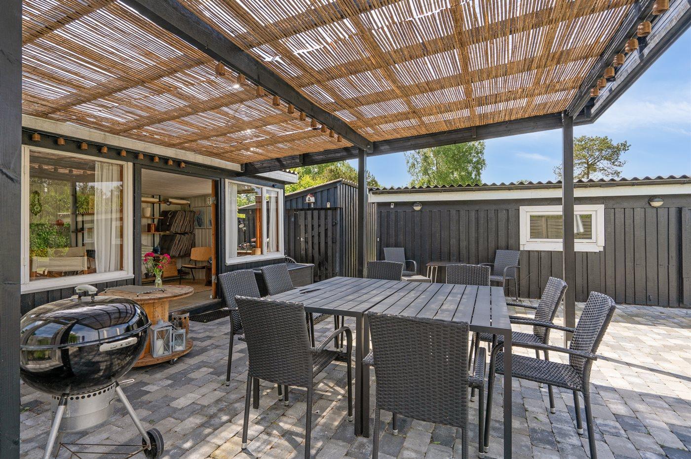 Sommerhuset ligger helt ugeneret på den dejlige grund og har nogle gode terrassearealer, som også delvist er overdækket. Herfra kan man i særdeleshed nyde de skønne omgivelser med en kop kaffe eller et glas vin, og det er altid muligt at finde en lækrog at nyde solen i.