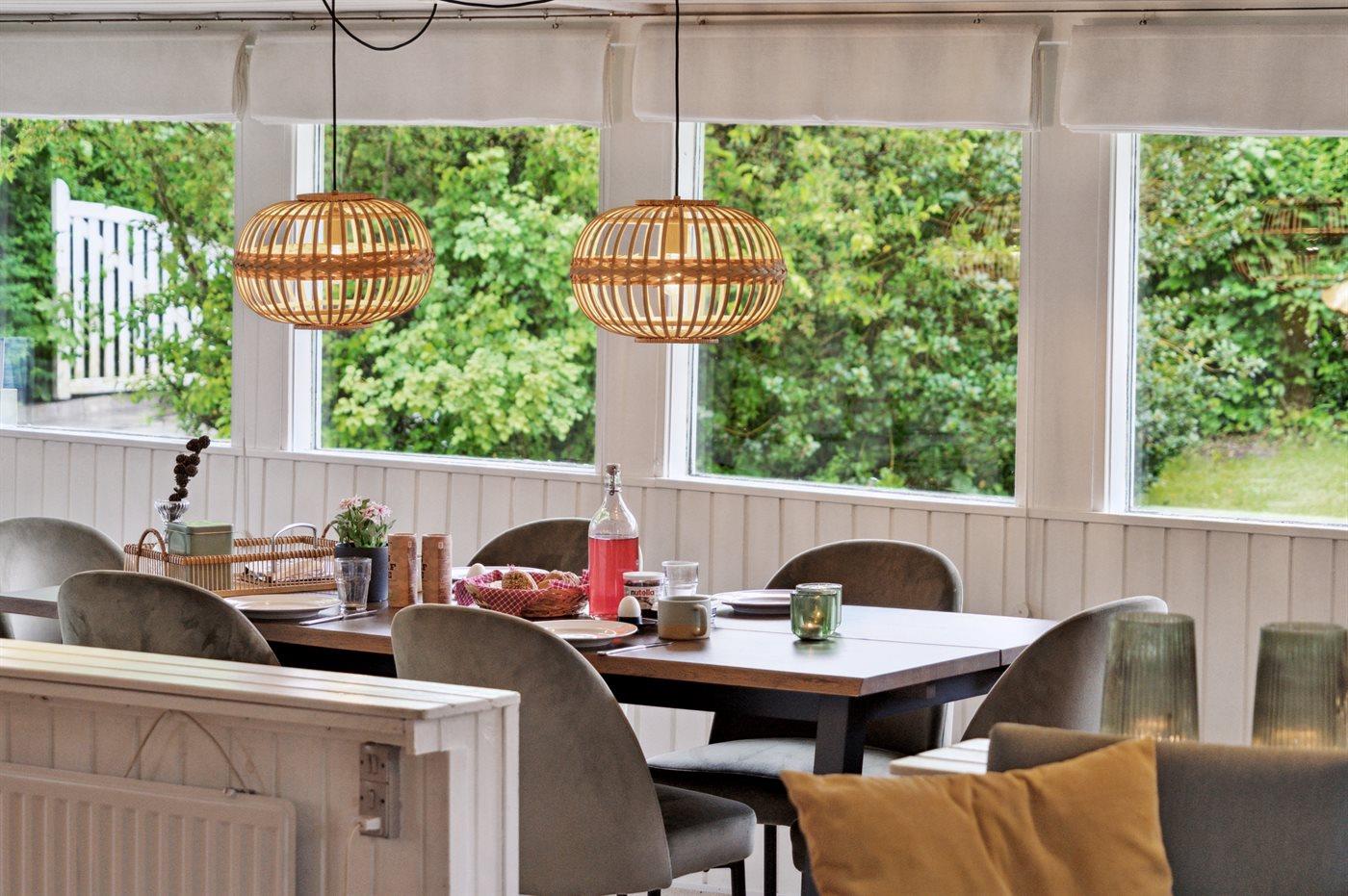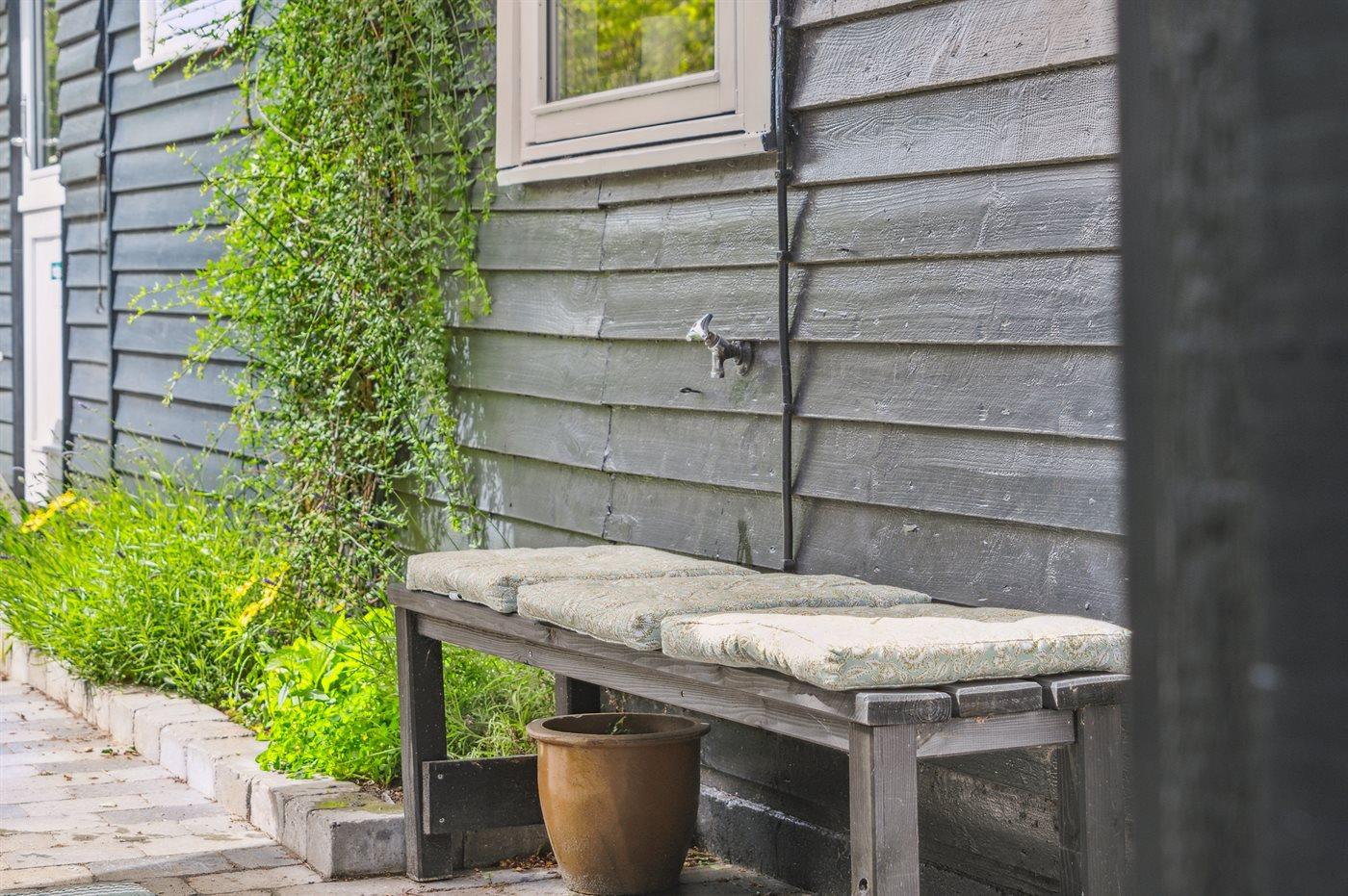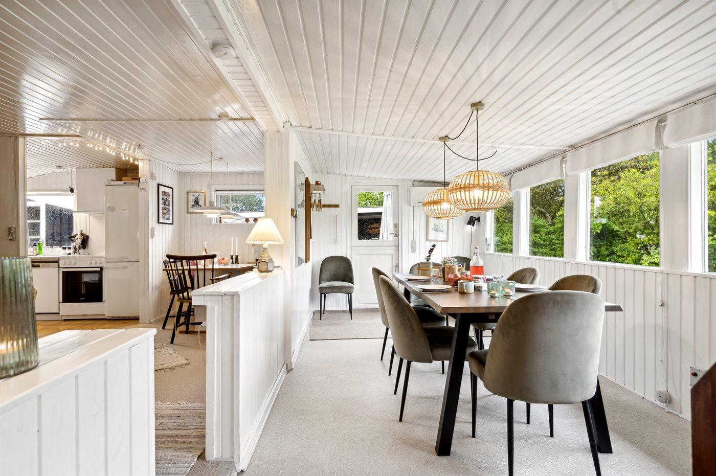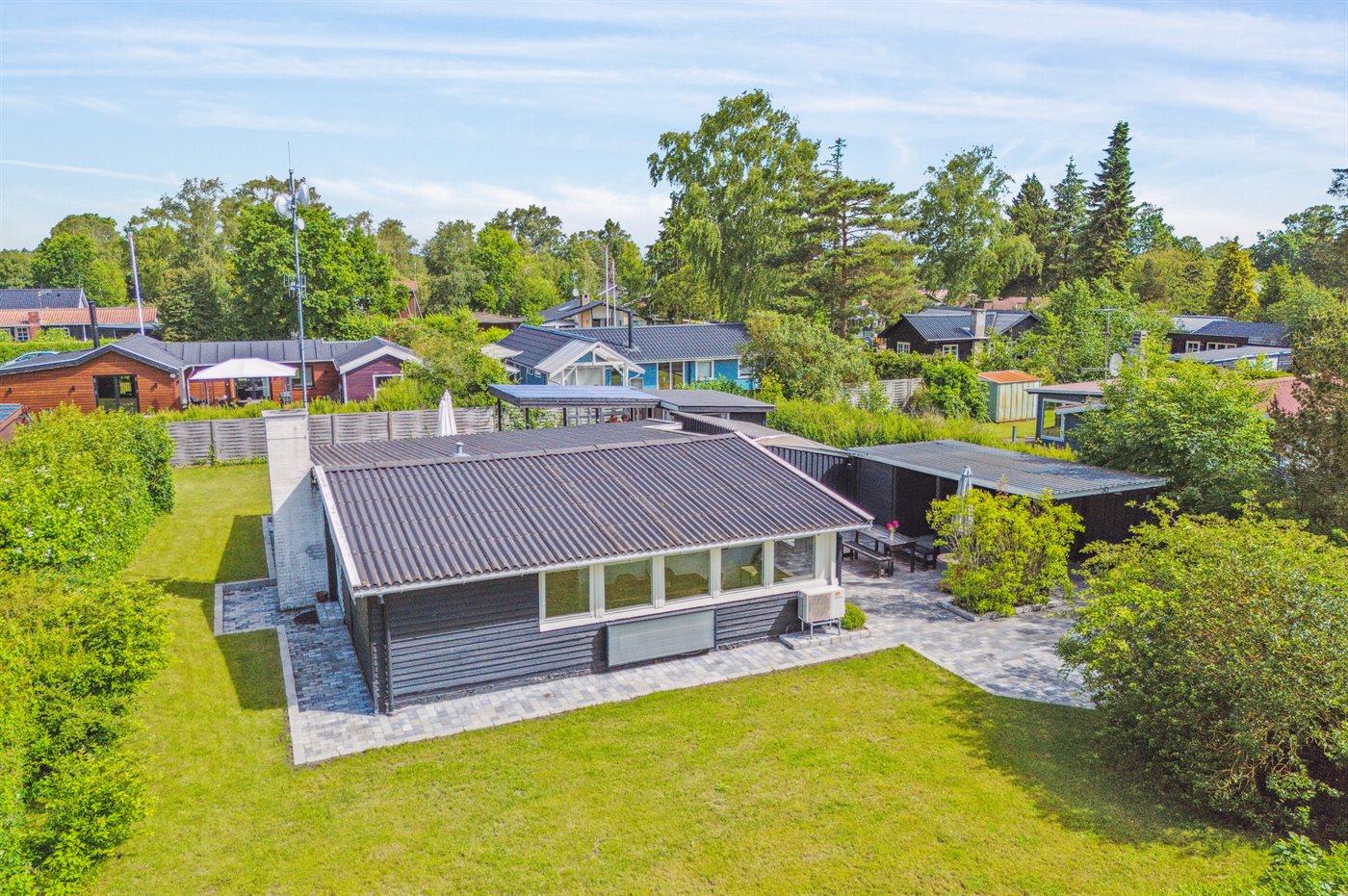 Sommerhuset ligger helt ugeneret på den dejlige grund og har nogle gode terrassearealer, som også delvist er overdækket. Herfra kan man i særdeleshed nyde de skønne omgivelser med en kop kaffe eller et glas vin, og det er altid muligt at finde en lækrog at nyde solen i.