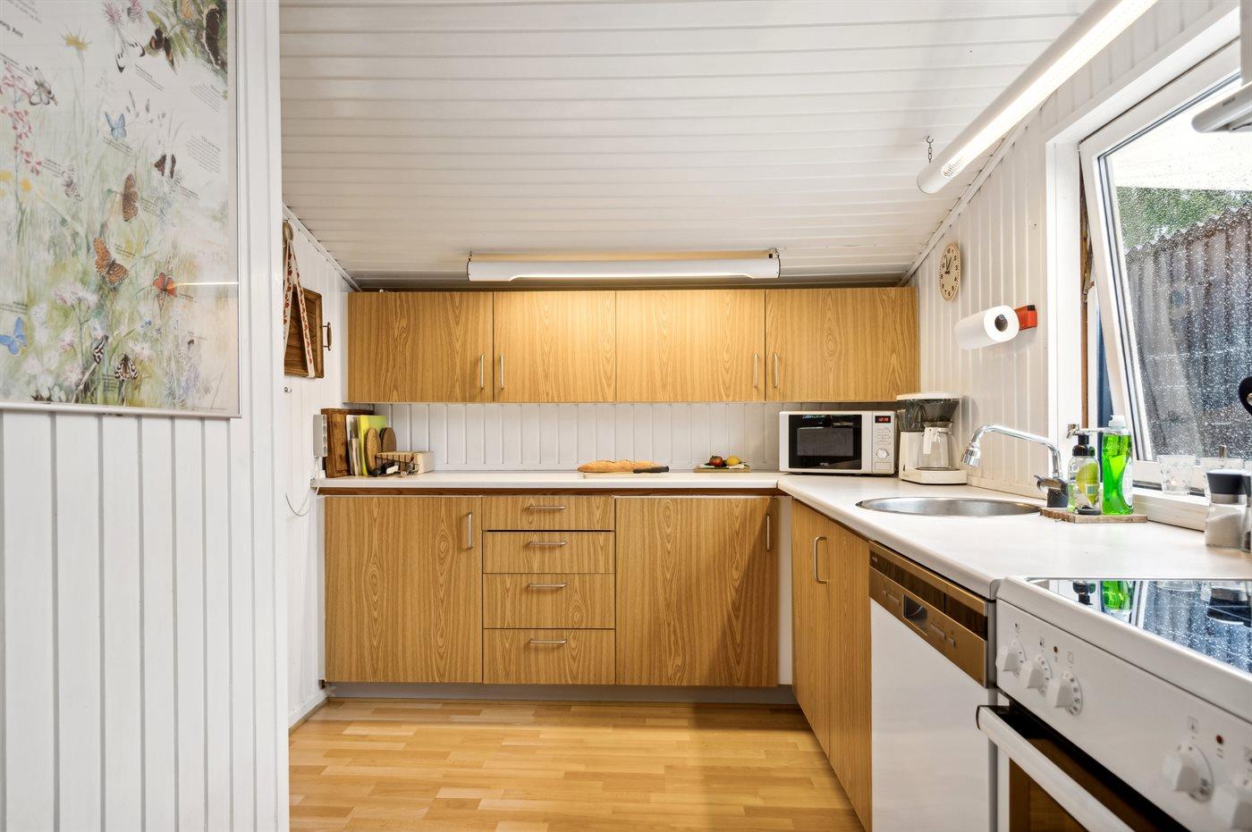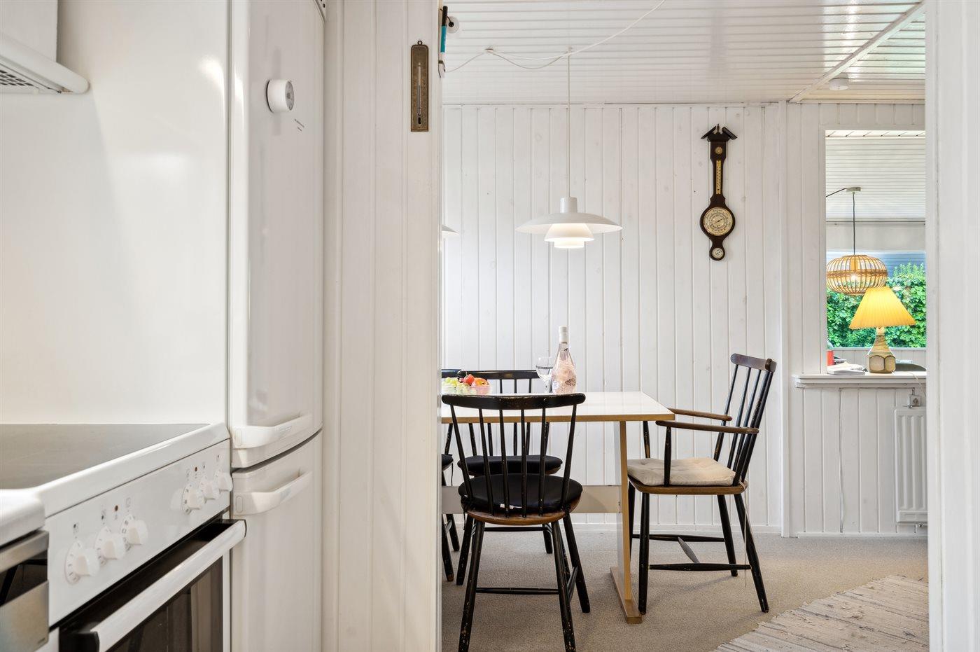 Køkkenet er udstyret med 1 køleskab. Der er 4 keramiske kogeplader, varmluftovn, mikrobølgeovn samt opvaskemaskine.