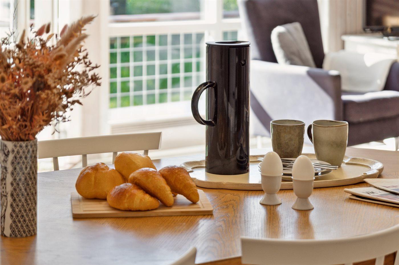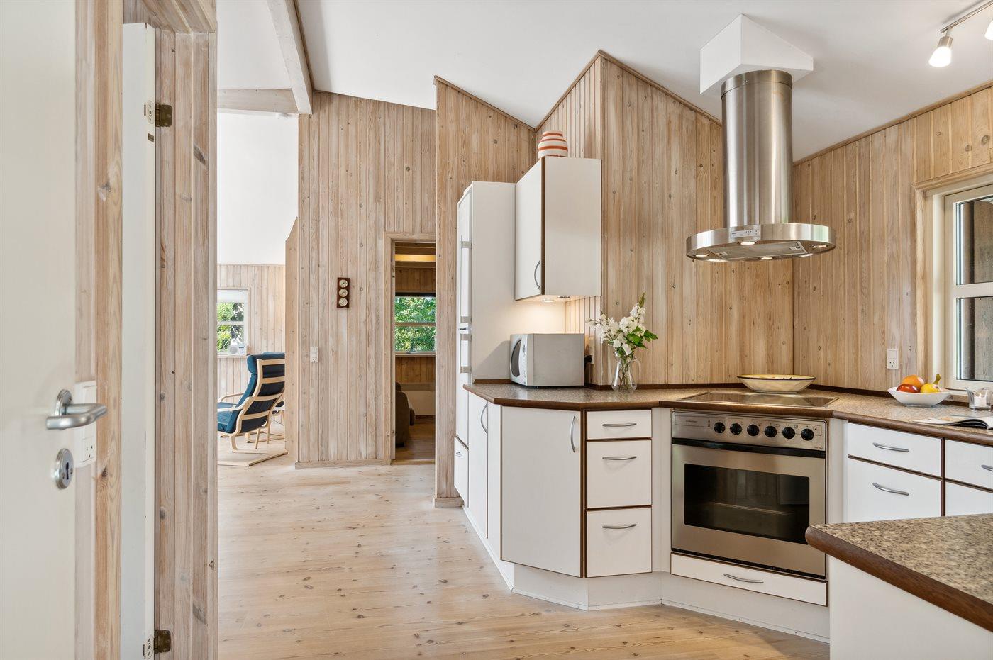 Køkkenet er udstyret med 1 køleskab. Der er 4 keramiske kogeplader, varmluftovn, mikrobølgeovn samt opvaskemaskine.