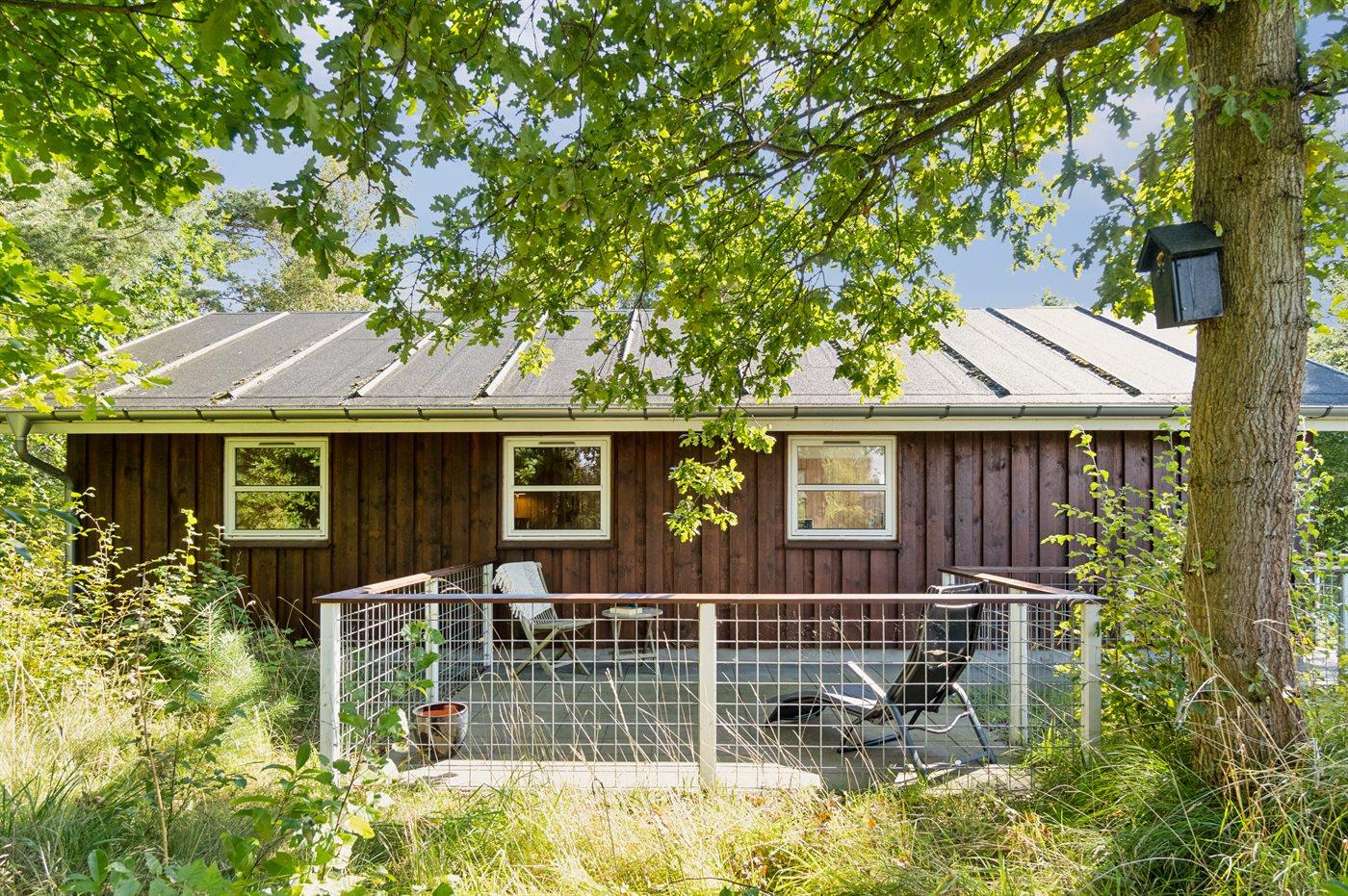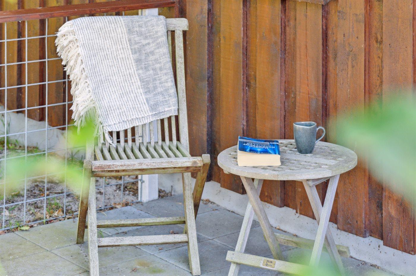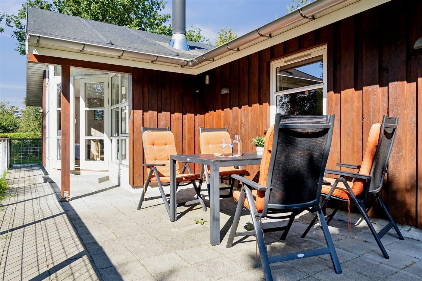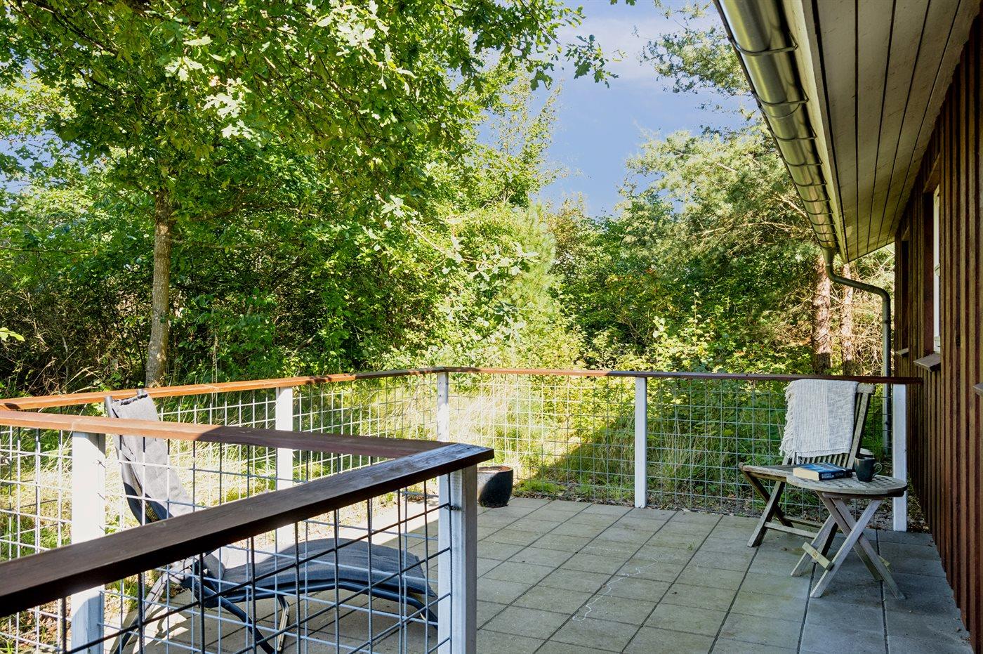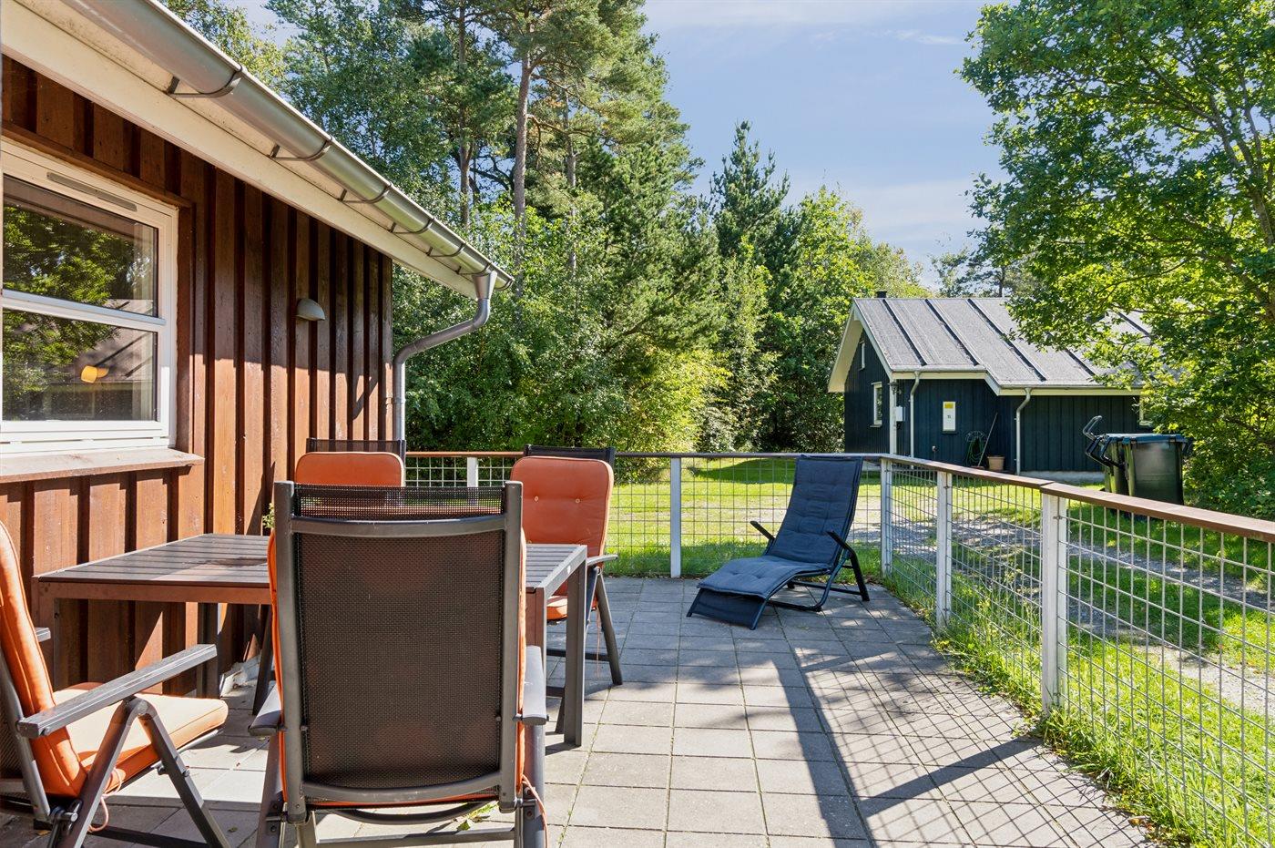 Der findes et skønt terrasseareal på begge sider af huset, hvor man kan sidde i helt ugenerte omgivelser og nyde stilheden og de smukke omgivelser med et godt glas vin eller en kop kaffe.