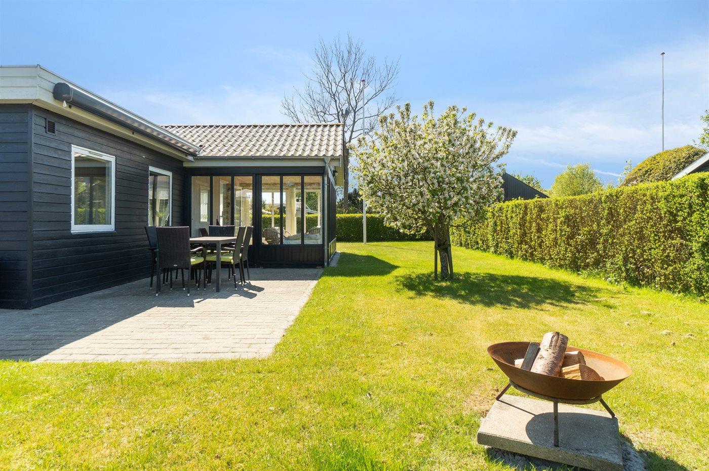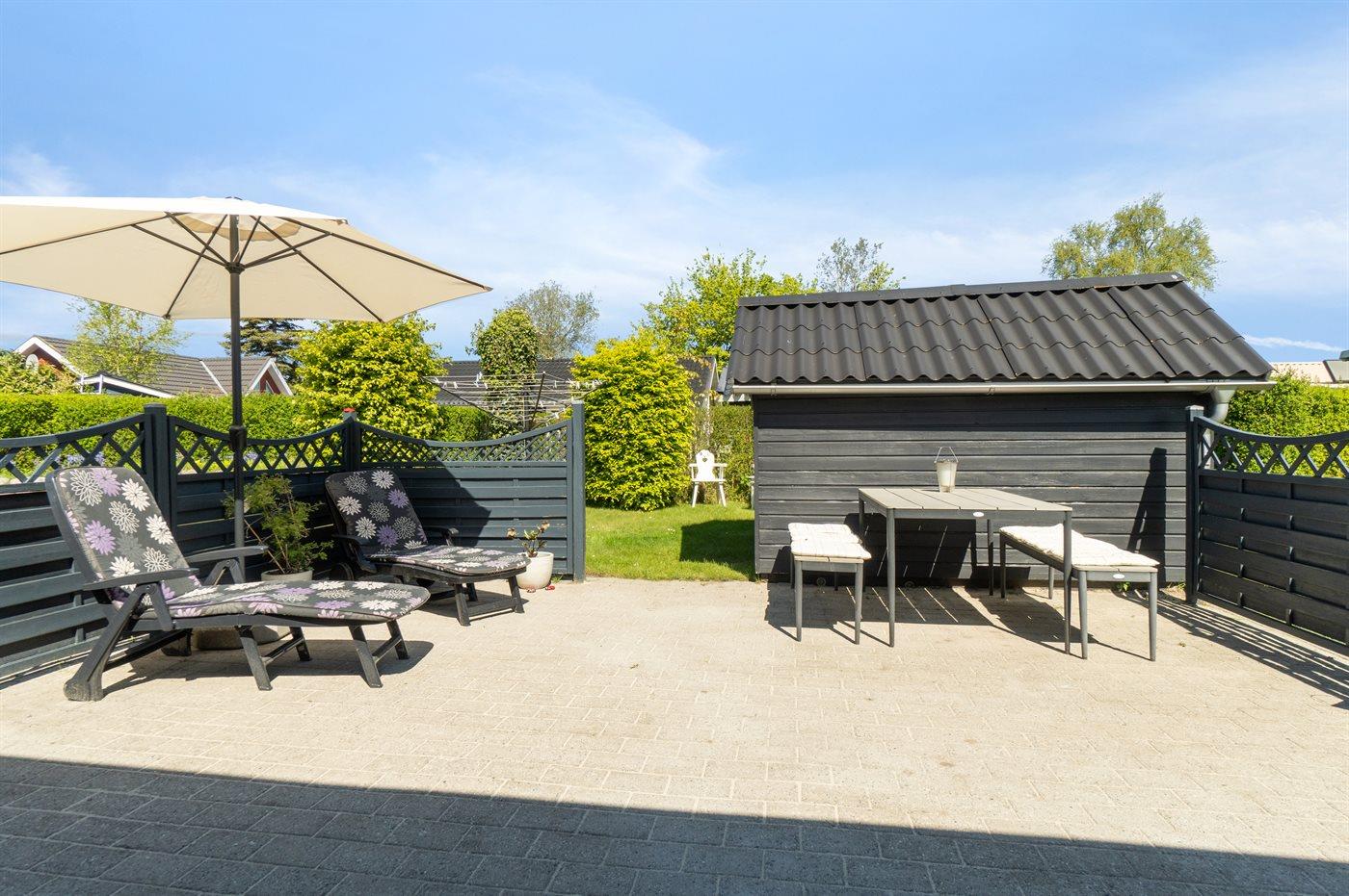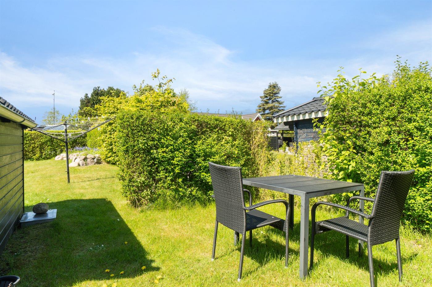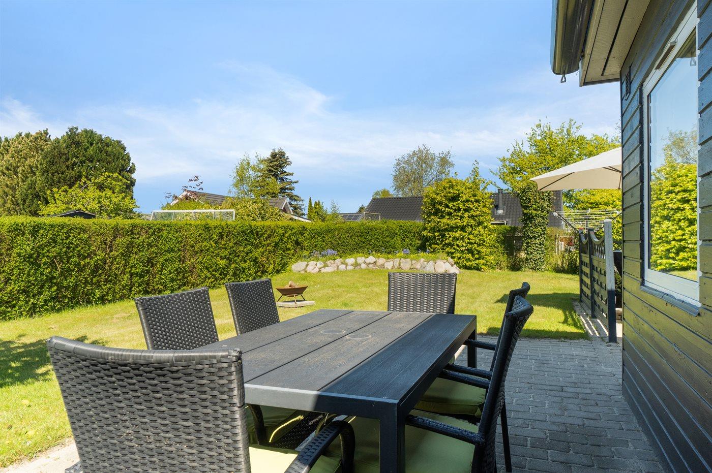Sommerhuset har et skønt terrasseareal på flere sider af huset. Herudover er beliggenheden ganske ugeneret og med en have, som er oplagt til boldspil og leg for børn. Her er det helt oplagt at sidde og nyde roen med et glas vin eller en god kop kaffe.