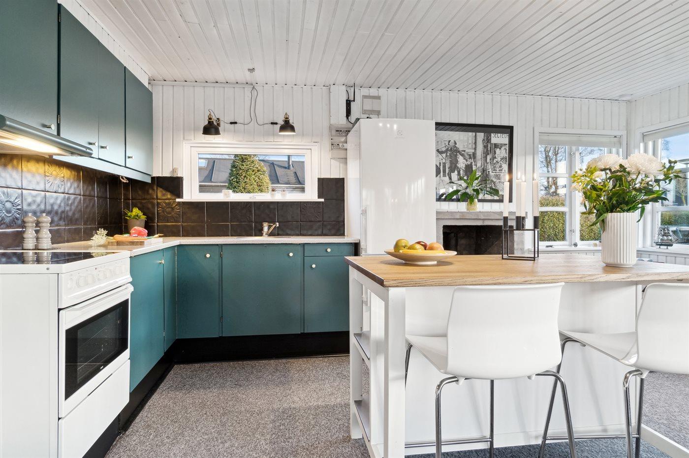 Køkkenet er udstyret med 1 køleskab. Der er 4 keramiske kogeplader, varmluftovn, mikrobølgeovn, Airfryer.