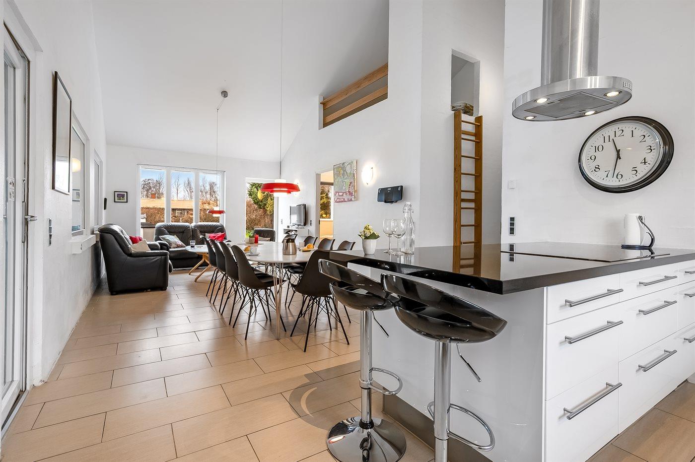 Køkkenet er udstyret med 1 køleskab. Der er 4 induktionskogeplader, varmluftovn, mikrobølgeovn samt opvaskemaskine.