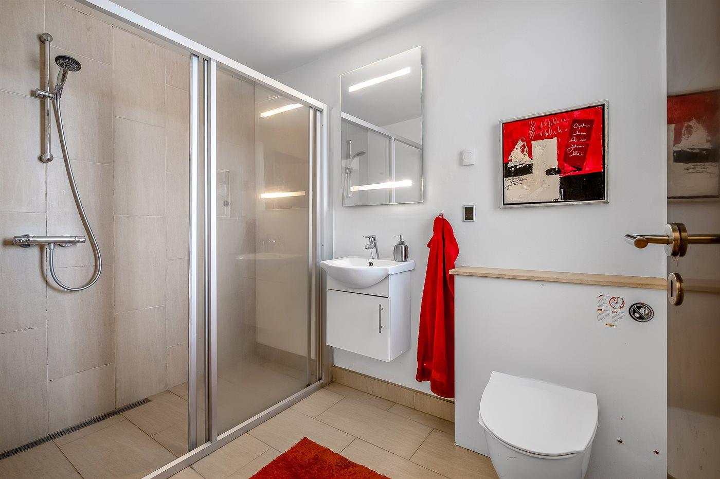 Der er 2 badeværelser med bruseniche og 2 toiletter. Der er gulvvarme på 2 badeværelser. I saunaen er der mulighed for afslapning.