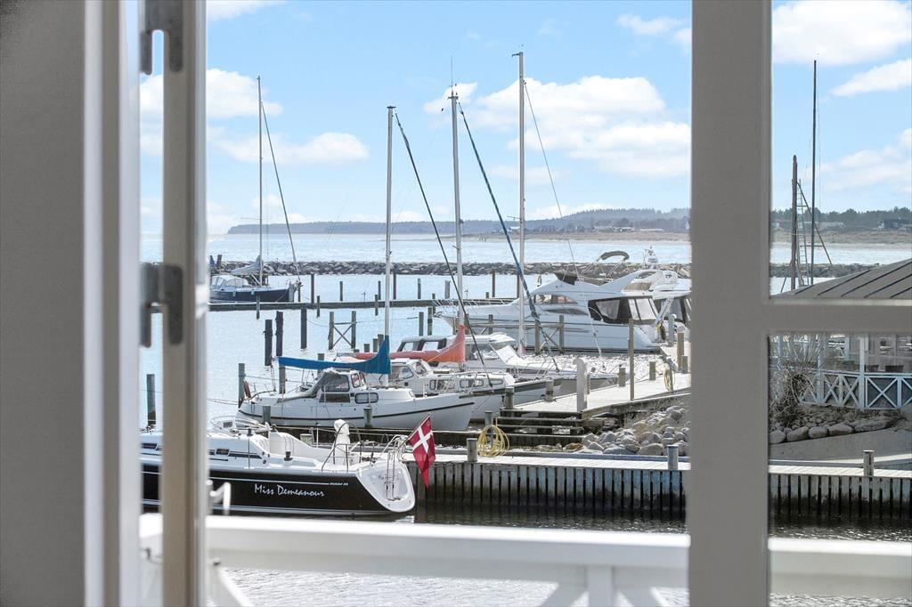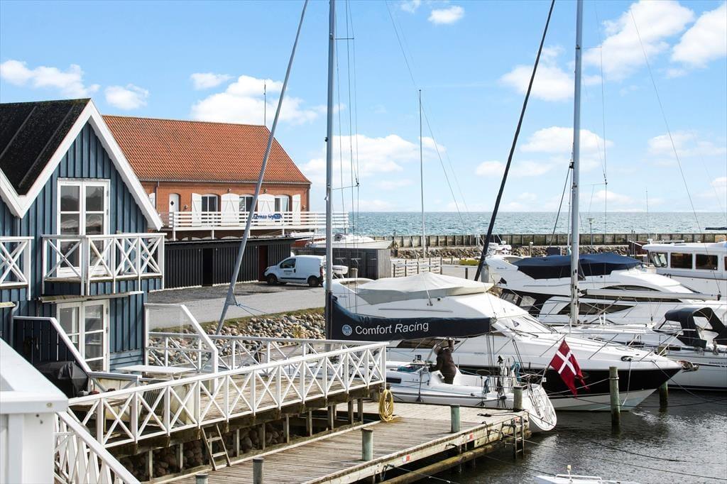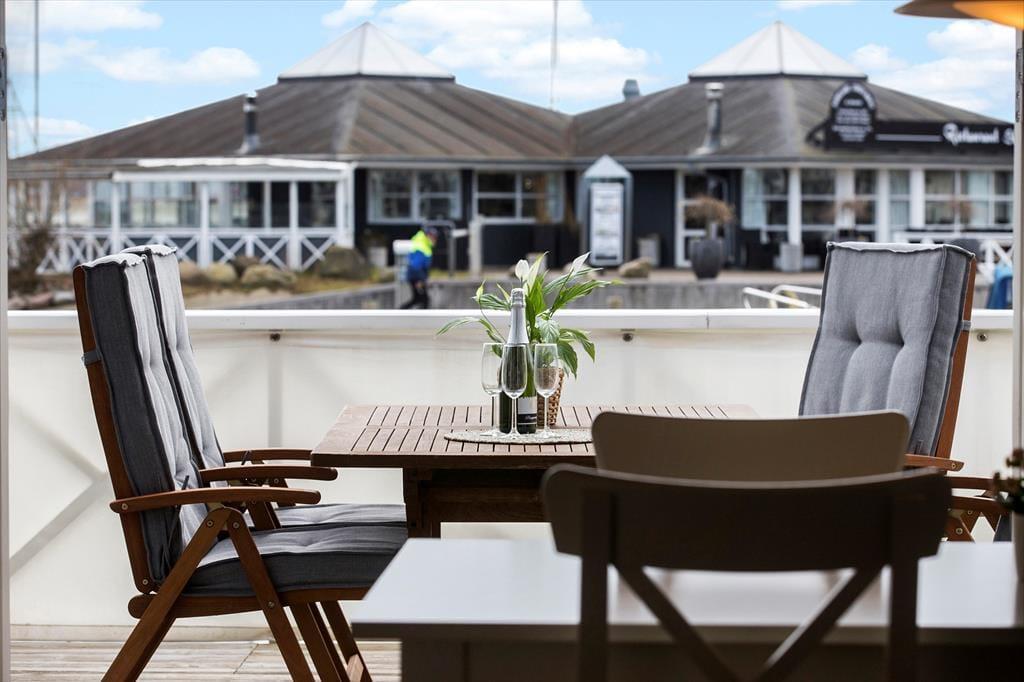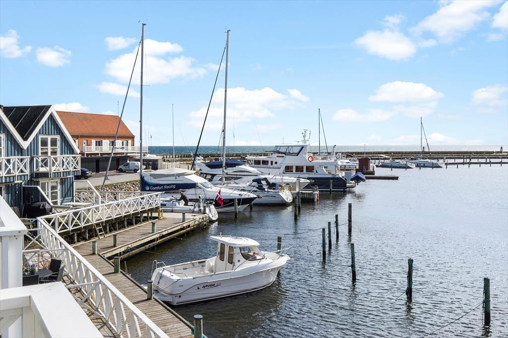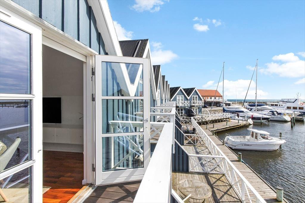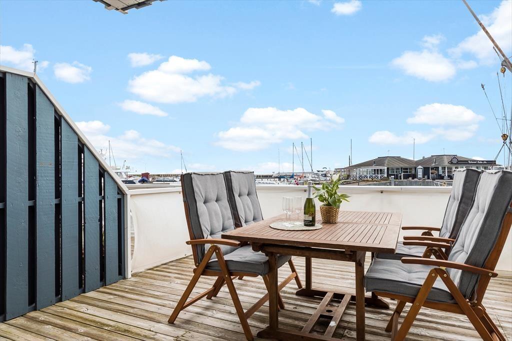 Udendørs: Start dagen med at se solen stå op fra balkonen ud for soveværelset ovenpå. Fra både terrasse og balkon mod sydvest, er der den dejligste udsigt over det maritime havneområde, skibene og havnebassinet. På både terrasse og balkon er der havemøbler og grillen står godt placeret på terrassen ud for køkkenet. Kom hjem fra dagens oplevelser, tænd grillen og nyd dagen gå på hæld til lyden af klaprende rigger og smuk solnedgang.