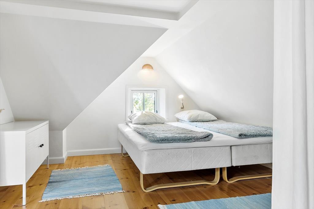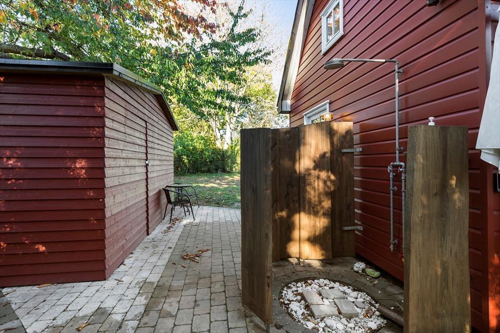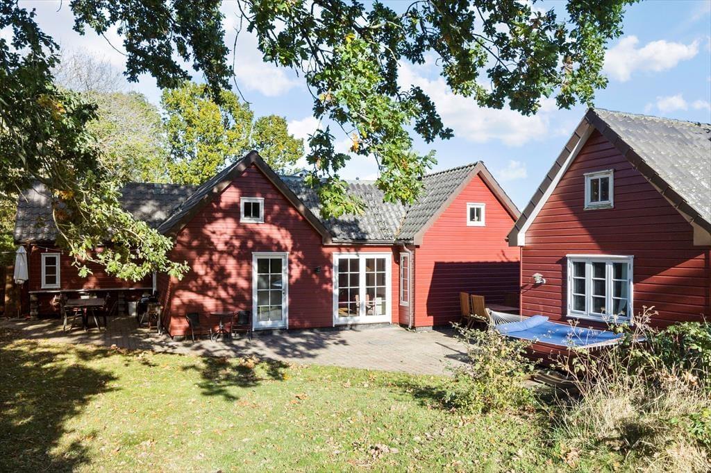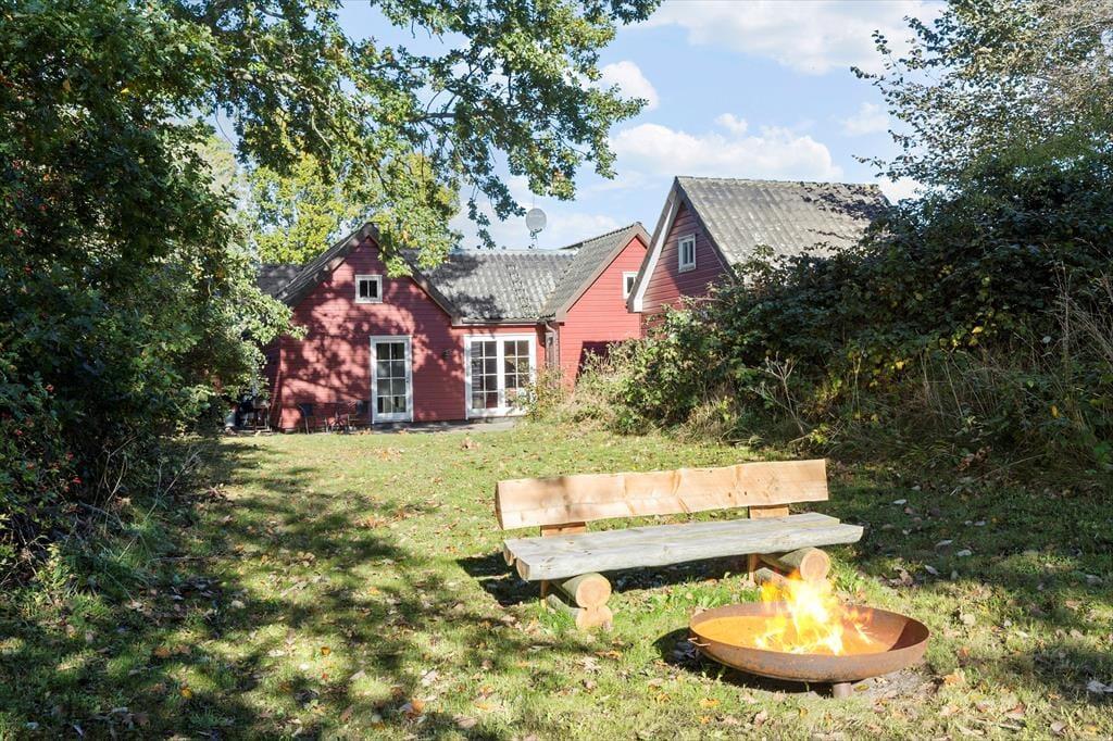 700 meter til skøn badestrand. Haven er uforstyrret og vild med vilje - ligger frit og ugenert omkranset af smukke træer. Her er så mange dejlige steder at nyde det. På den skønne fliseterrasse kan du følge solen fra syd, øst og vest, alt i mens du sidder og nyde kaffen, mens børnene gynger. Du kan lave mad i udekøkkenet, grille, traktere og spise. Du kan tage solbad og tage et forfriskende dusch i udebruseren og du kan nyde det sidste af dagen og udsigten over landskabet ved bålpladsen.