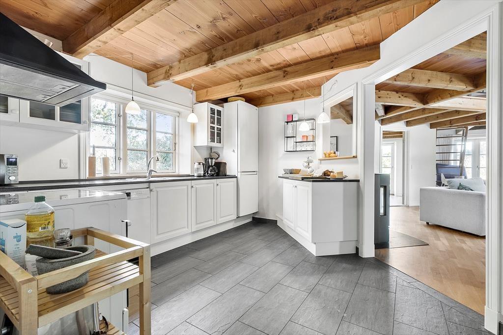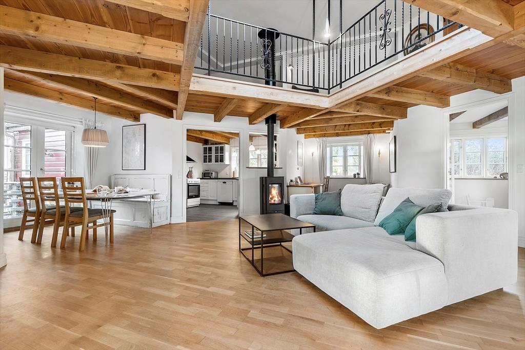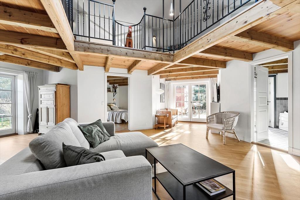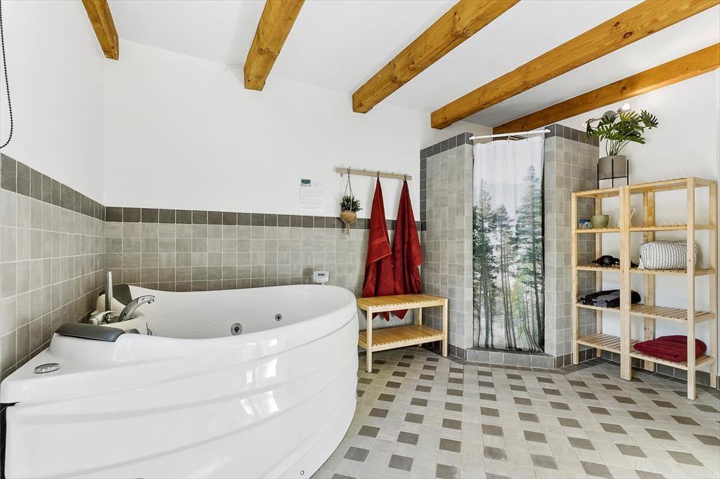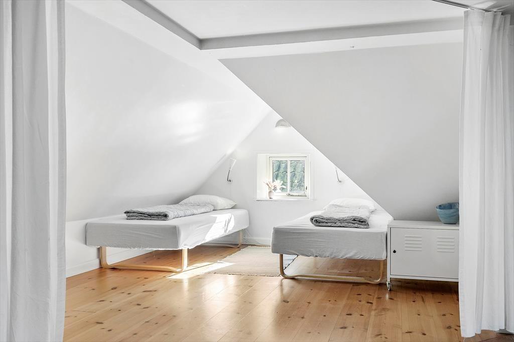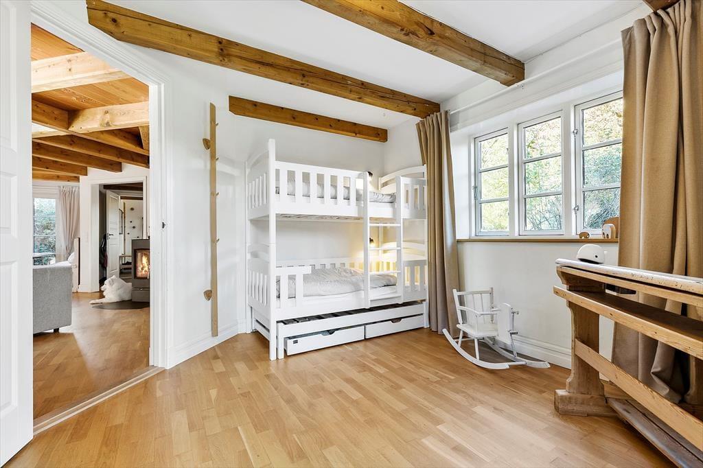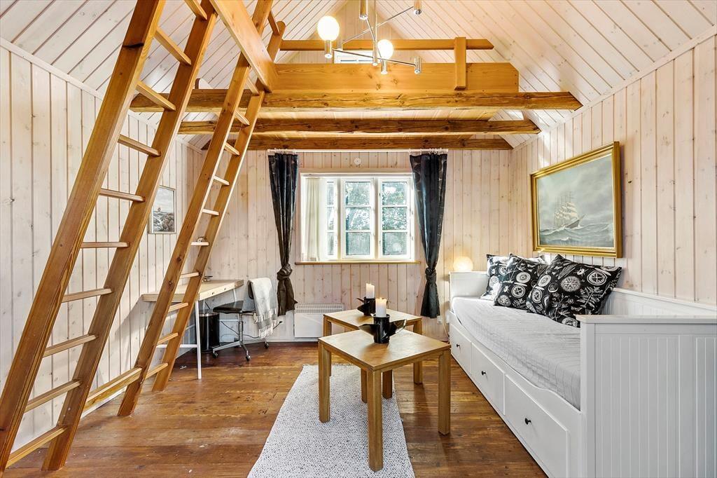 Når du drejer ned ad vejen til huset, bliver du grebet af ro og et velbeliggende smukt, rødt træhus byder dig velkommen. Du starter ”huseventyret” i stort bryggers med vaskemaskine og tørretumbler, hvor der er rigelig plads til en barnevogn og hvorfra der er adgang til fint gæstetoilet. Fra bryggers går du videre til det hyggeligste køkken, der er forsynet med gode hårde hvidevarer og hvor der er gjort meget ud af, at køkkengrejet er i orden og at porcelæn og glas passer til husets stil. Fra køkken kommer du ind i den skønneste stue, der er husets hjerte og med flere "rum i rummet". Her er brændeovn og meget højt til loftet, Sætter du dig i sofaen, har du overblik over næsten hele huset…. Også op til 1. sal. Fra stuen er der adgang til stort, lækkert badeværelse med spa og udgang til fliseterrasse og skøn have, der er "vild med vilje". Du kan også søge til stuens stille hjørne med en god bog, kigge TV i TV-hjørnet eller hygge dig i spisehjørnet. Sidst, men ikke mindst er der adgang til 2 dejlige værelser. Ét med 3 børnekøjer og ét soveværelse med dobbelt seng. Også husets overetage er speciel og unge mennesker vil elske den del af huset. Egentlig er det ét rum, hvor der på smart vis er indrettet 2 soveværelser med 2 gode senge i hver og forhæng ud til resten af overetagen, der er ét stort aktivitetsrum med blandt andet bordfodbold og "pudehule". Loftshøjde i overetagen er 1,7 meter og arealet i overetagen tæller ikke med i boligarealet. Udover det skønne hus, er der hyggeligt anneks med 4 sovepladser.