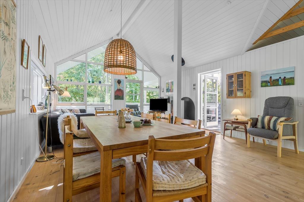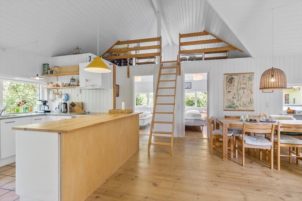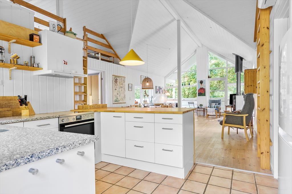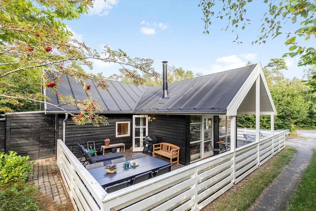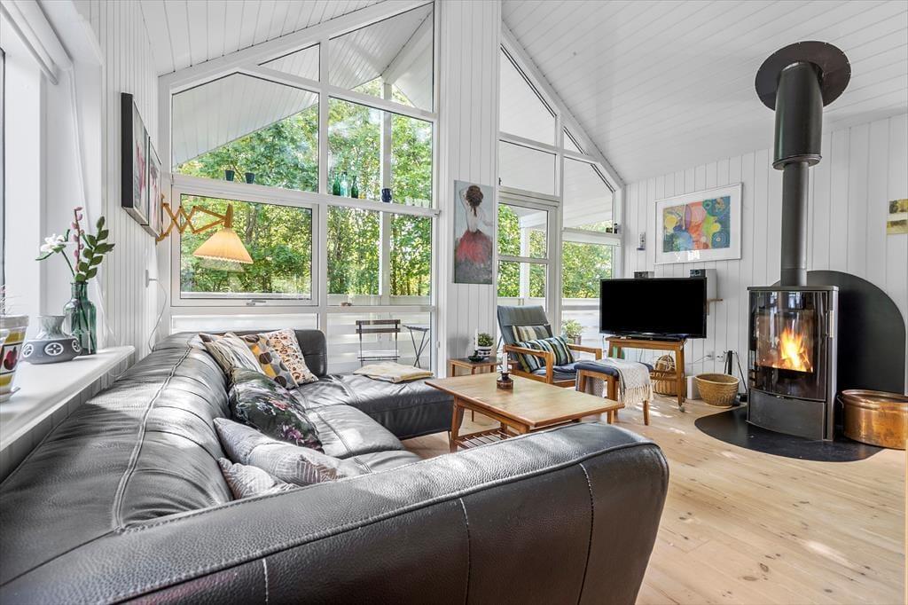 Forestil dig at starte dagen med en kort gåtur ned til det bløde sand og de rolige bølger ved Grenå Strand – kun 200 meter fra dette sommerhus. Når du vender hjem, træder du ind i et lyst træhus med højt til kip og store vinduer, hvor solen fylder rummene med liv og feriestemning.
