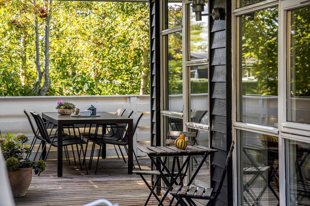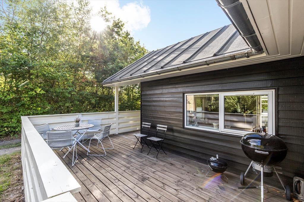 Den lukkede terrasse vender mod øst, syd og vest og er et skønt sted at begynde dagen med en stille morgenkaffe i solen, fortsætte med afslapning i løbet af dagen og runde af med grillede, lokale lækkerier og hyggesnak i de lange sommeraftener.