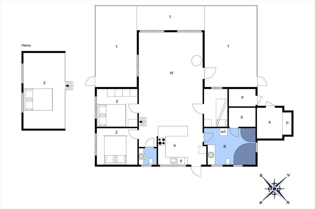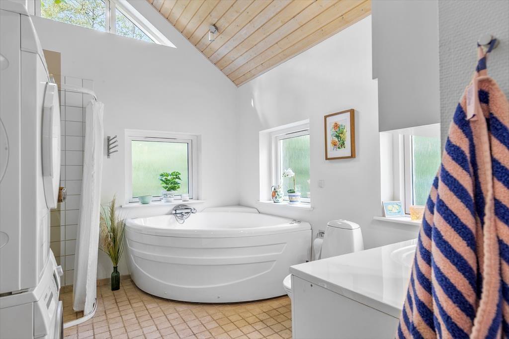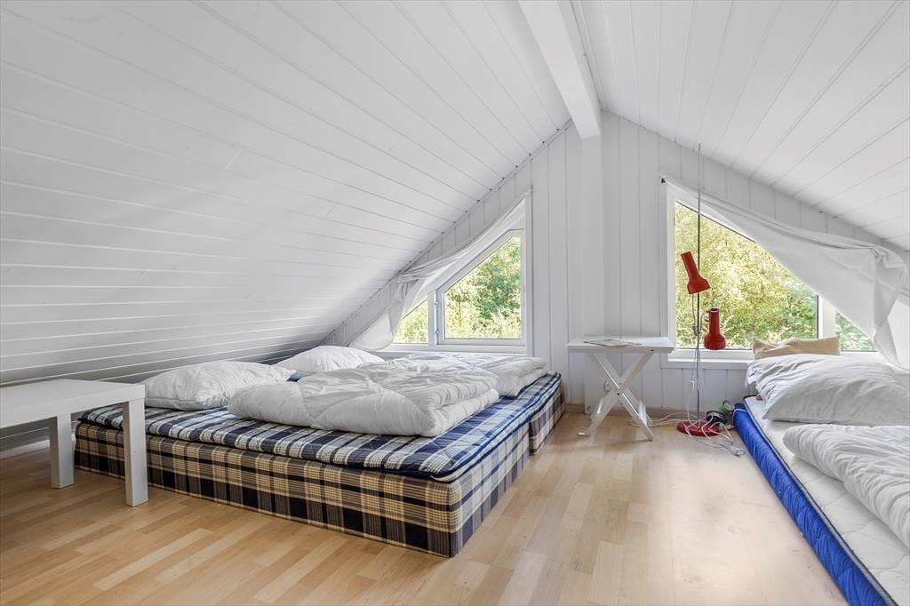 Sommerhuset rummer tre gode værelser – to med dobbeltsenge og ét med køjeseng – samt en hems med to madrasser, hvor børnene kan lave deres egen lille hule. Når dagens oplevelser er slut, kan I forkæle jer selv med en tur i spaen eller nyde varmen i saunaen. Badeværelset har også vaskemaskine og tørretumbler. Udover badeværelset er der gæstetoilet.