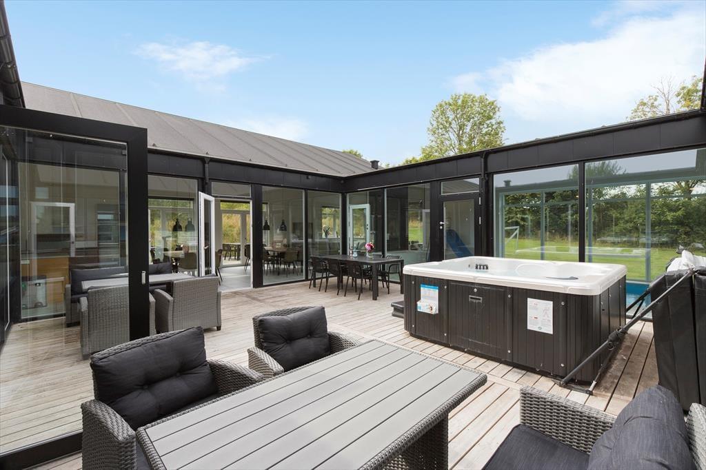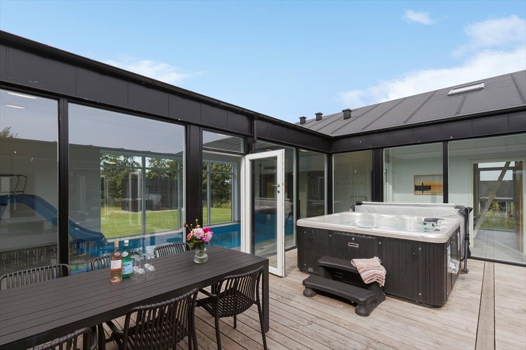 Midt i sommerhuset er der en skøn, privat atriumgård med loungemøbler og en stor udendørs spa til 6 personer. Her er "højt til loftet", frisk luft og god stemning, så du vil virkelig nyde at lade roen sænke sig og få en hyggelig "voksenhyggesludder" og et "godt glas", når børnene er puttede. Fra gården er der direkte adgang til pool rummet og frit udsyn til børnenes vandleg samt til fløjen med værelser og aktivitetsrum og til køkken og stue fløjen. Det skaber en dejlig forbindelse mellem inde og ude.