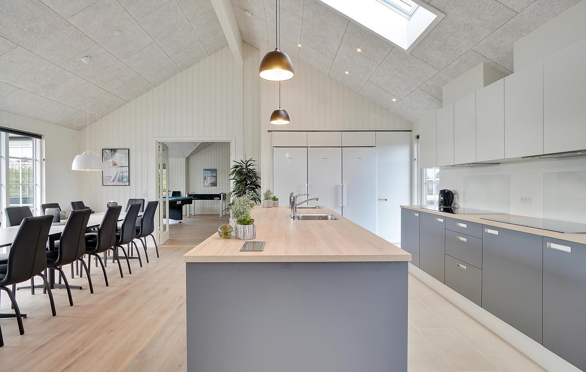 Når I kravler til køjs, foregår det i et af de 10 soveværelser eller på hemsene (6 sovepladser bedst til børn eller unge). Soveværelserne er fordelt på 3 soveafdelinger, hvilket igen er smart, hvis halvdelen af familien ønsker at gå tidligt til ro, mens andre kan blive oppe uden at forstyrre. I alt har sommerhuset fire badeværelser.