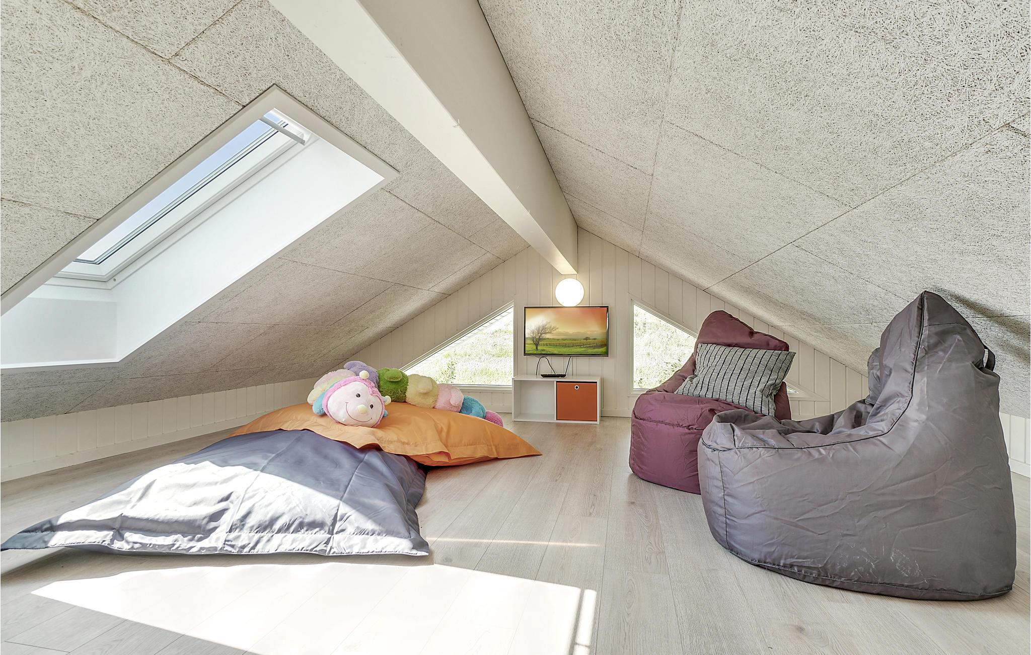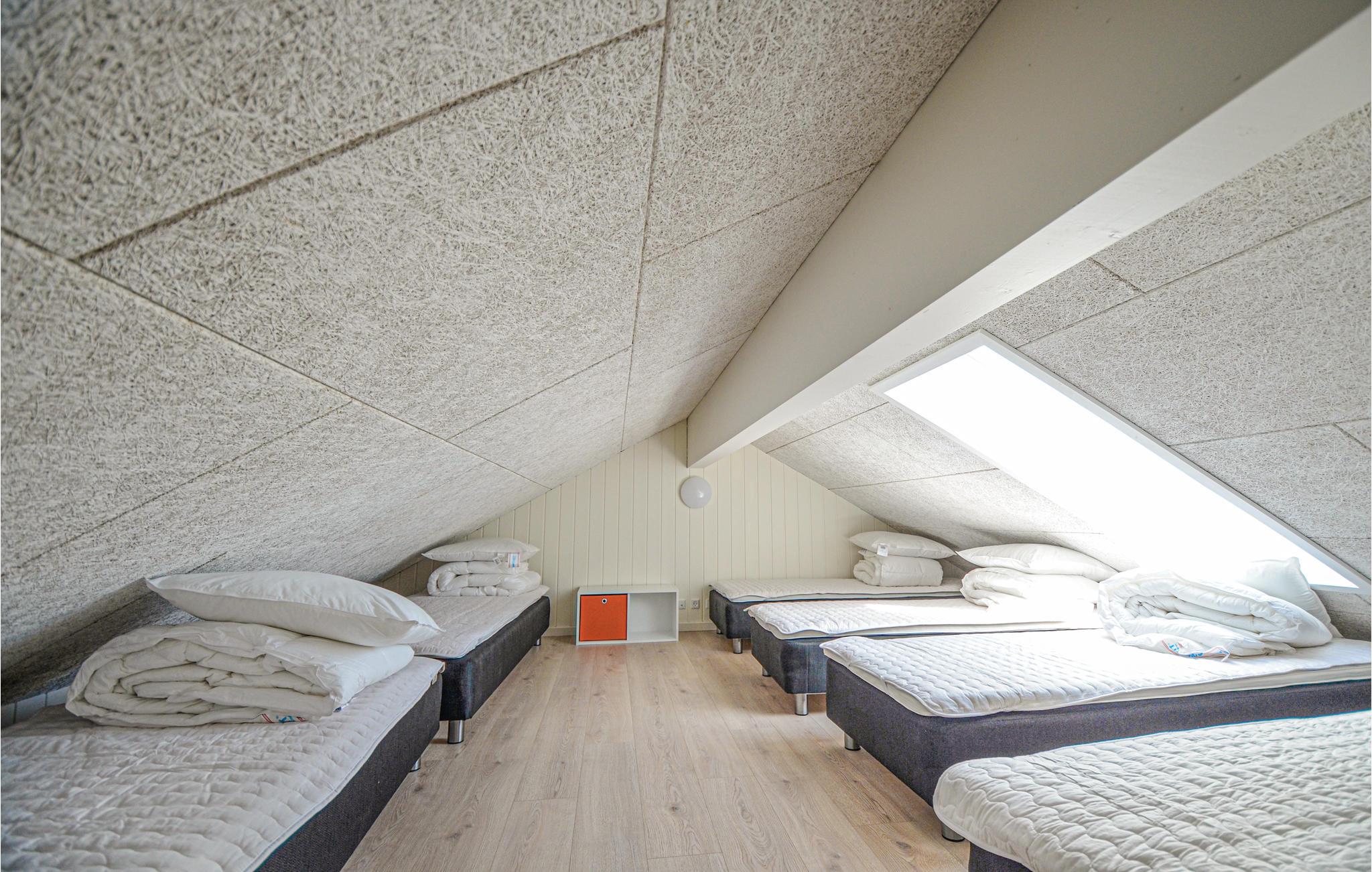 Sommerhuset har 9 soveværelser og på den ene hems er der 6 sovepladser (bedst til børn eller unge). De 9 soveværelserne er fordelt på 3 soveafdelinger, som giver god mulighed for, at nogle i familien kan gå tidligt til ro, mens andre kan blive oppe uden at forstyrre. På den anden hems er der plads til fx tv-hygge i de store sækkestole. I alt har sommerhuset fire badeværelser.