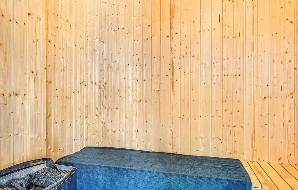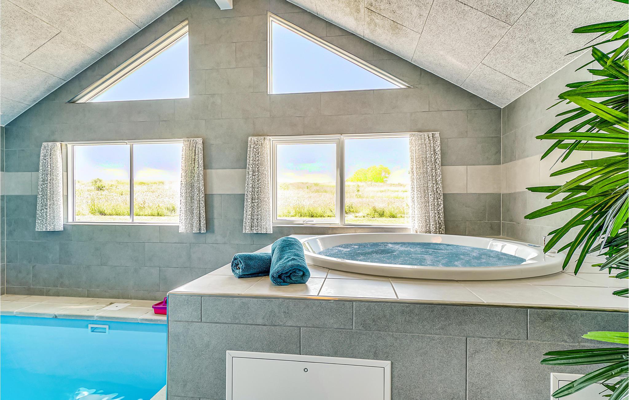 Vandhunde og badenymfer er i paradis i dette sommerhus. Her er nemlig en stor indendørs swimmingpool, hvor der kan plaskes og bades dagen lang. Poolen har trappe, vandrutsjebane og modstrømsanlæg. I poolområdet finder I også et lækkert spabad og en sauna.