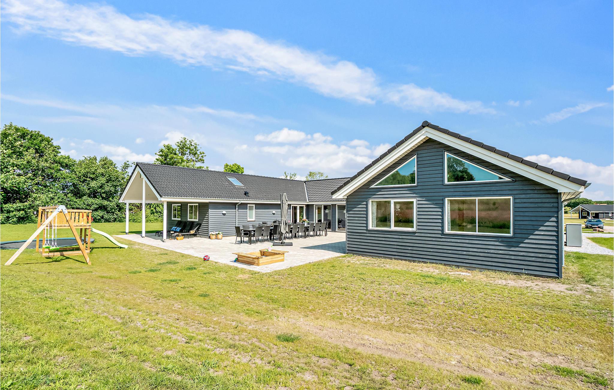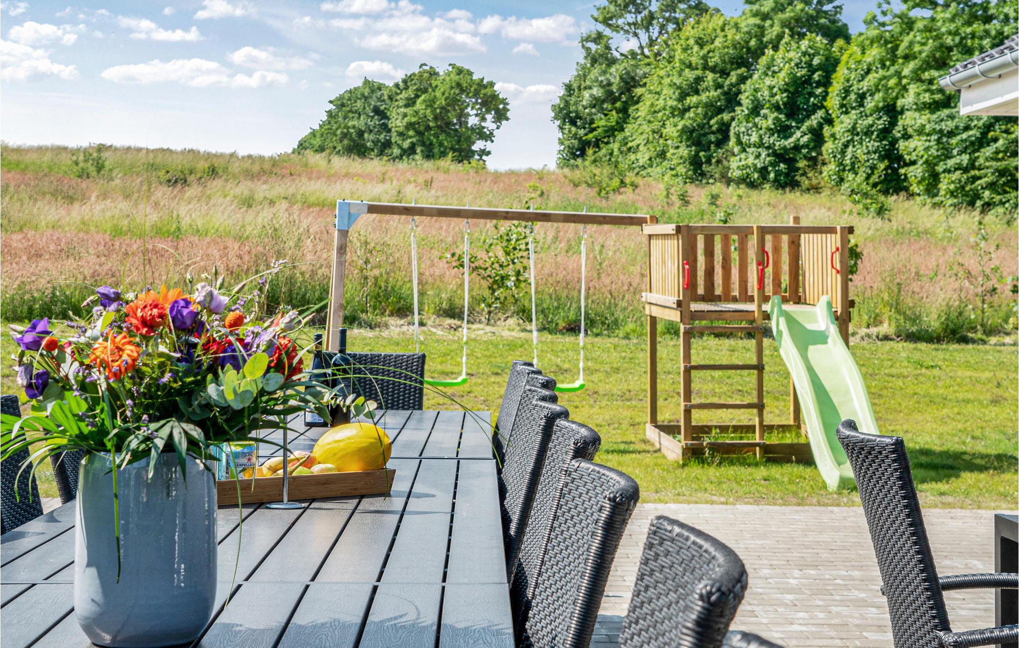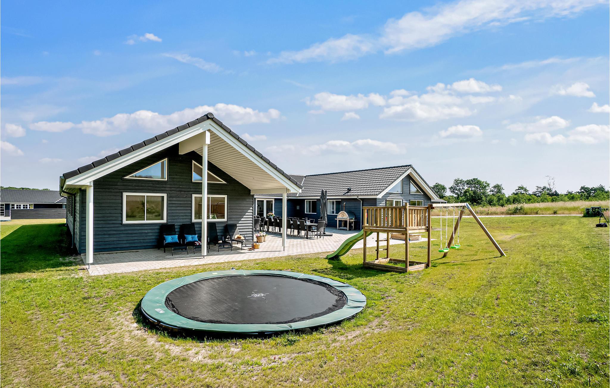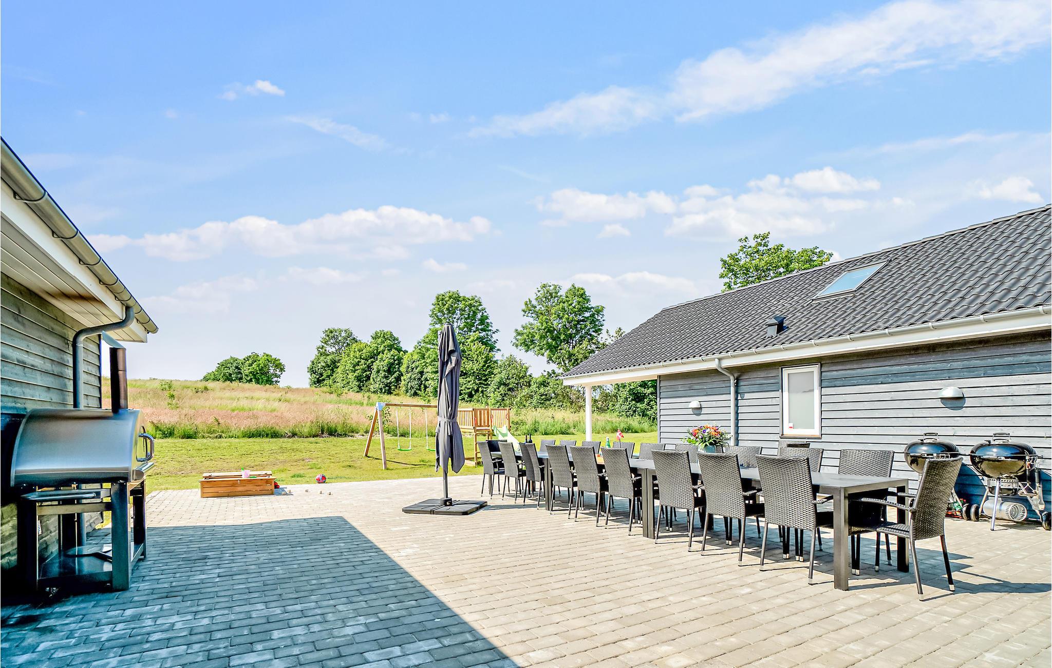 Den delvist overdækkede terrasse er udstyret med havemøbler, to kuglegrill til kul og en udendørs pizzaovn til brænde. Til de solrige dage kan parasollen give lidt skygge. I haven er der både gyngestativ med rutsjebane, sandkasse og trampolin til de yngste gæster og fodboldmål. ( til sommer). Der er ligeledes ladestik til elbiler.