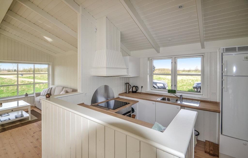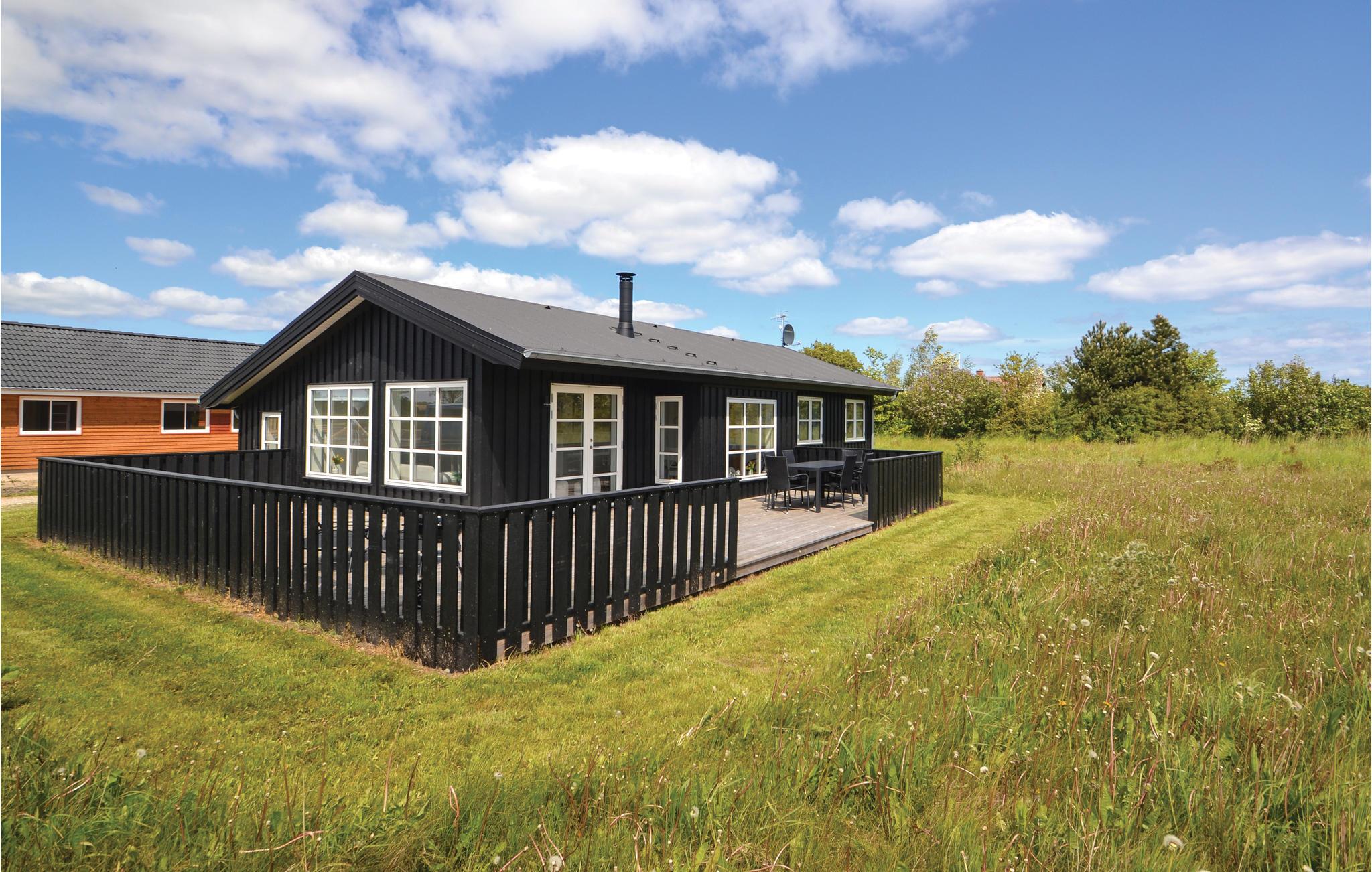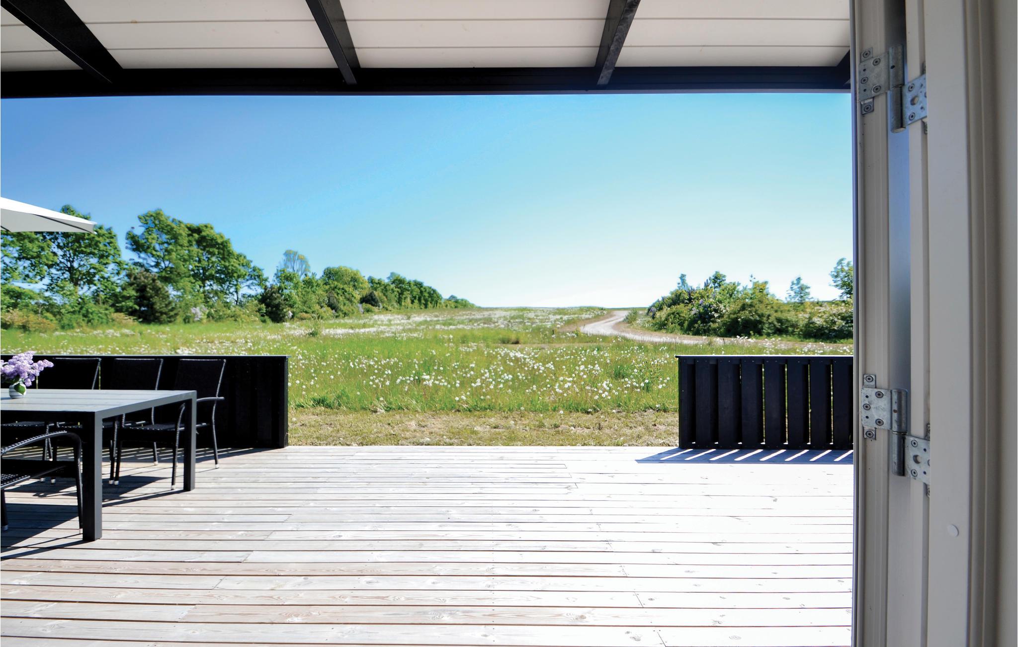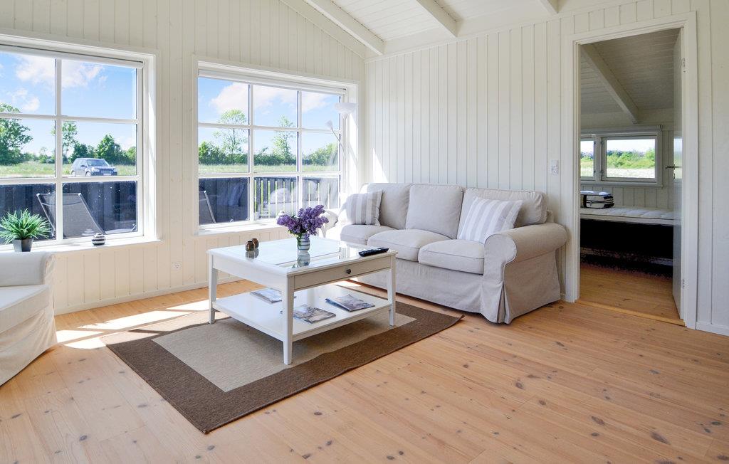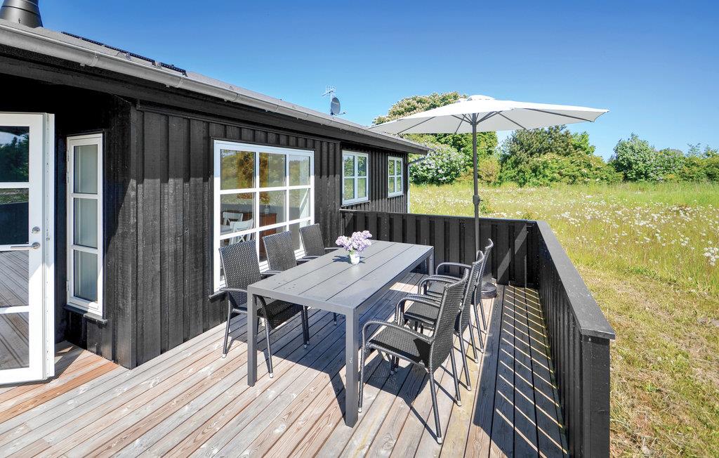 Flot sommerhus i Grenaa nær stranden med terrasse og udsigt over marker.
