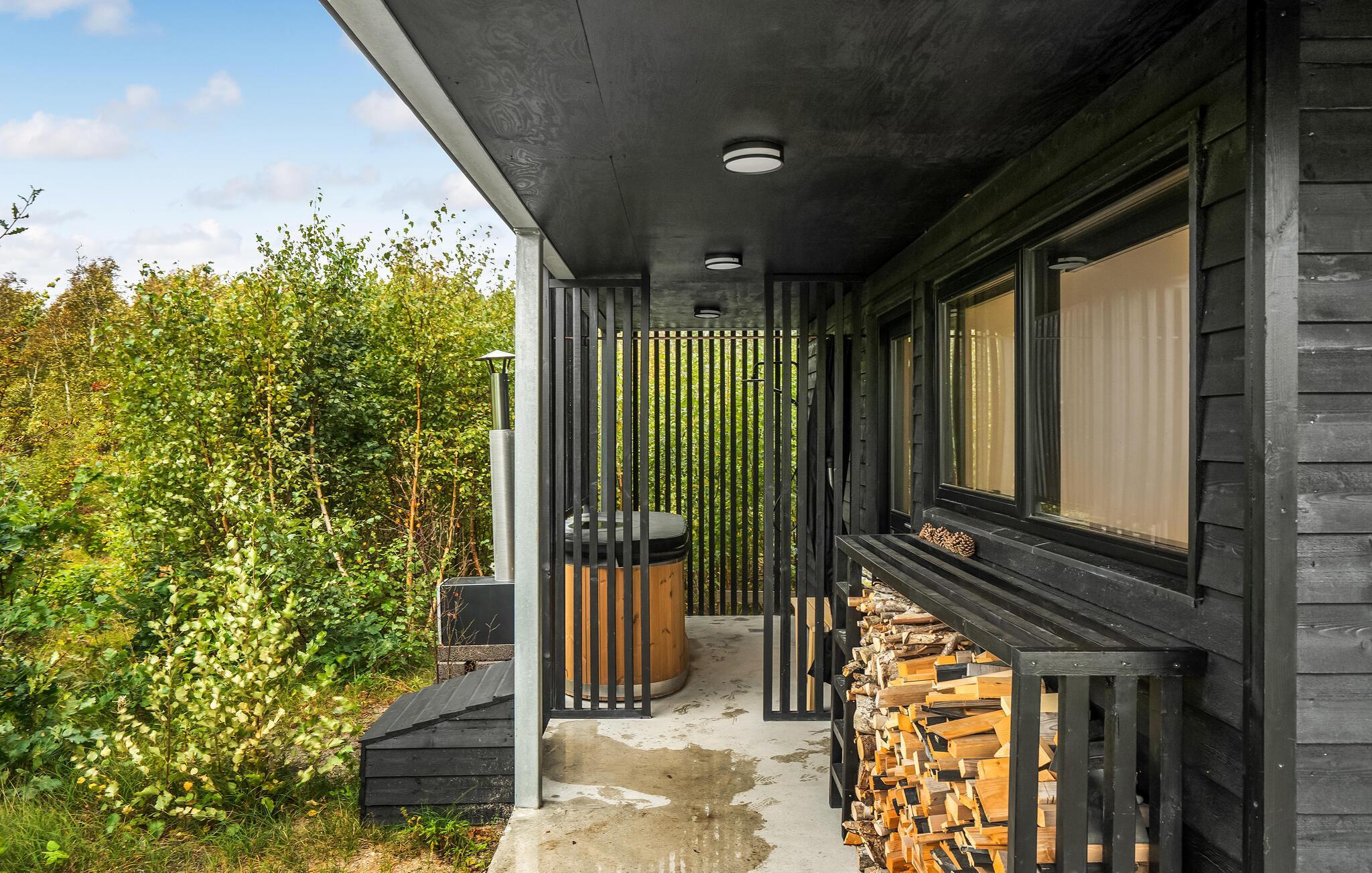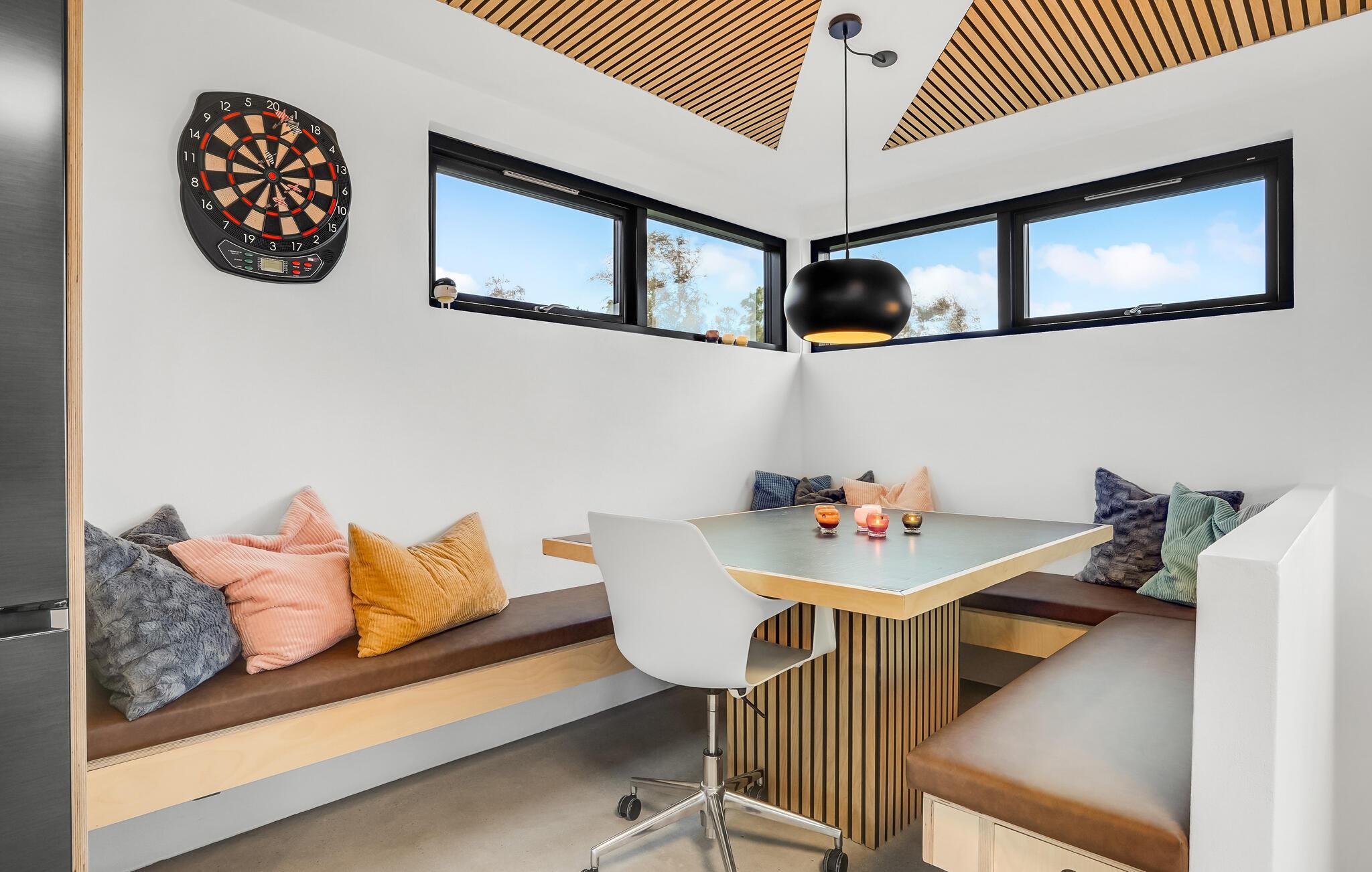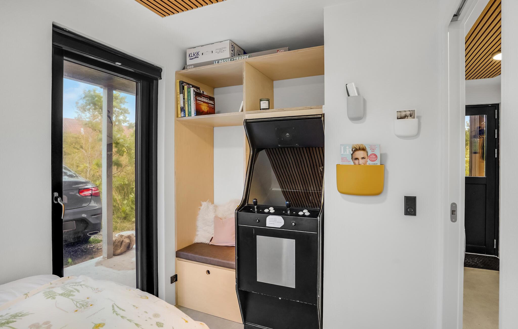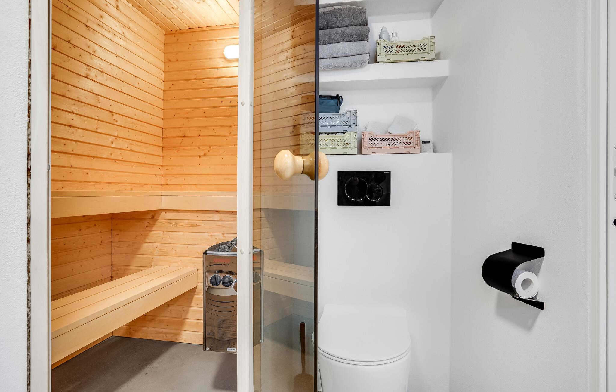 Hvis I har brug for ekstra forkælelse efter en lang dag på farten, kan I slappe af i saunaen eller vildmarksbadet til to personer. På 1. sal er der gode rammer til at nyde hinandens selskab i den store, åbne stue, som har udsigt til havet og havnen. Og hvis vejret tillader det, er der fantastisk på altanen om aftenen, hvor man kan grille og nyde en lækker drink. Der er dart og en spilleautomat i huset, så det er nemt at hygge sig indendørs med en familiedyst.
