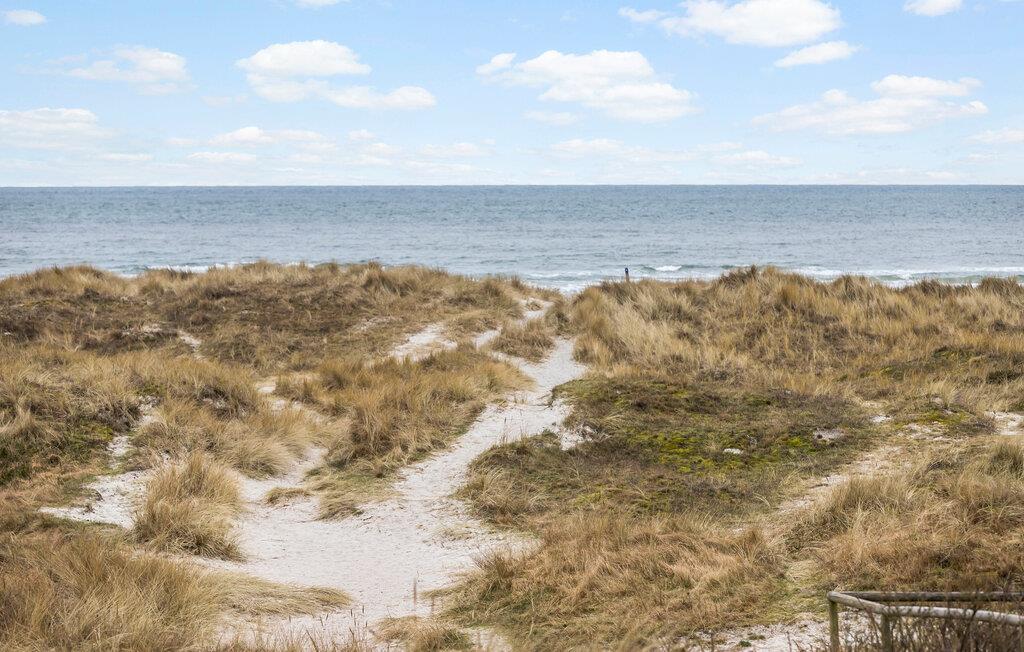 Hyggeligt og moderne strandhus med havudsigt, åben terrasse og brændeovn i idylliske Grenå klitter.