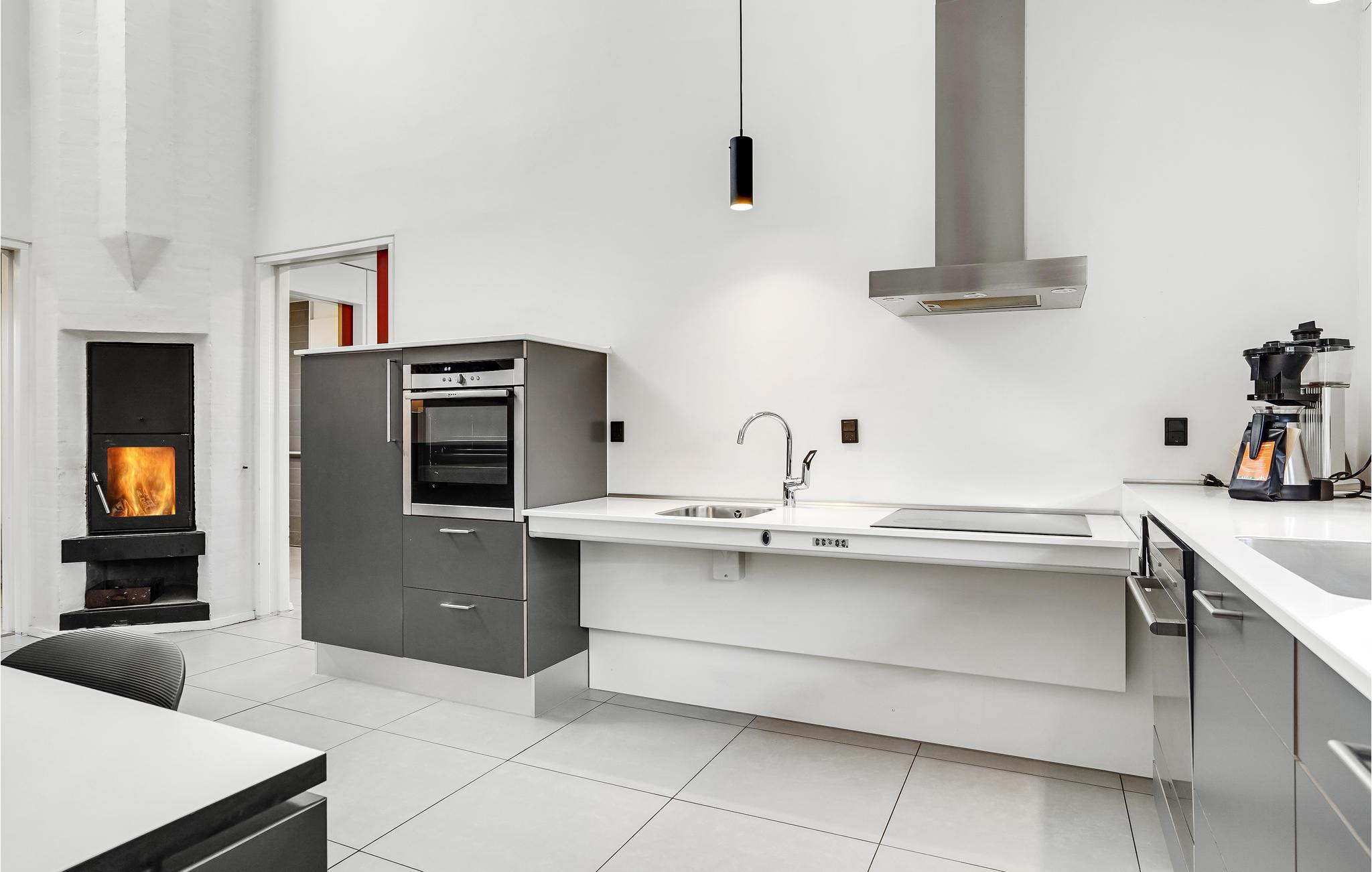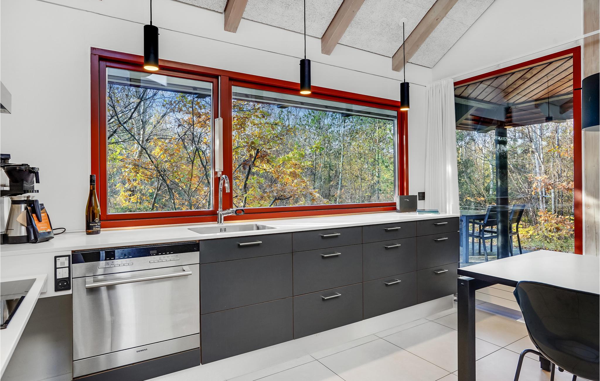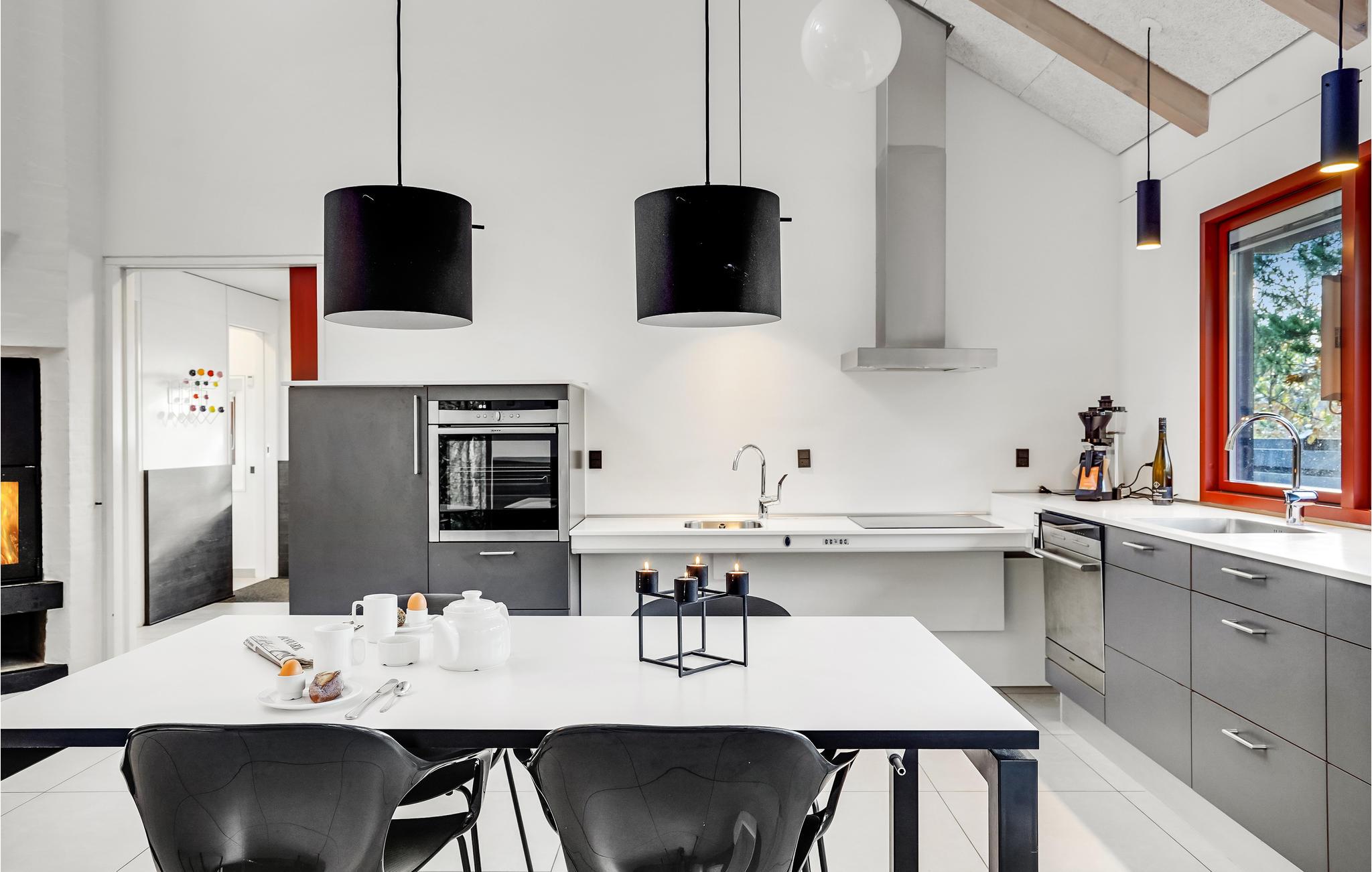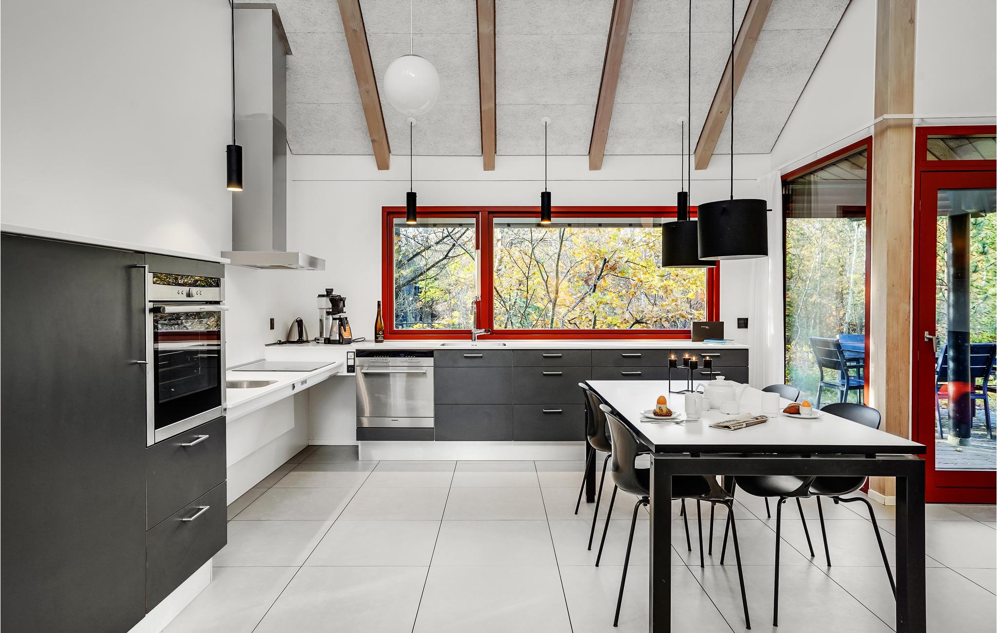 Dette lyse, indbydende og praktiske sommerhus byder op til fem gæster og et barn velkommen. Det har en hyggelig stue med køkken, hvor I kan slappe af foran brændeovnen. Der strømmer dejligt meget lys ind gennem de store vinduespartier.