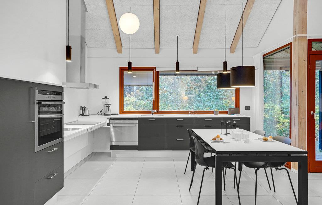 Dette lyse og venlige feriehus kan rumme op til fem gæster og et ekstra lille barn. I det praktiske feriehus finder I en dejlig stue med køkken. Her kan I hygge jer foran brændeovnen på de kølige dage. Masser af lys strømmer ind gennem de store vinduer. Feriehuset er lyst og moderne indrettet. På terrassen kan I hygge jer med en god morgenmad eller afslutte dagen stille og roligt med et glas vin. Her kan I nyde den friske luft og solen. Foran huset finder I jeres private parkeringsplads, og en legeplads ligger kun et par skridt fra jeres feriehus.