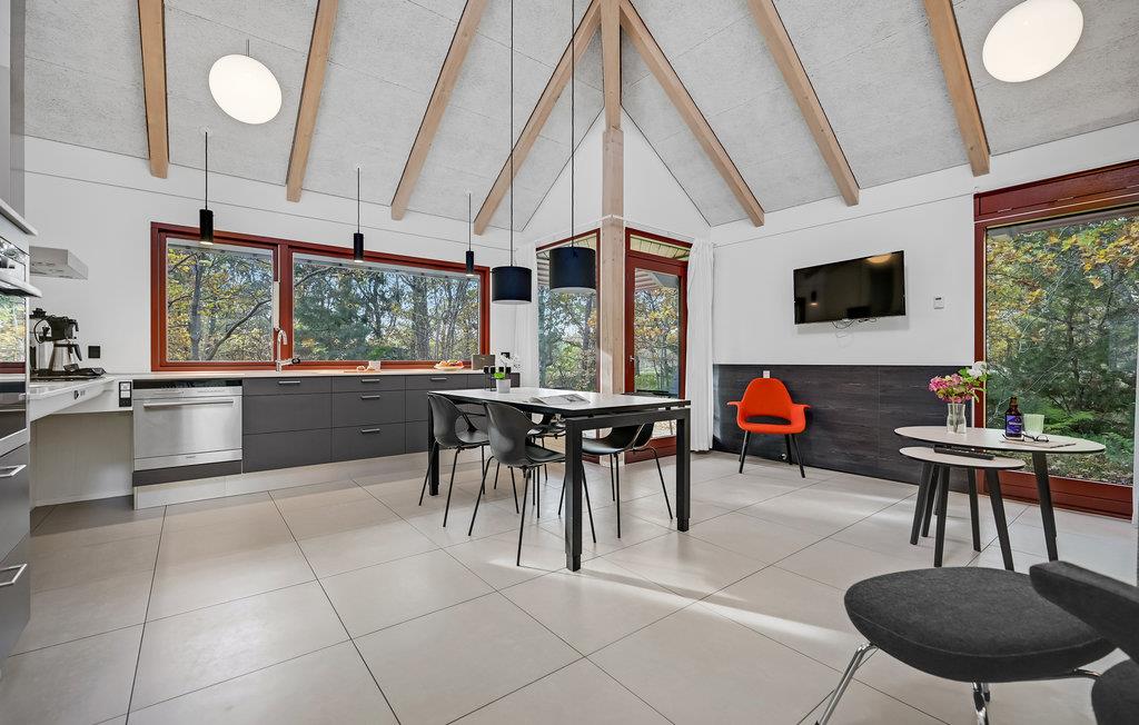 Dette lyse, indbydende og praktiske sommerhus byder op til fem gæster og et barn velkommen. Det har en hyggelig stue med køkken, hvor I kan slappe af foran brændeovnen. Der strømmer dejligt meget lys ind gennem de store vinduespartier.