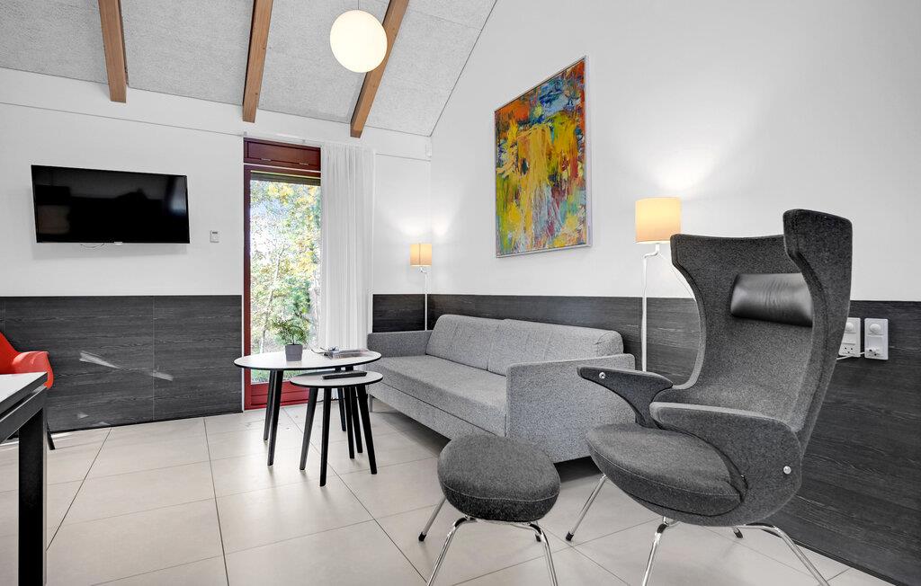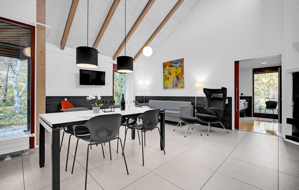 Dette lyse, indbydende og praktiske sommerhus byder op til fem gæster og et barn velkommen. Det har en hyggelig stue med køkken, hvor I kan slappe af foran brændeovnen. Der strømmer dejligt meget lys ind gennem de store vinduespartier.