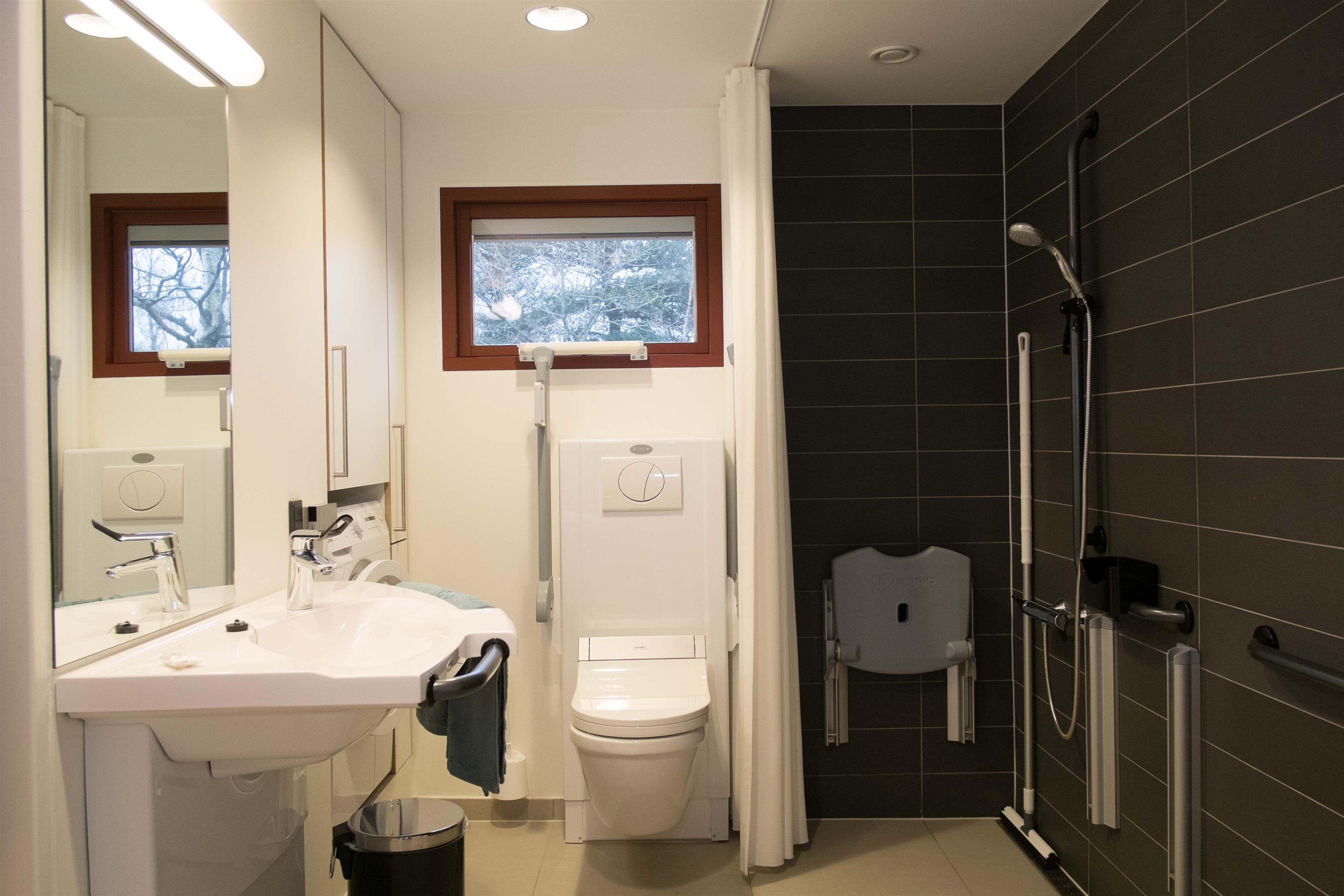 • Badeværelse med bruser, badebænk, hæve/sænke vask, hæve/sænke senso wash toilet samt vaskemaskine.