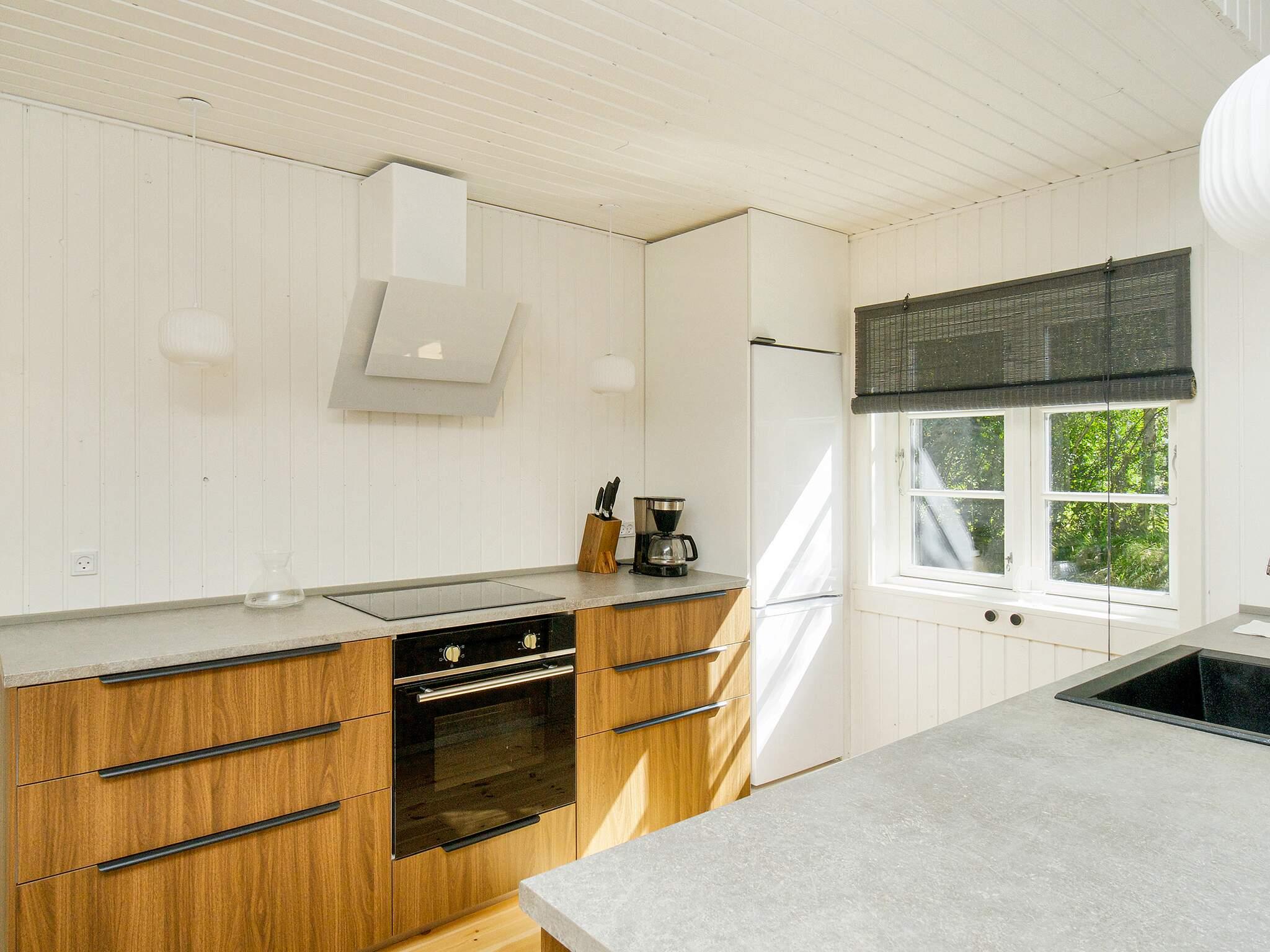 Køkken: Ovn, køleskab m/frostboks, mikroovn, induktionskomfur, kaffemaskine, opvaskemask.