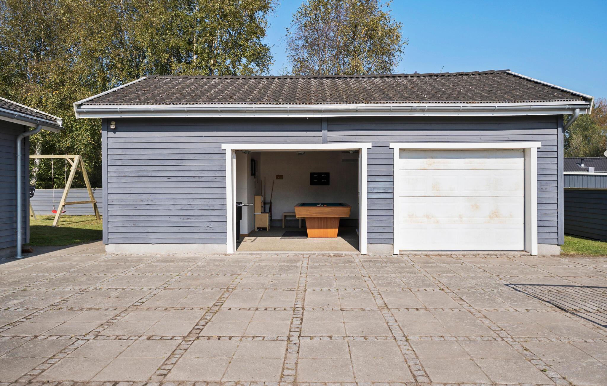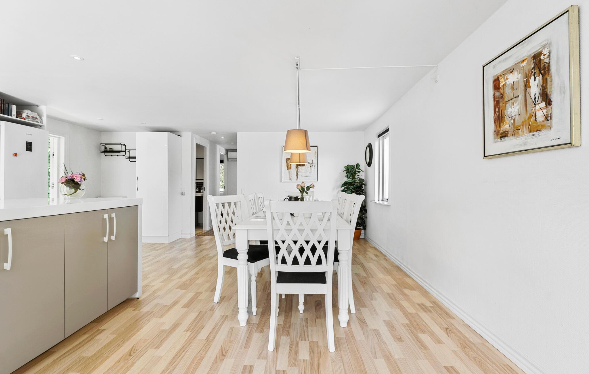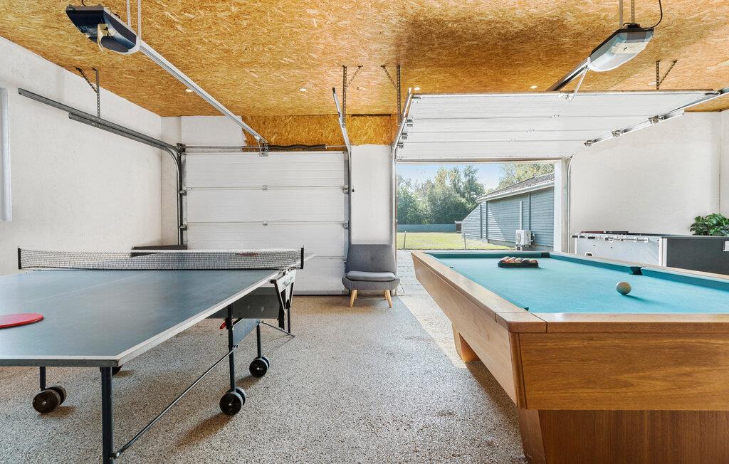 Læg hverdagen bag jer og nyd freden og roen på den store terrasse, der er udstyret med siddepladser og et spabad, der indbyder til afslappende stunder. Huset byder på en lys og rummelig opholdsstue. Begynd dagene med en lang morgenmad ved spisebordet i det åbne køkken. Efter et lækkert måltid kan I slappe af i den store have eller have det sjovt med et spil bordtennis eller billard i aktivitetsrummet. Læn jer godt tilbage i de komfortable sofaer og nyd en filmaften med familien. Om dagen fylder de store vinduespartier rummet med masser af lys og giver udsigt til haven.