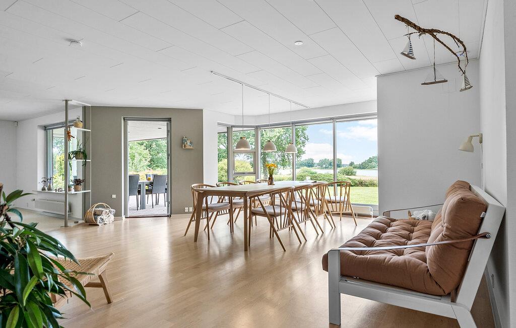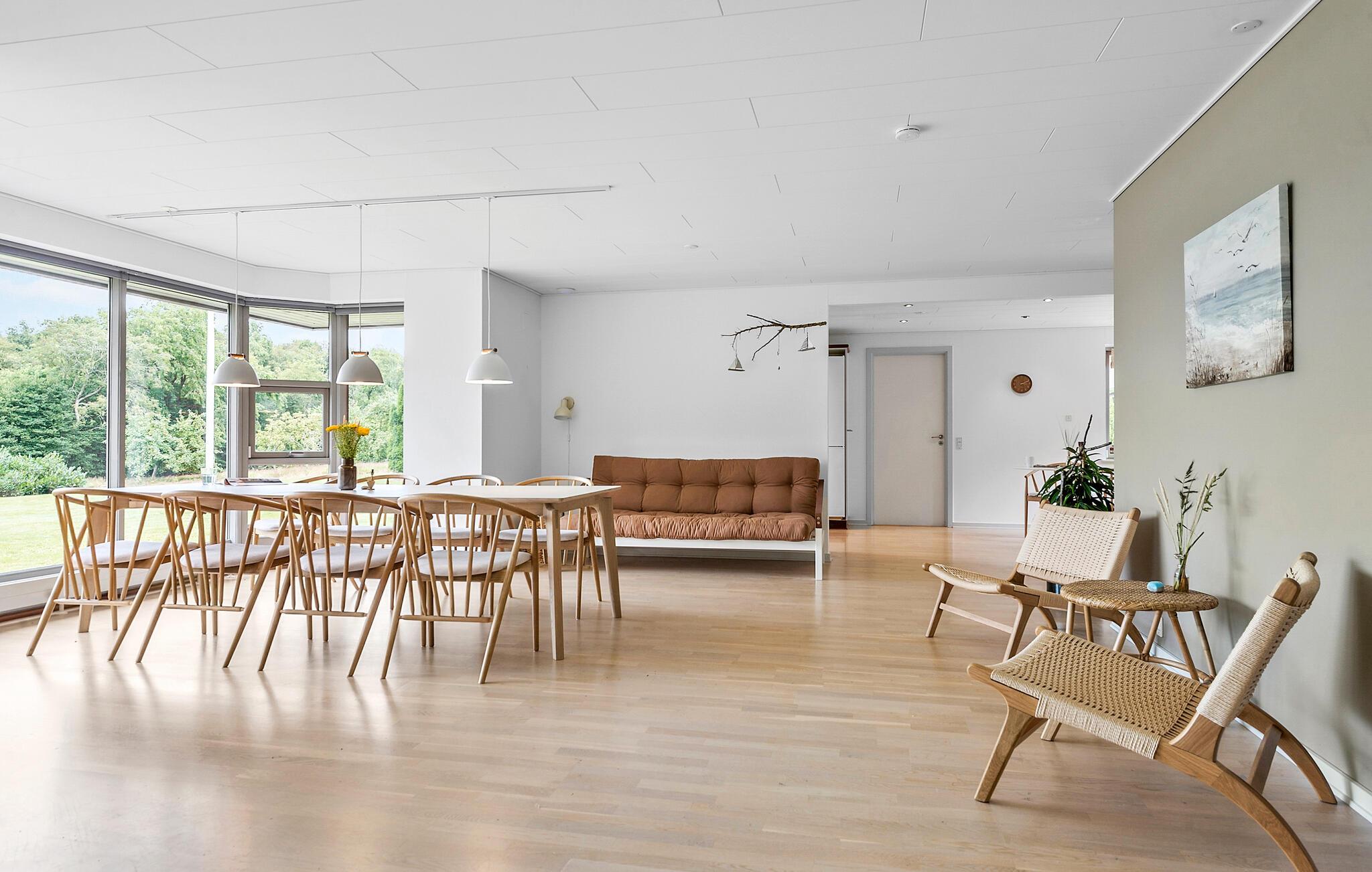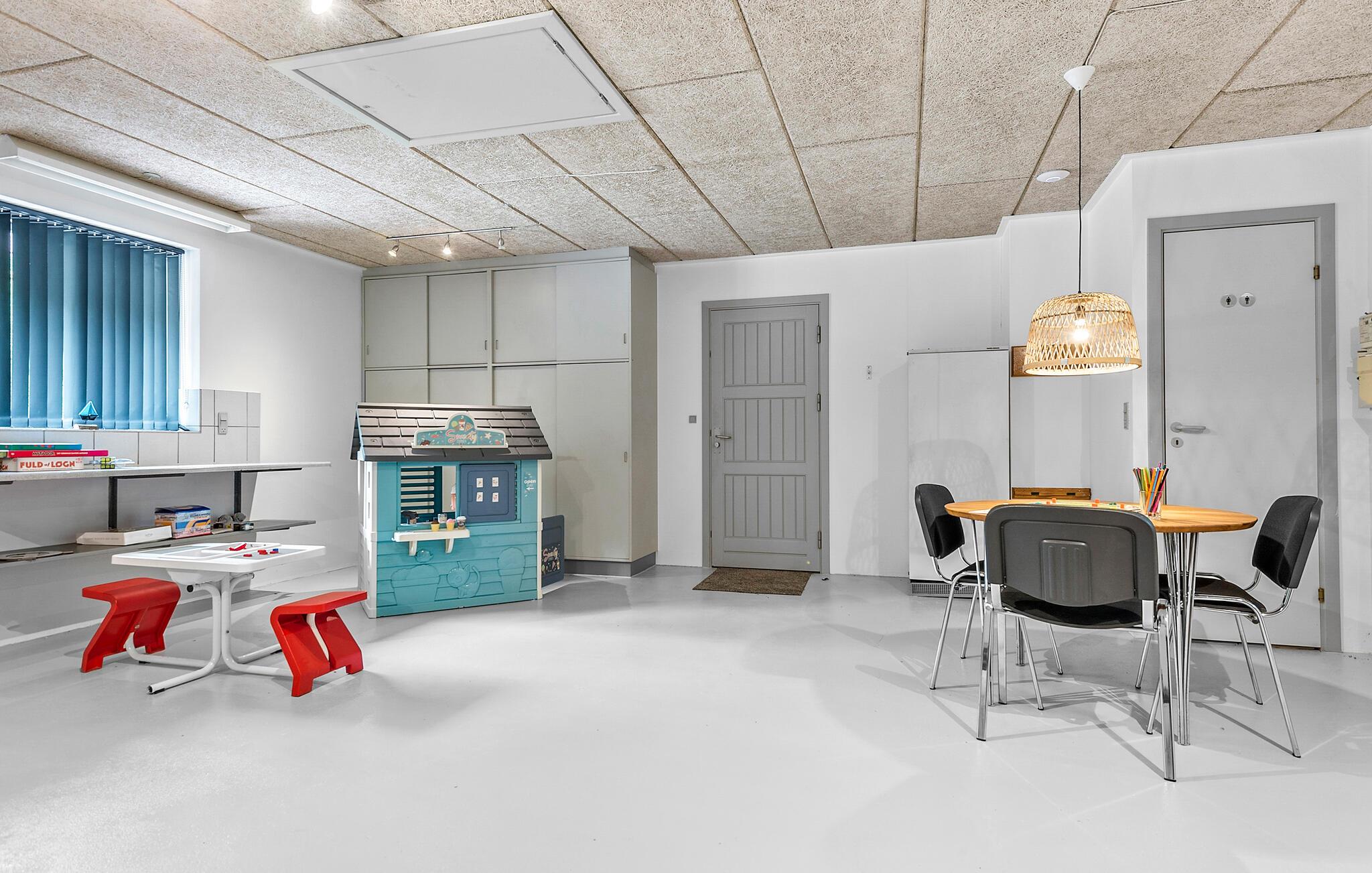 Velkommen til dette store sommerhus med plads til den store familie, hvor afslapning og underholdning er i fokus. Indretningen er elegant og enkel, og de store vinduer sørger for både et skønt lysindfald og en vidunderlig udsigt til søen. Her er flere loungespot, hvor I kan hvile jer og lade batterierne op efter en lang dag. I køkkenet er der plads til, at alle kan deltage i forberedelserne. Om det er at skrælle kartoflerne eller sidde ved det runde bord og underholde med spændende samtaler. Efter mad kan I bruge en hyggelig aften i aktivitetsrummet. Her kan I dyste mod hinanden i aithockey, bordtennis eller brætspil, eller I kan tegne og klippe-klistre.