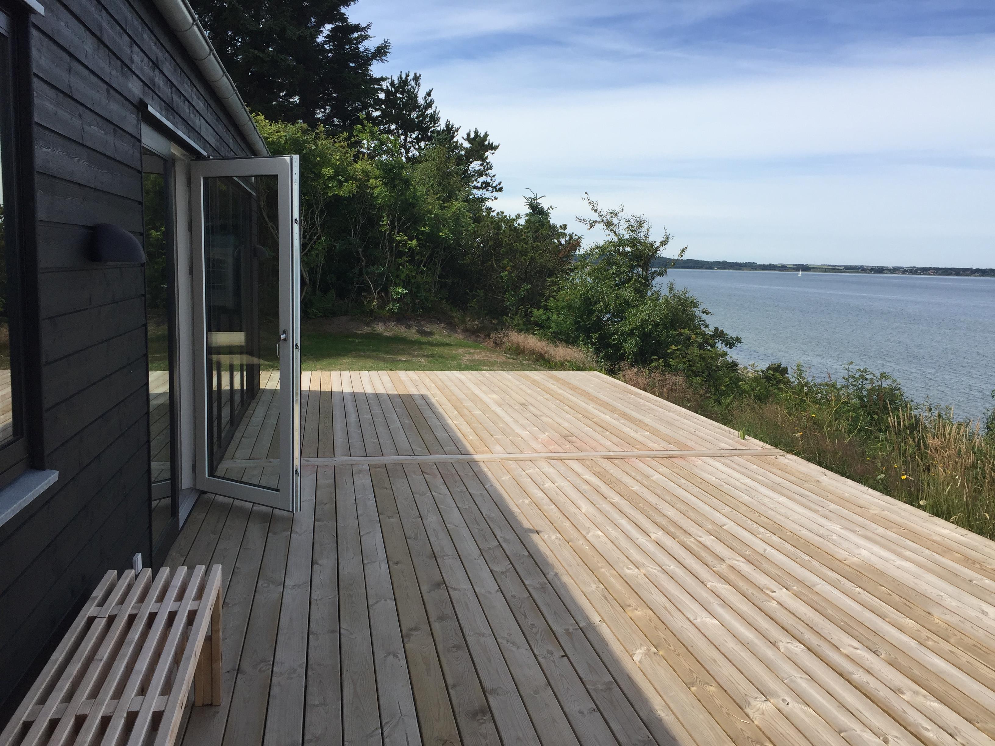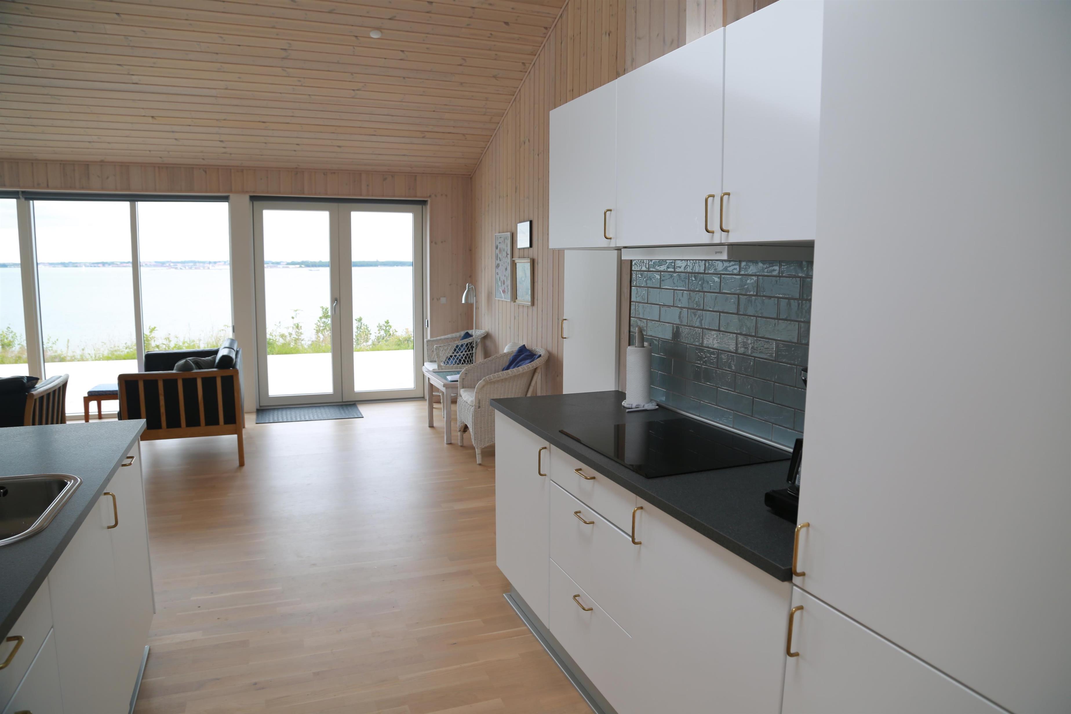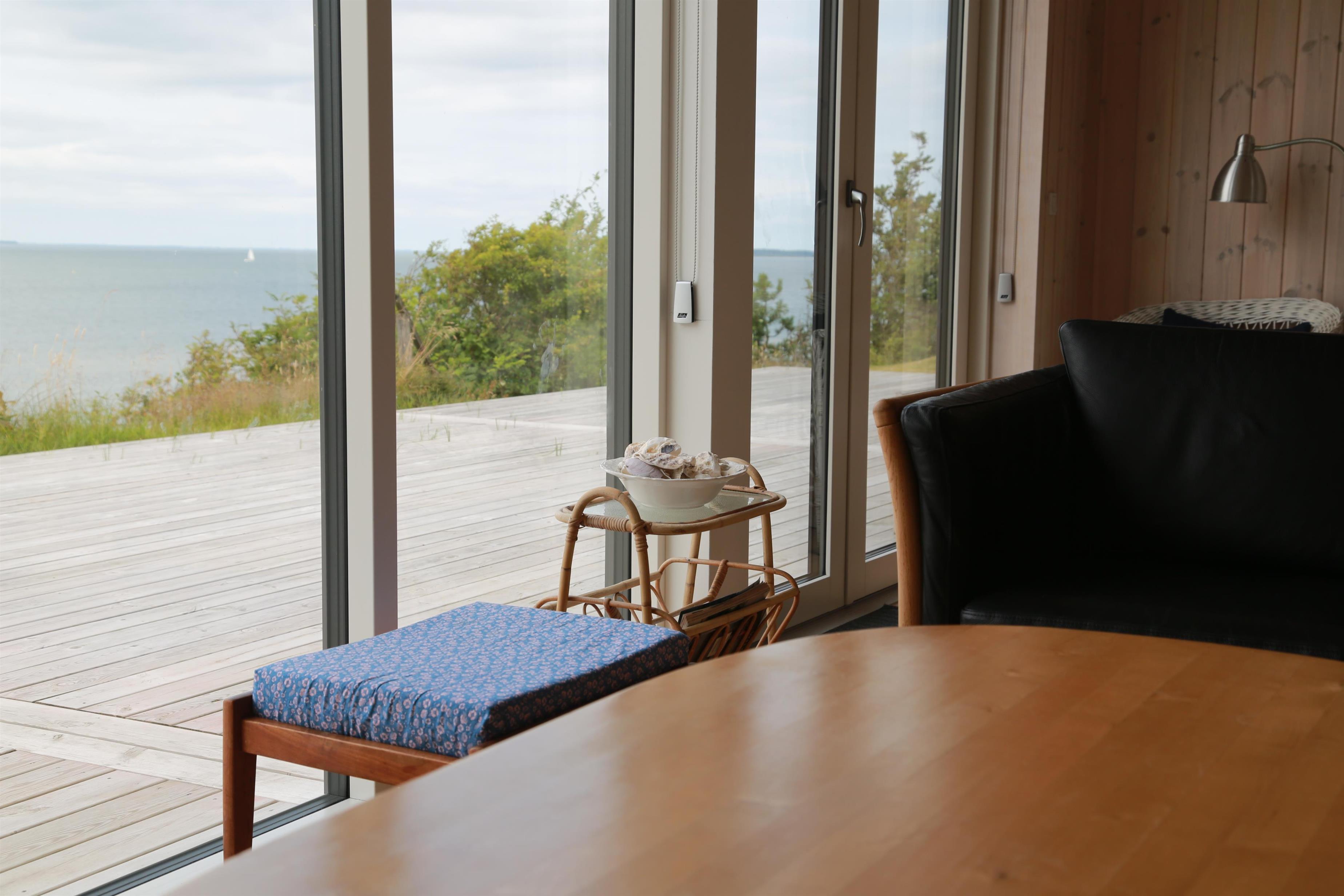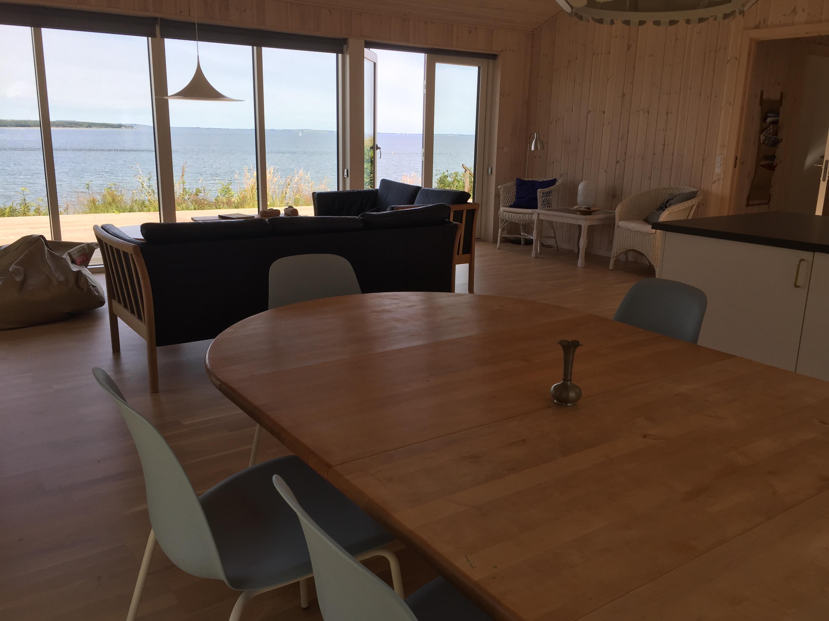 Stor kombineret køkken / spise og opholdsstue, hvor man kan nyde udsigten. Der er stor træterrasse rundt om huset og efter en dukkert i Limfjorden, kan man blive skyllet af, under en udendørs bruser. Huset ligger fredeligt, så er man til ro, fred og idyl, er det her lige stedet. Det egner sig til voksne gæster, som sætter pris på fridage i smukke omgivelser.