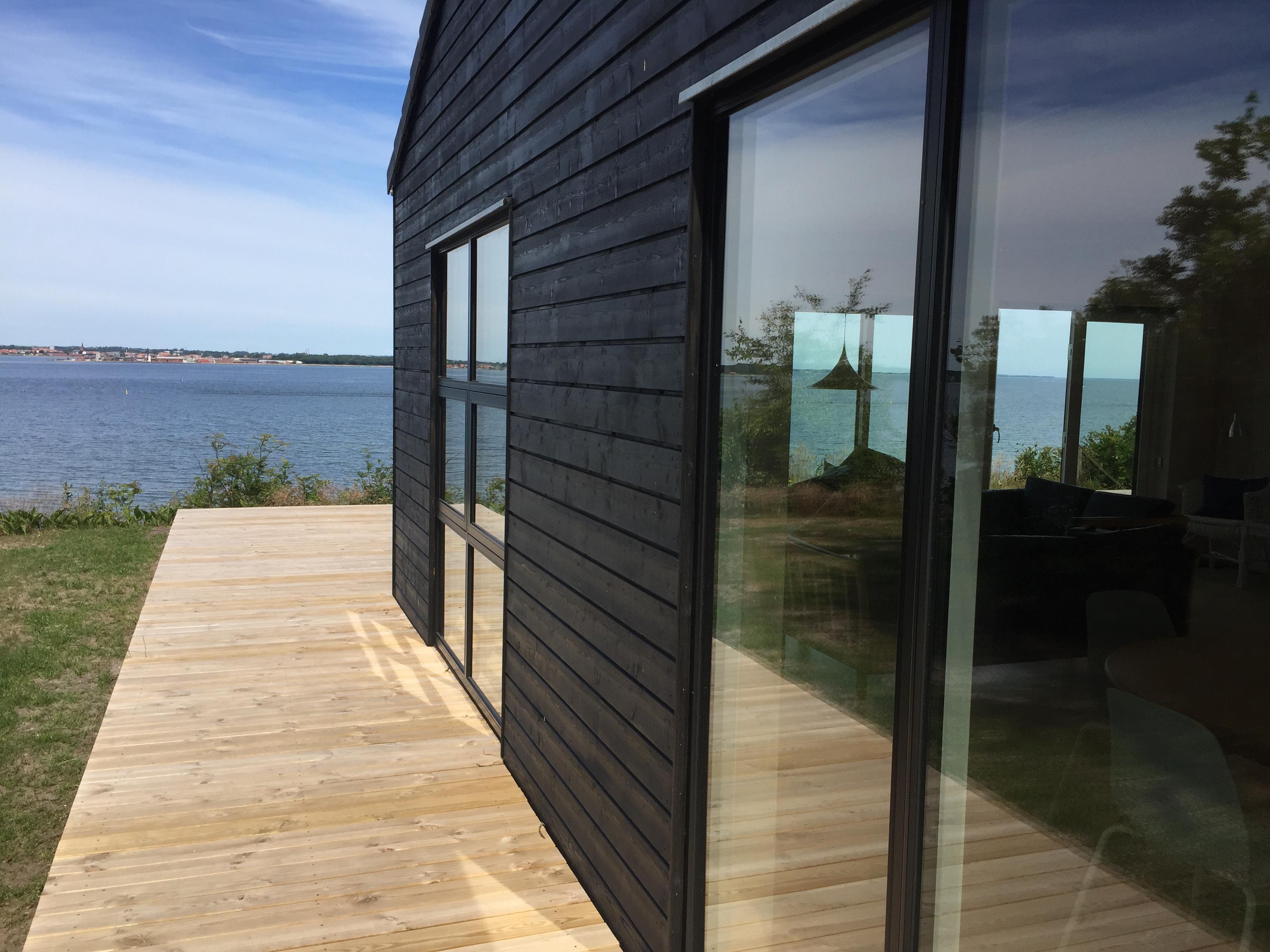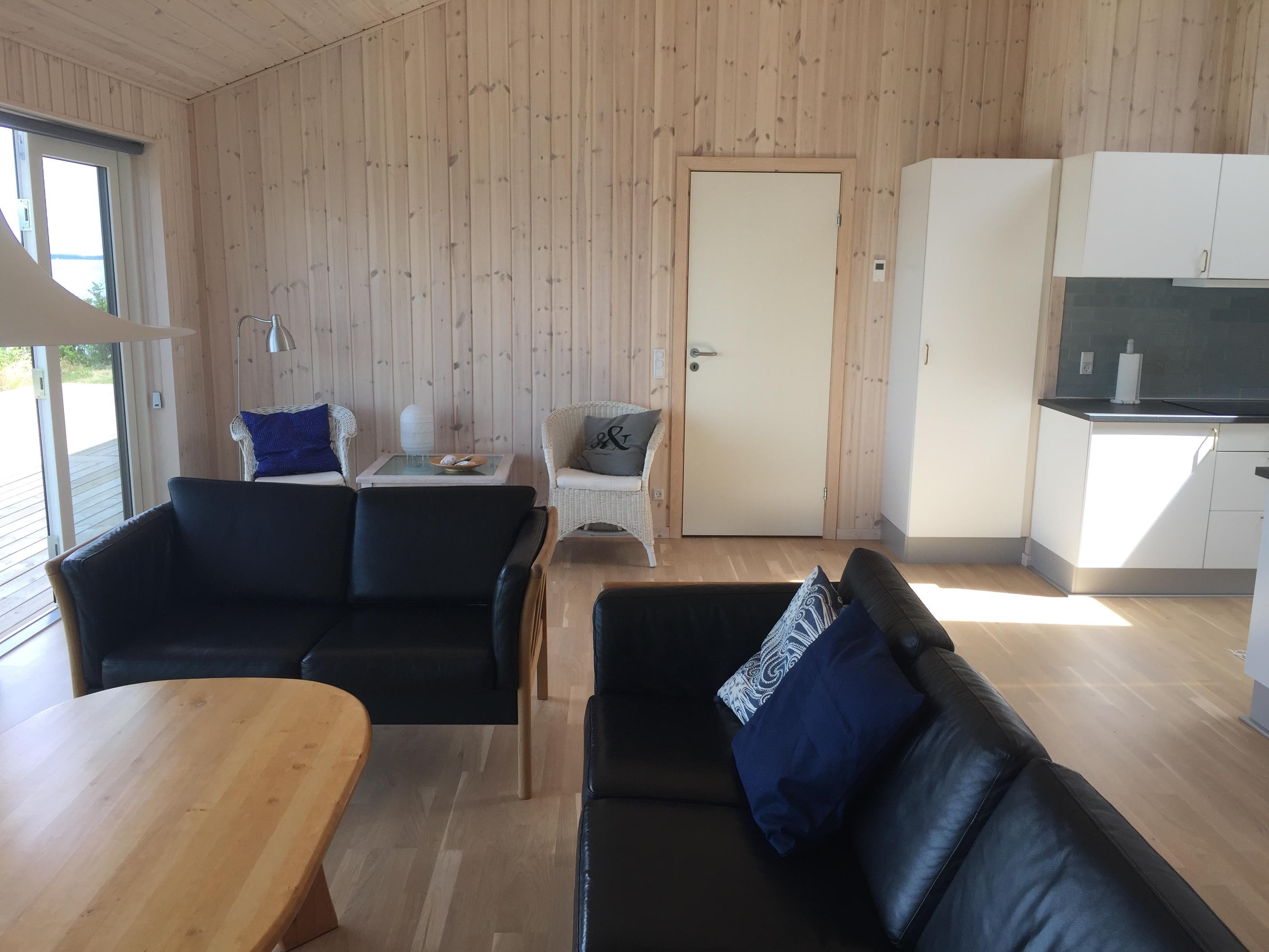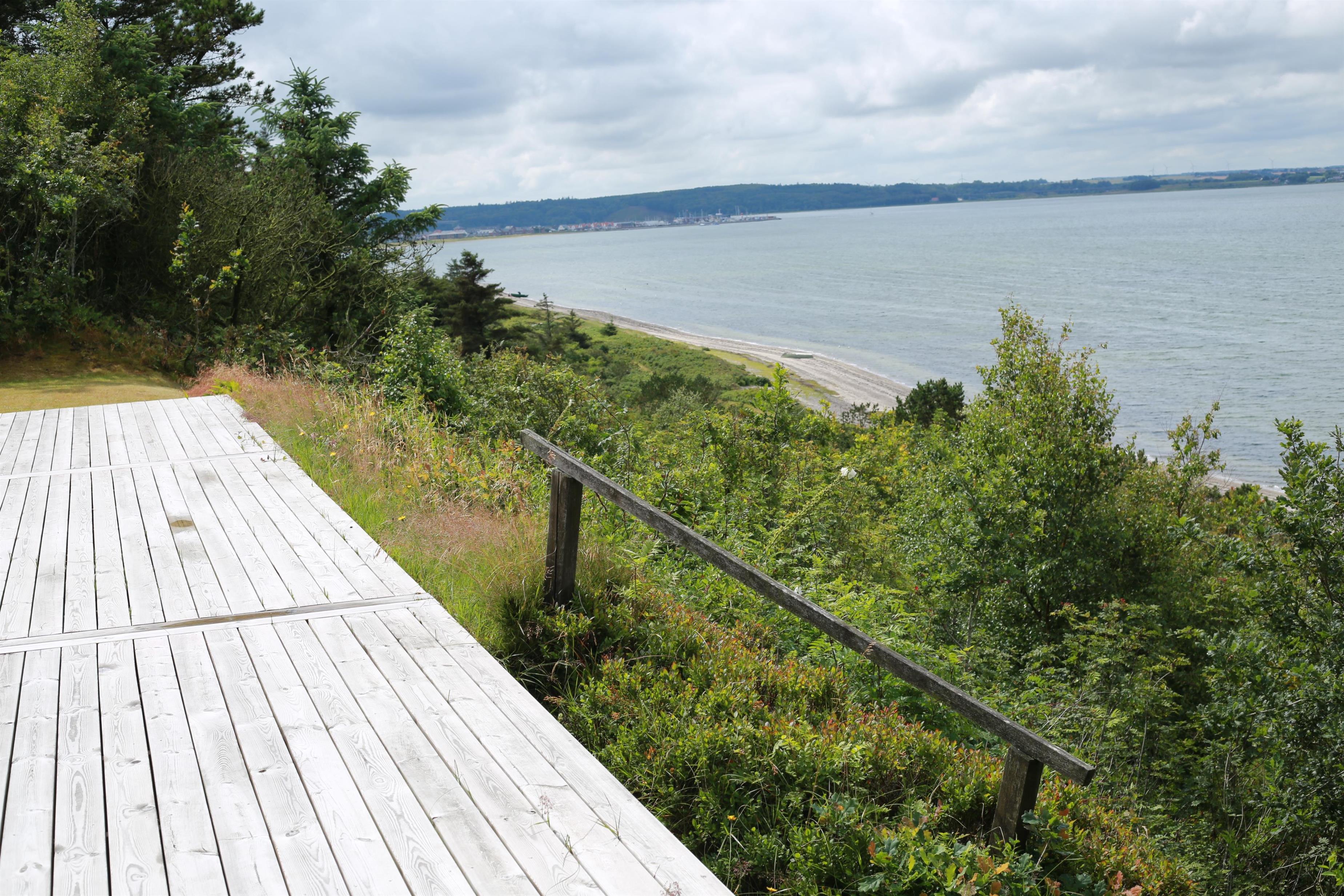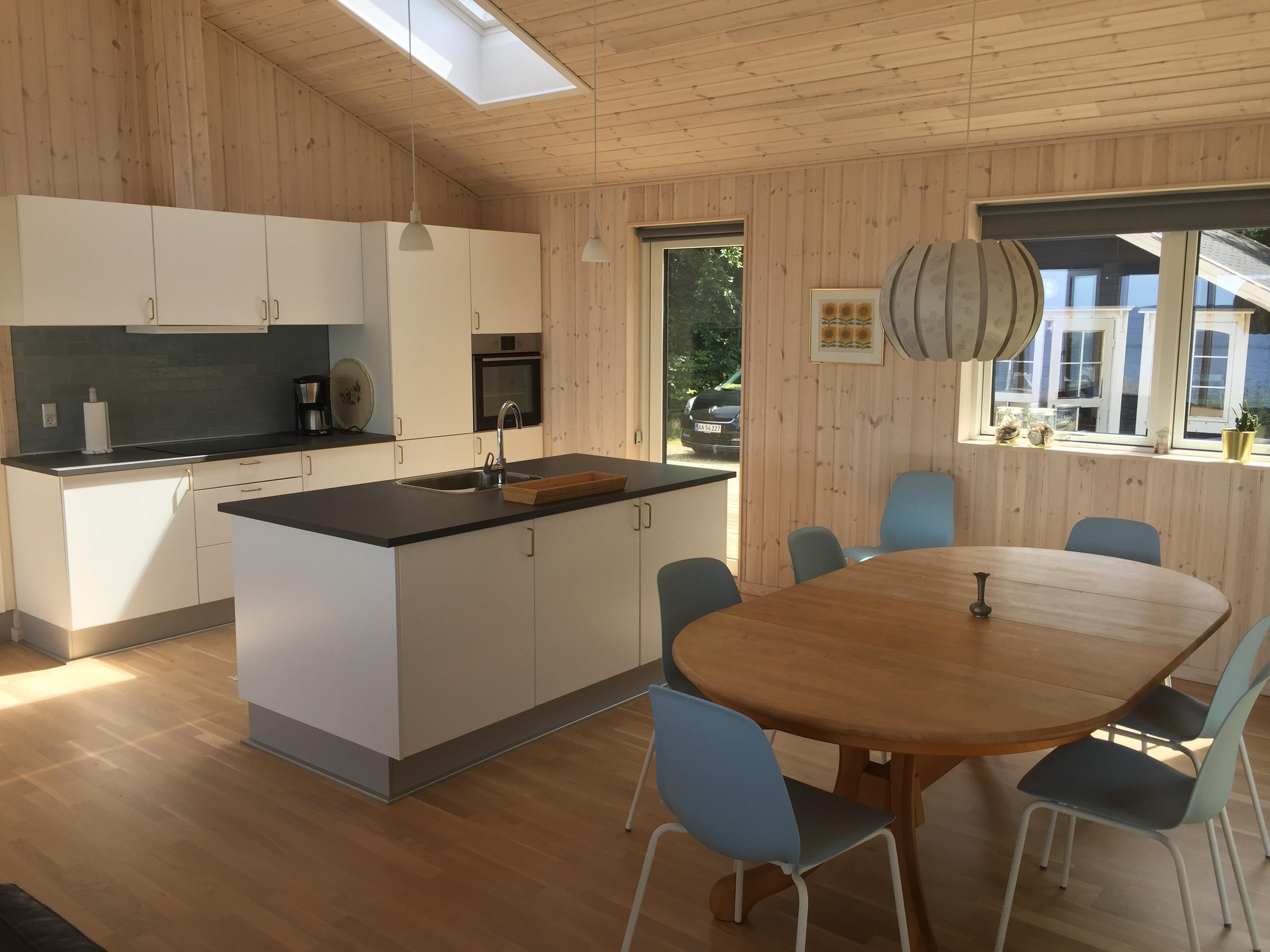 Stor kombineret køkken / spise og opholdsstue, hvor man kan nyde udsigten. Der er stor træterrasse rundt om huset og efter en dukkert i Limfjorden, kan man blive skyllet af, under en udendørs bruser. Huset ligger fredeligt, så er man til ro, fred og idyl, er det her lige stedet. Det egner sig til voksne gæster, som sætter pris på fridage i smukke omgivelser.