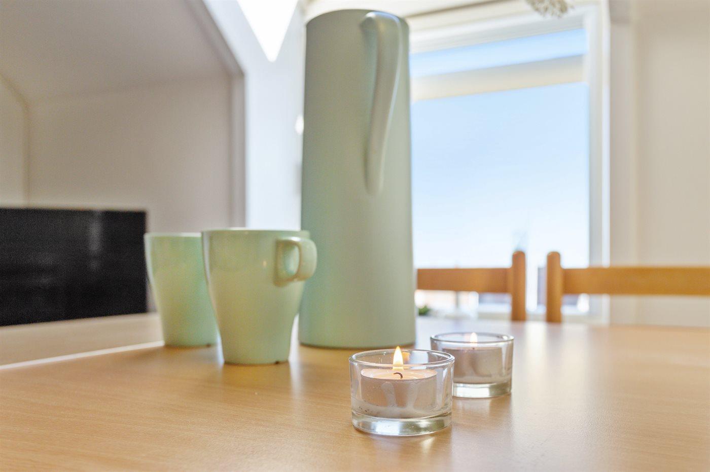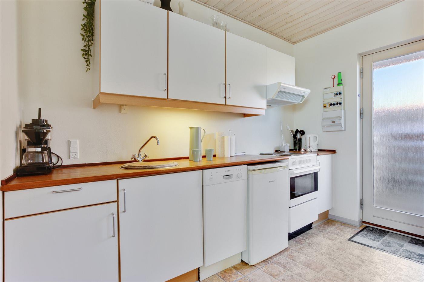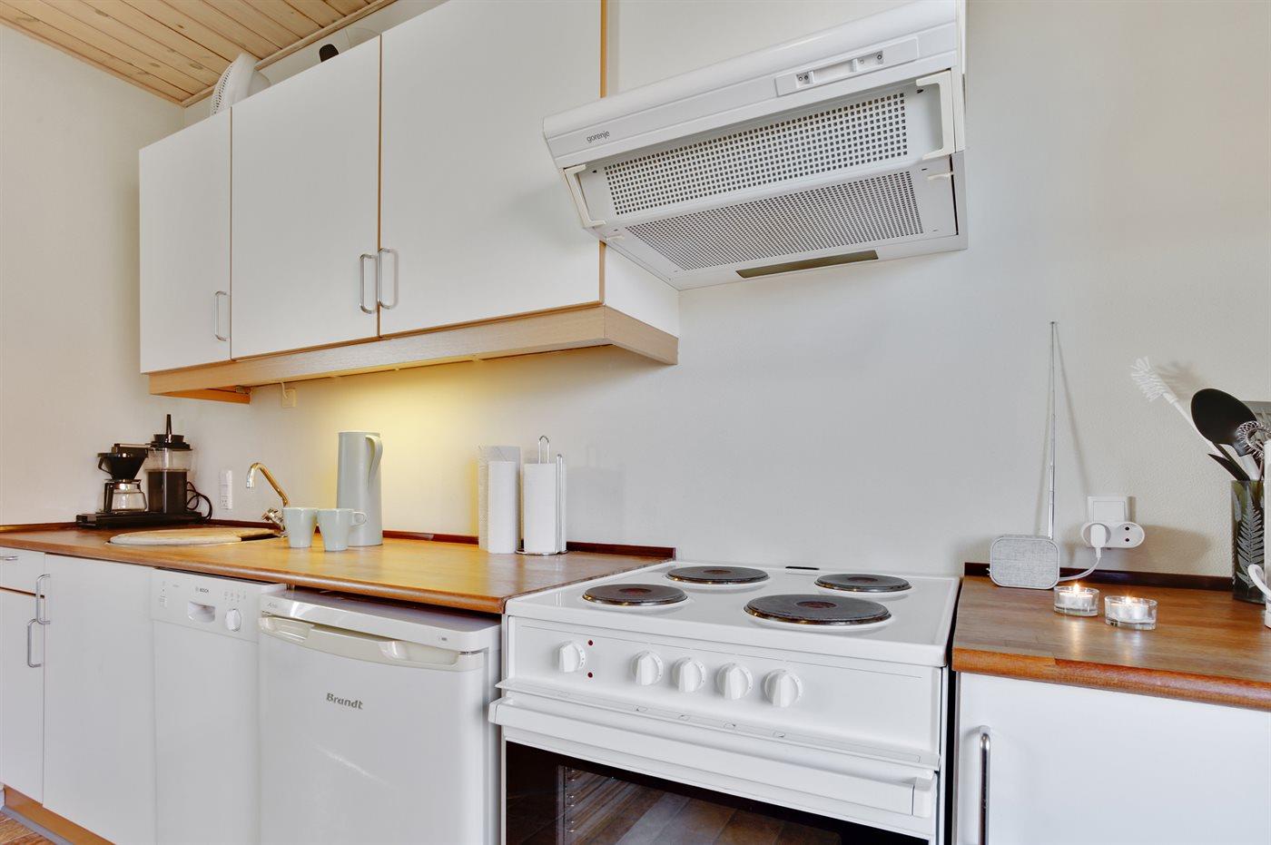 Køkkenet er udstyret med 1 køleskab. Der er 4 elkogeplader, varmluftovn samt opvaskemaskine.