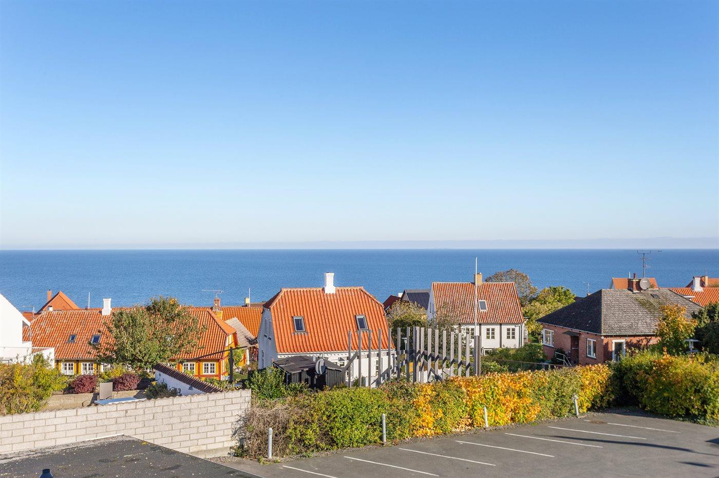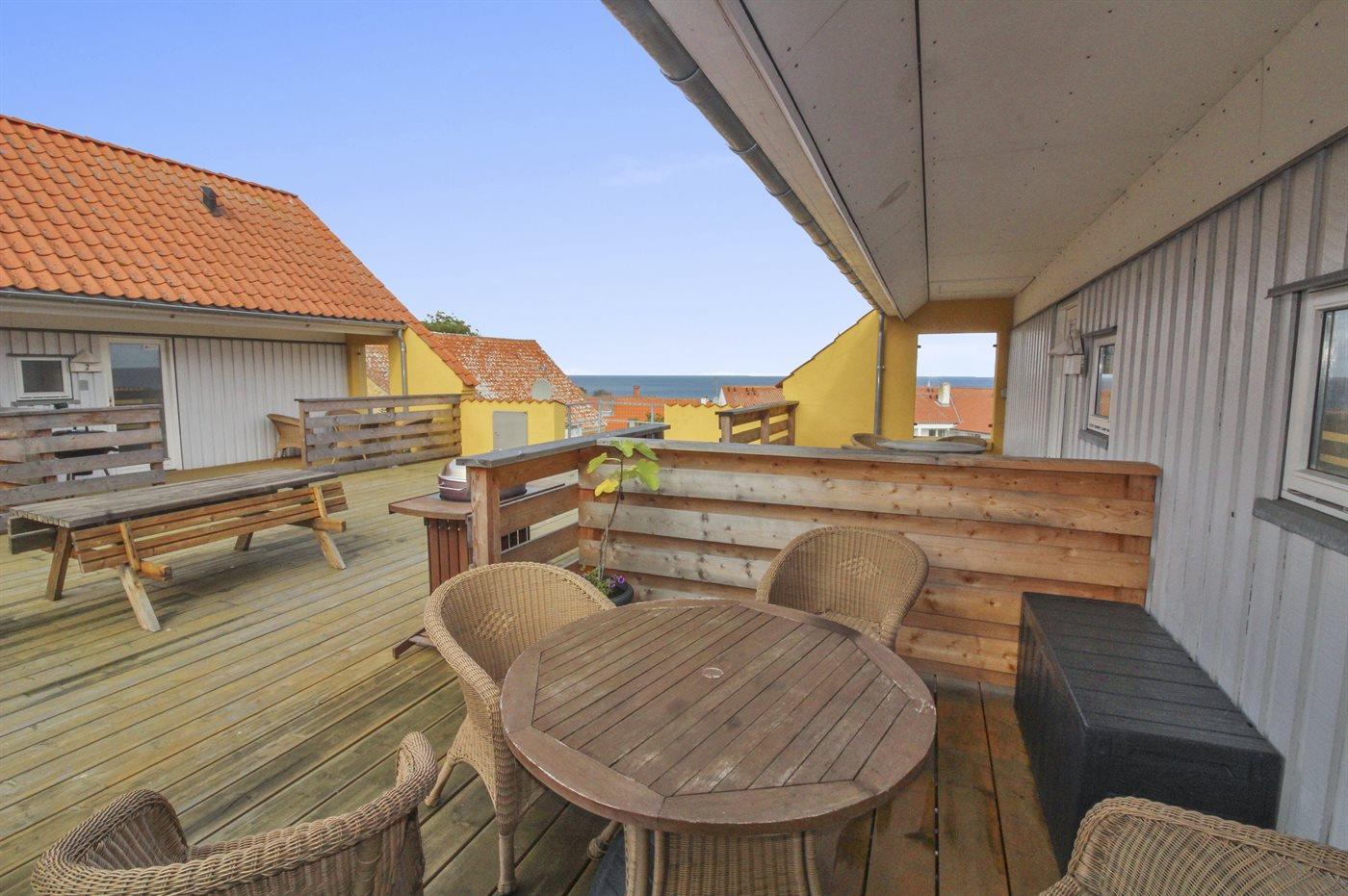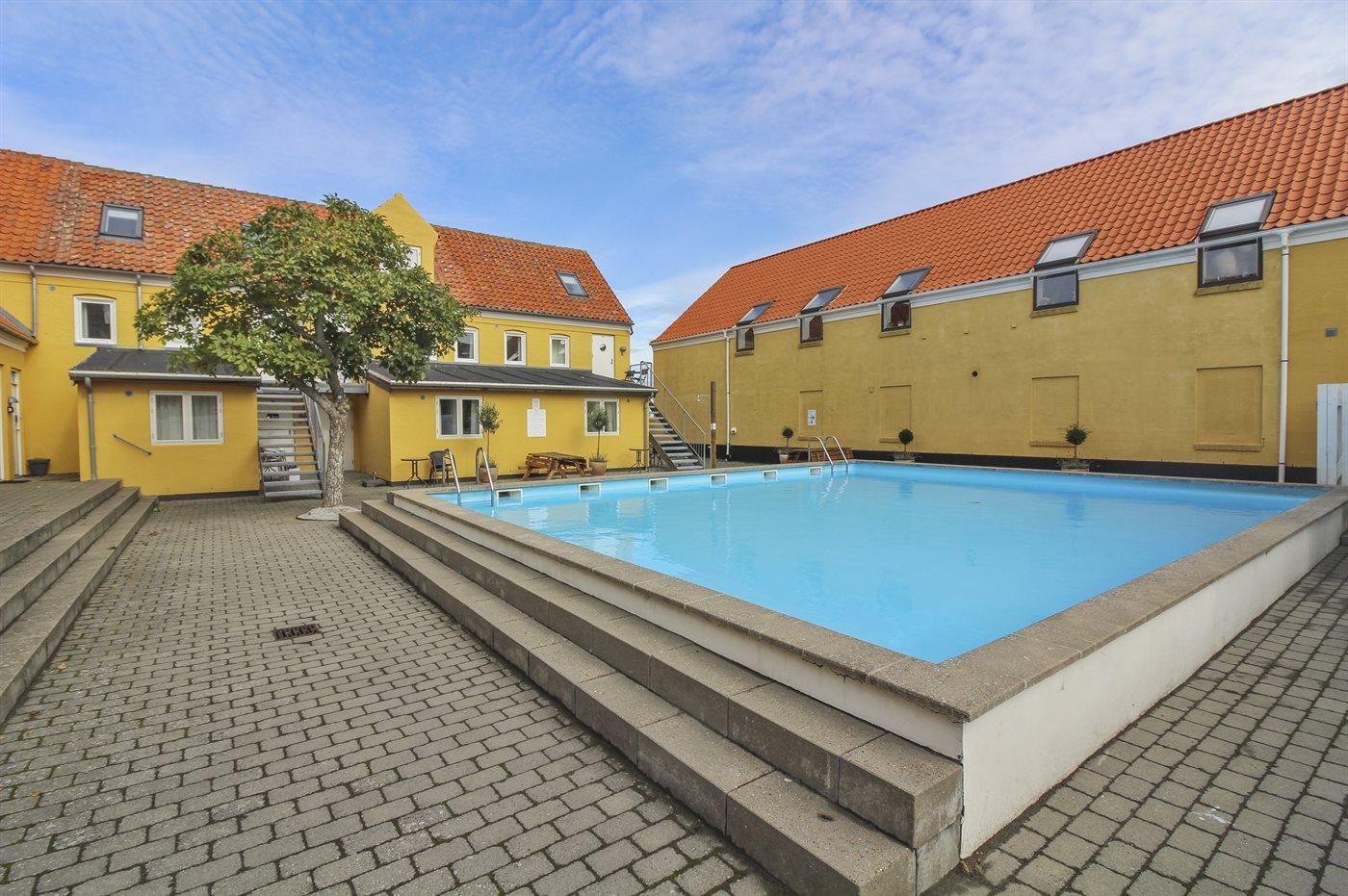 En lille, veldisponeret lejlighed på 1. sal med egen terrasse samt adgang til den store, fælles træterrasse, hvorfra der er den absolut skønneste udsigt over byens tage og panoramaudsigt over Østersøen. Der findes en stor udendørs swimmingpool i Købmandsgårdens flisebelagte gård. Poolen er ikke opvarmet og er åben 1. juni - 30. september.