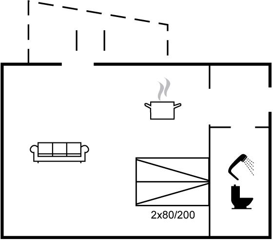 2 sovepladser i dobbeltseng. Disse 2 sovepladser befinder sig i stuen.
