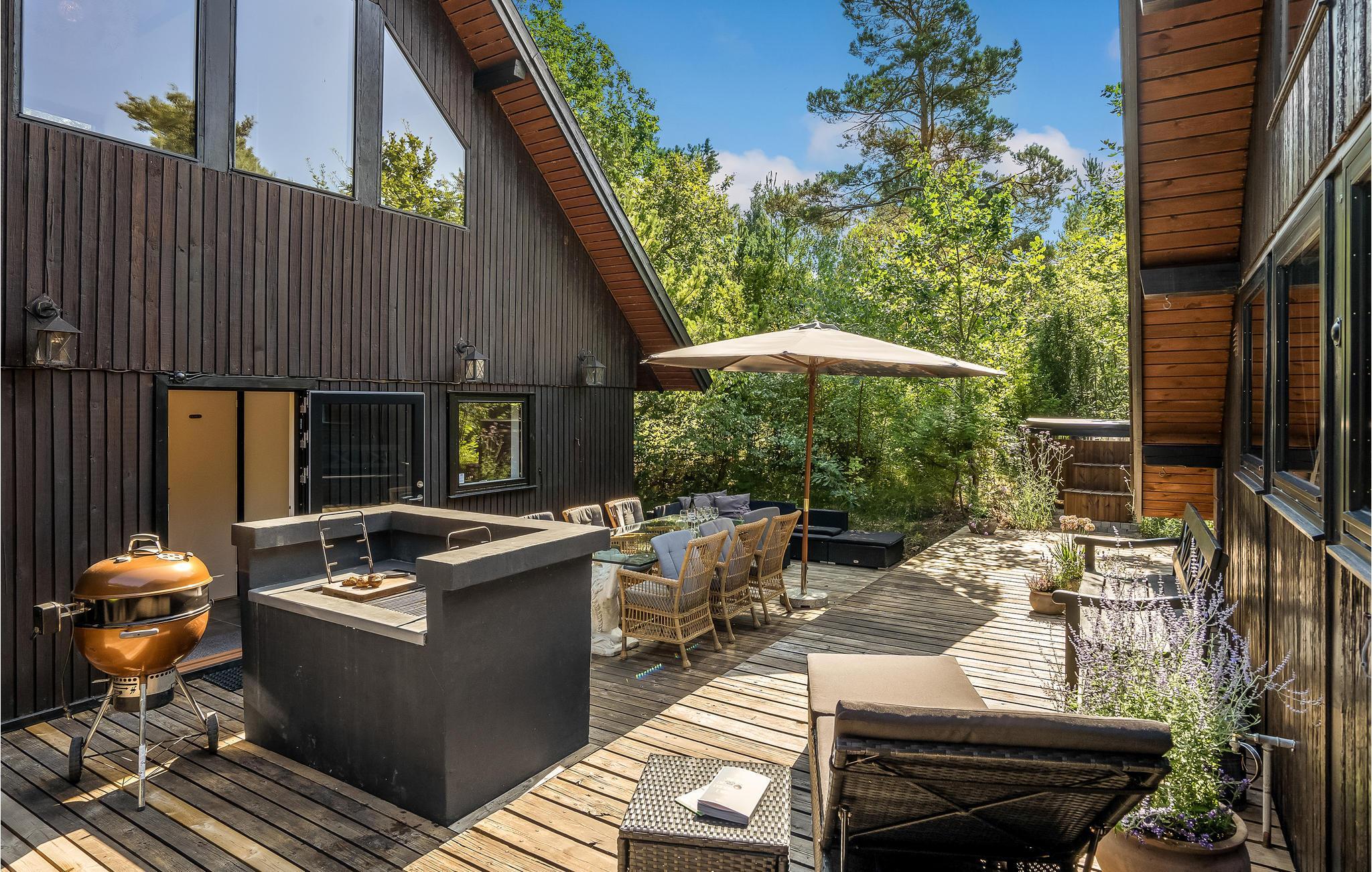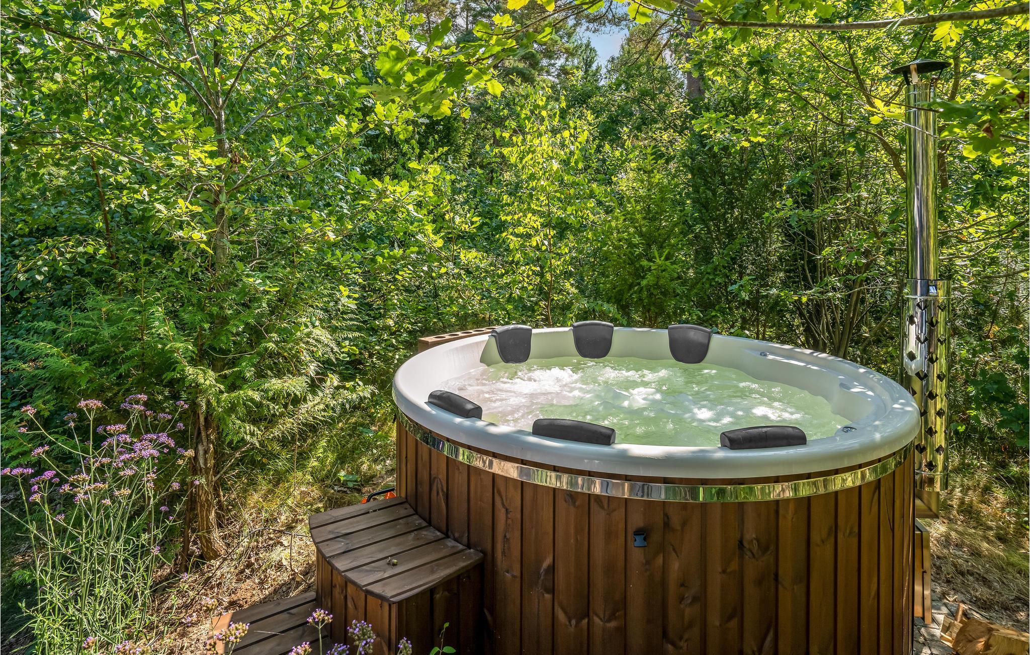 Hele herligheden er placeret på en 1400 m2 stor naturgrund. Der er brændefyret vildmarksbad/HotTub til 8 personer, og trænger I til at køle ned, er der også et koldtvandskar. Huset er beliggende i rolige omgivelser, men blot 10 minutters kørsel fra golfbaner, put and take-søer, hyggelige kroer og mange gallerier. Tilbring mange skønner timer på stranden, med et sandkorn som den største sten. Der er livredder i højsæsonen. På cafeen HavEje kan man nyde burgere og is i særklasse.