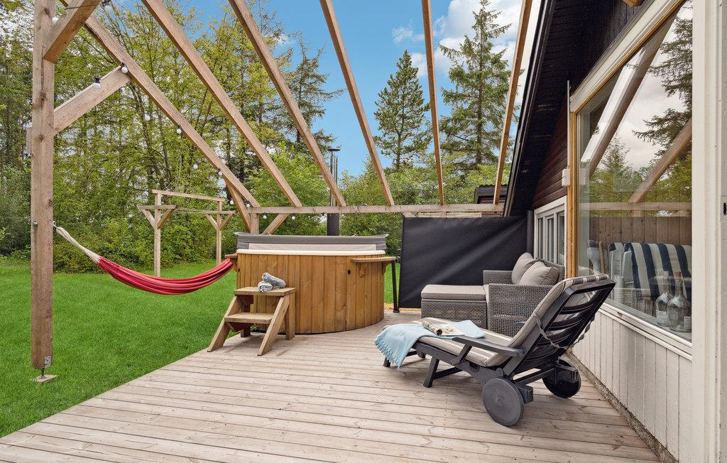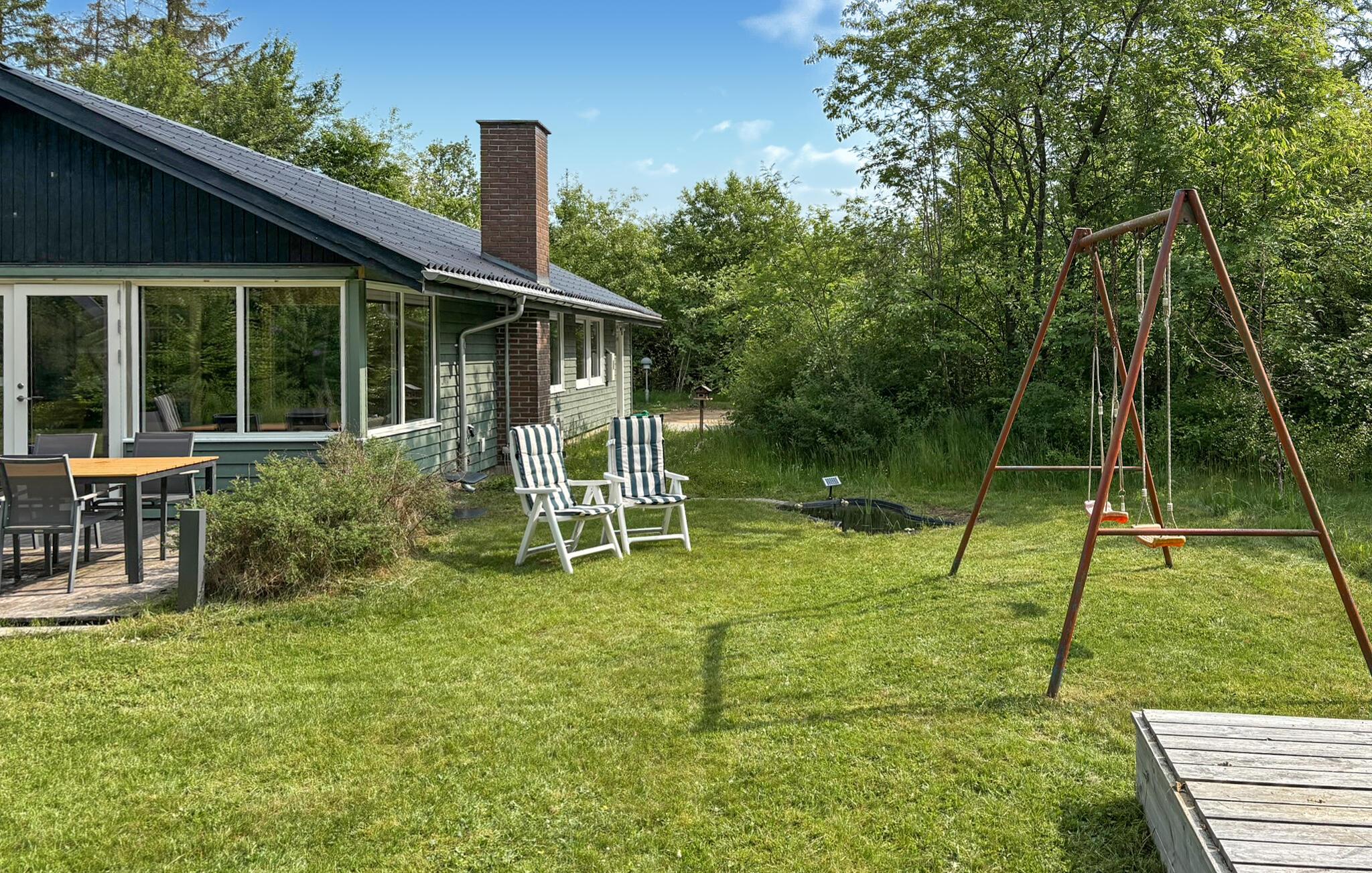 I naturskønne Guldforhoved, ikke langt fra Bording, indbyder dette feriehus til en ferie med mange aktiviteter i naturen. Omgivet af grønne træer og buske, lover huset ro og fred. Indenfor bærer det præg af en varm stemning takket være de lyse træpaneler, vinduerne og den hyggelige indretning. Glæd jer til fælles måltider i en hjemlig atmosfære eller underholdende spilleaftener ved spisebordet med udsigt til det grønne. Efter en begivenhedsrig dag kan I slappe af i sofahjørnet, se en film eller hyggesludre over en kop aftenkaffe. Nyd solen i haven og lækre måltider fra grillen på terrassen. Her finder I også vildmarksbadet, hvor I kan slappe af sammen.