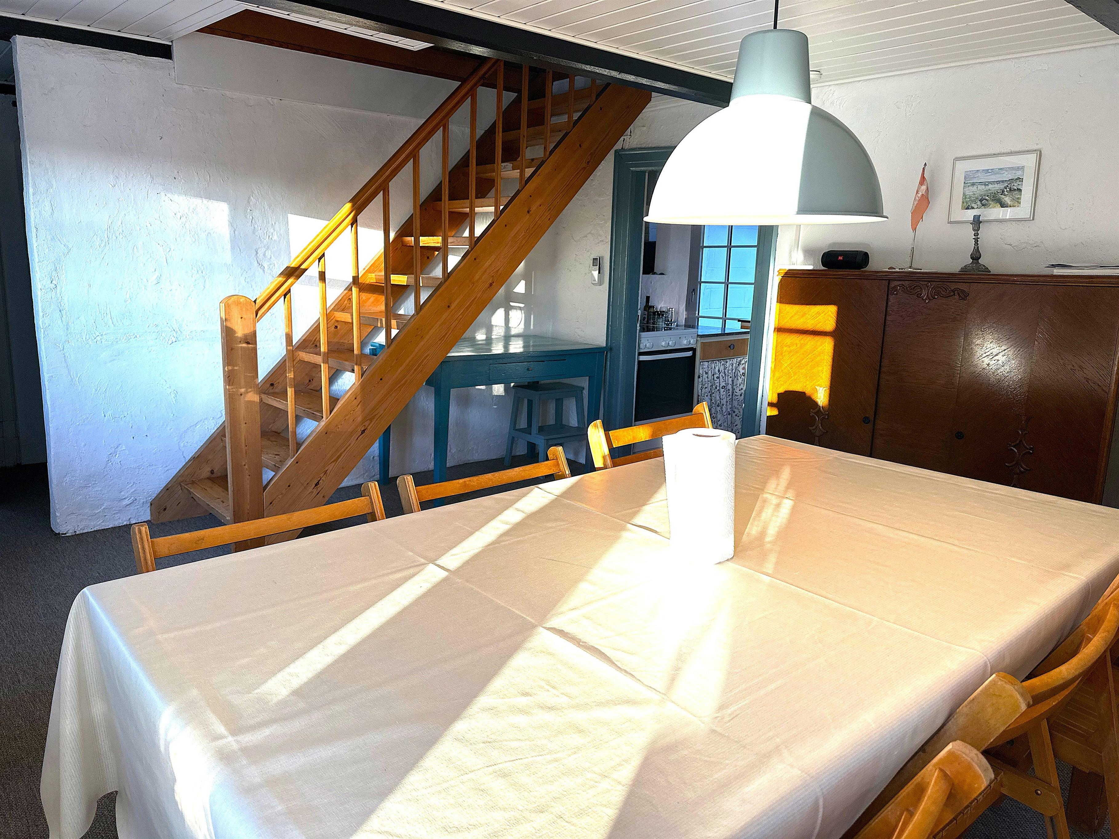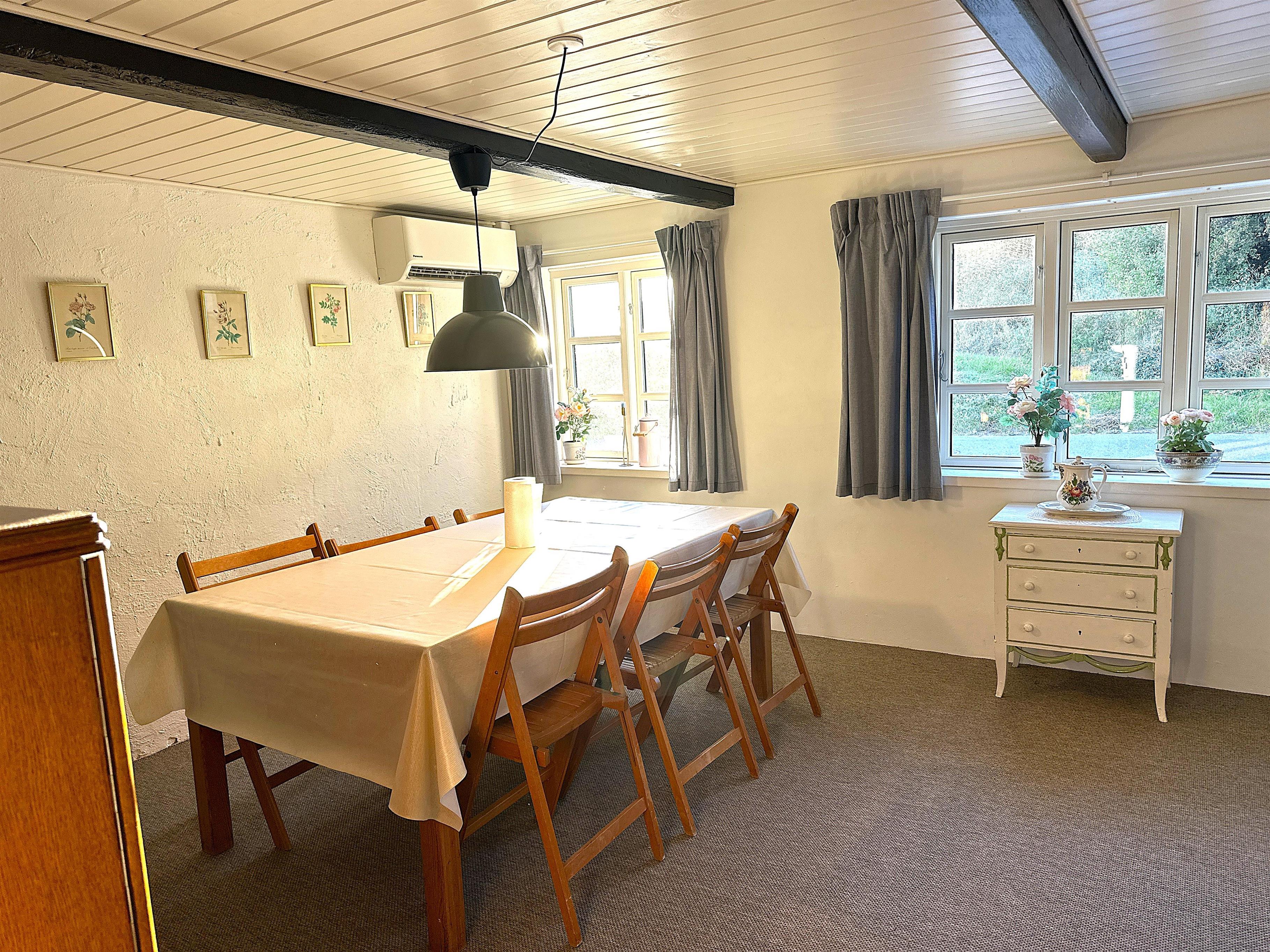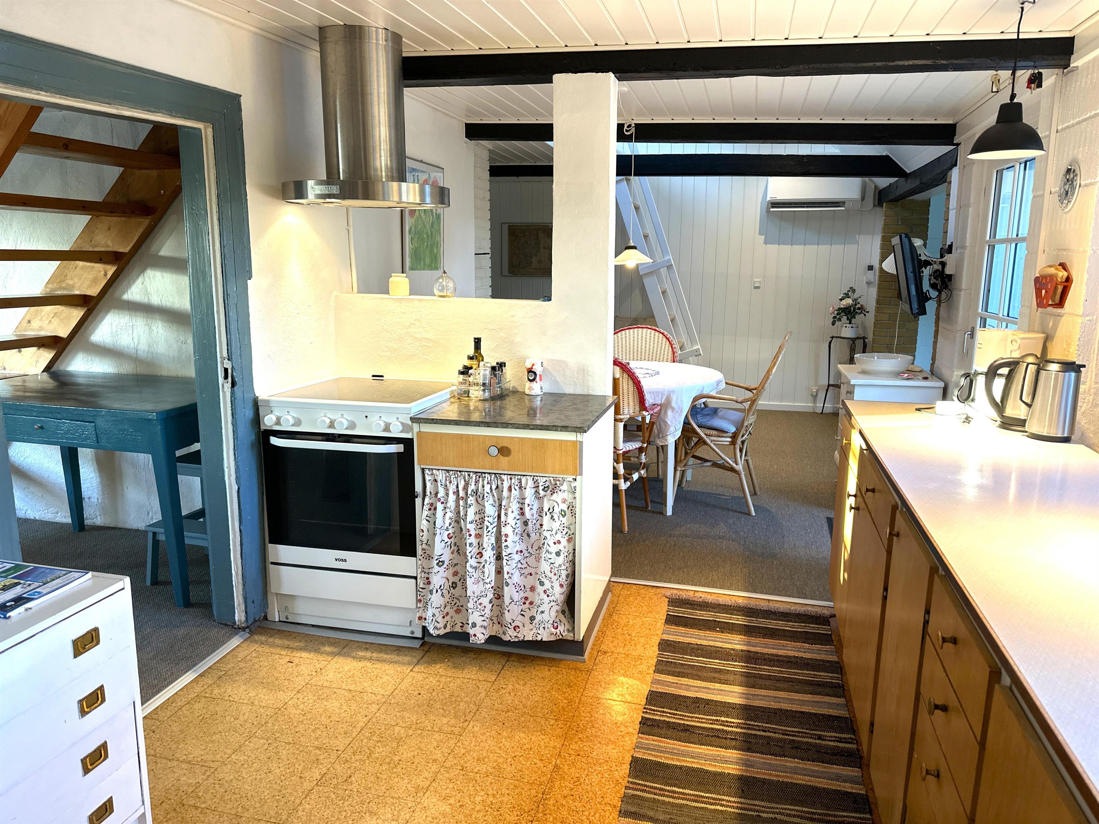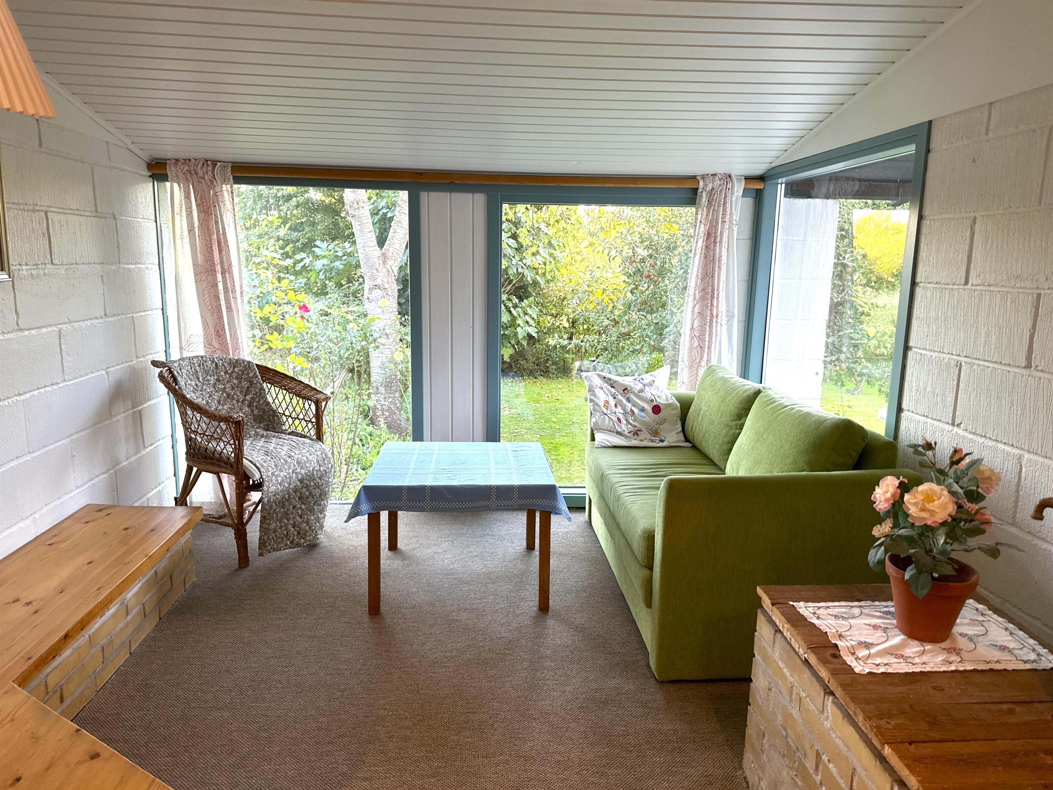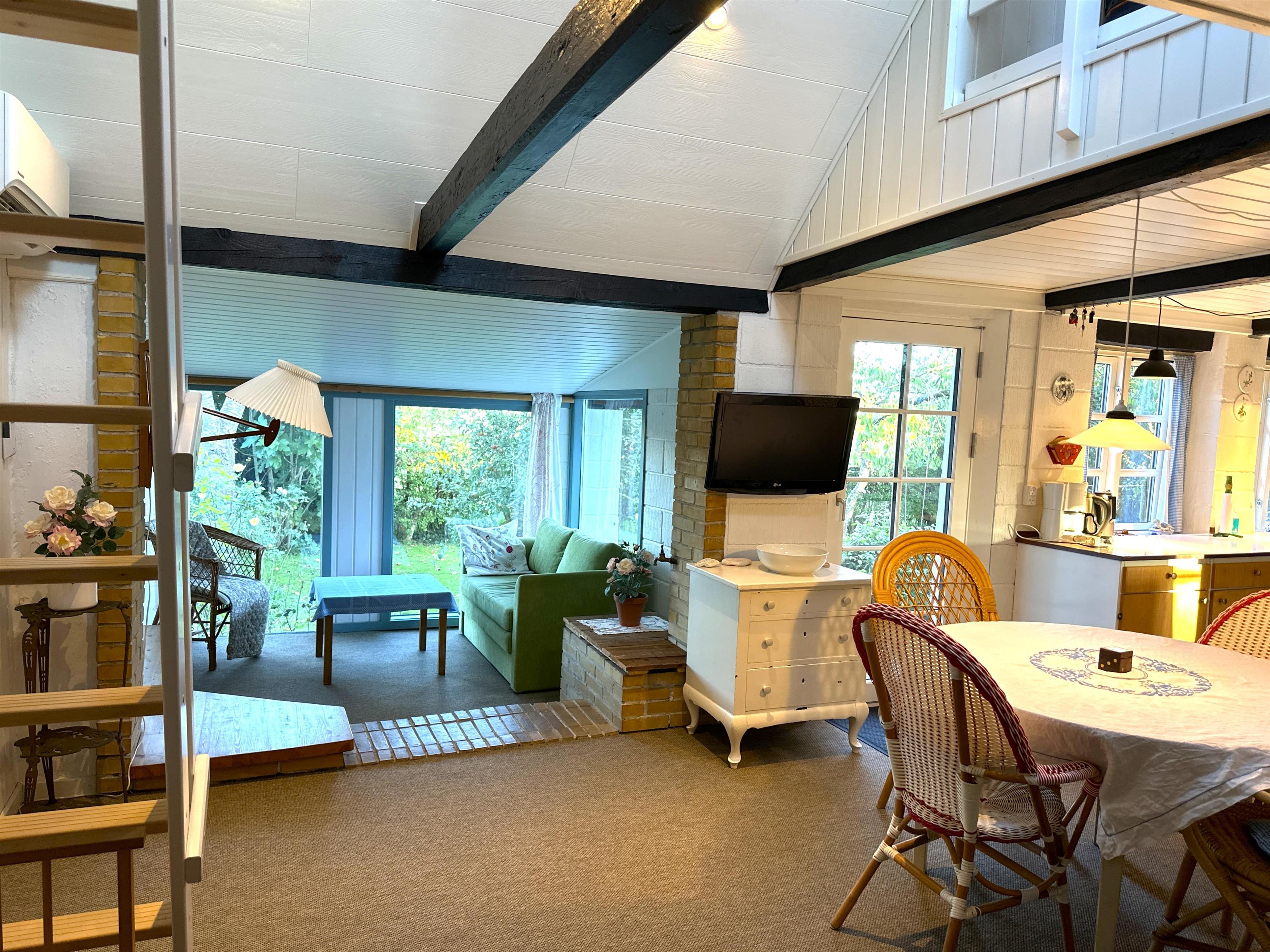 Når man træder ind, mødes man af køkkenet og en stor spisestue, som danner rammen om måltider og samvær. Der er desuden en mindre spiseplads tæt på køkkenet, som er perfekt til stille morgenstunder eller kaffe om eftermiddagen. Havestuen, som er forbundet med alrummet, lukker lyset ind og gør huset lyst og indbydende også på dage med gråvejr. Der er to soveværelser – ét med dobbeltseng og ét med to enkeltsenge – samt en hems med to ekstra enkeltsenge. Badeværelset indeholder badekar og mulighed for bruser, så man kan vælge efter stemning og vejrlig.