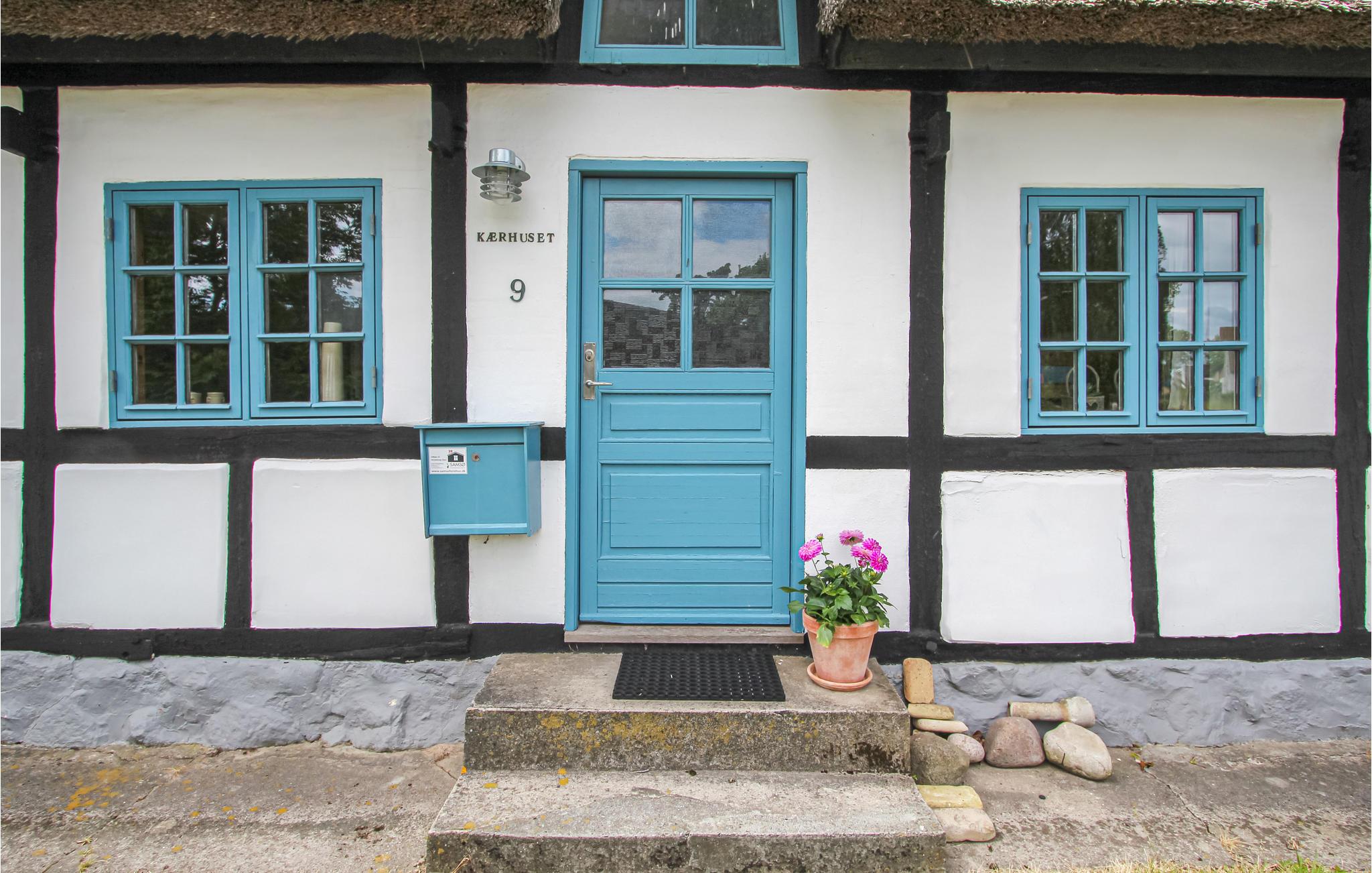 I dette charmerende bindingsværkshus med stråtag på Samsø venter en hyggelig familieferie med terrasse og brændeovn.